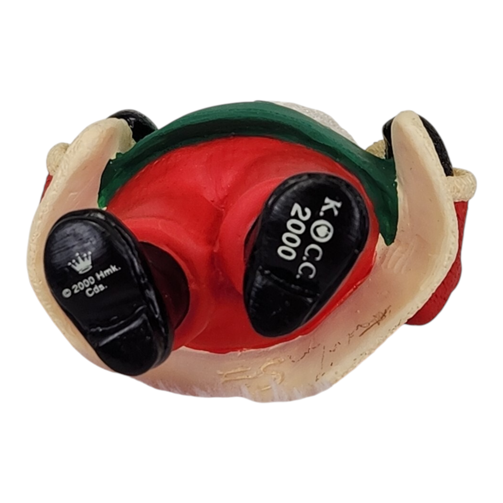 This special-edition 2000 ornament from the Hallmark Keepsake line is titled The Proud Collector. It is an exclusive piece released for members of the Keepsake Ornament Collector’s Club, featuring a Santa Claus figure wearing a green polo shirt emblazoned with “Hallmark Keepsake Ornaments,” a black jacket, and standing on a wooden-style display base. The ornament conveys a playful yet celebratory nod to collectors, making it particularly appealing to those who dedicate themselves to assembling Hallmark Keepsake sets.