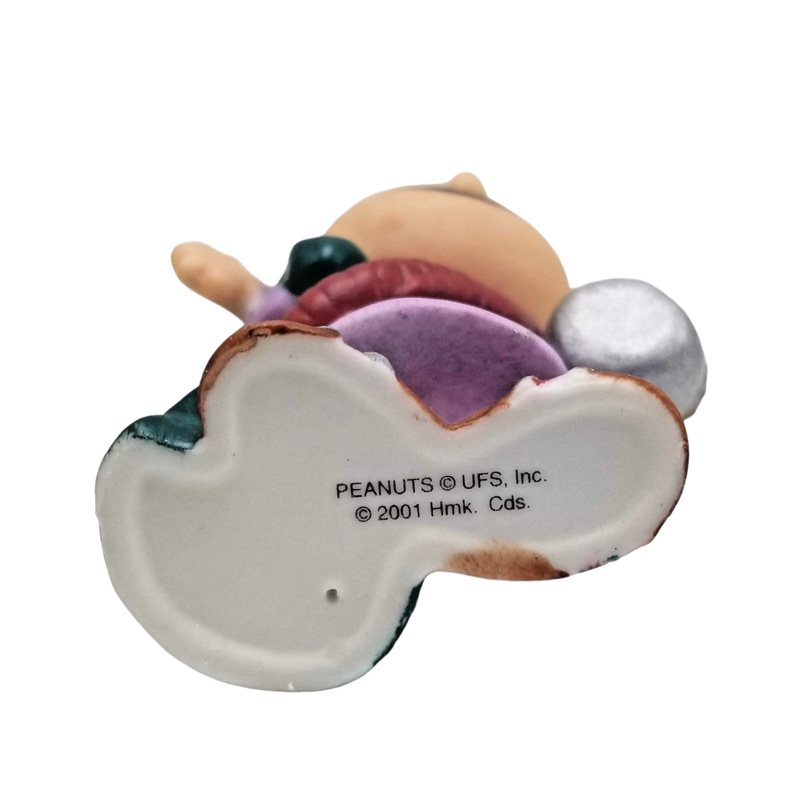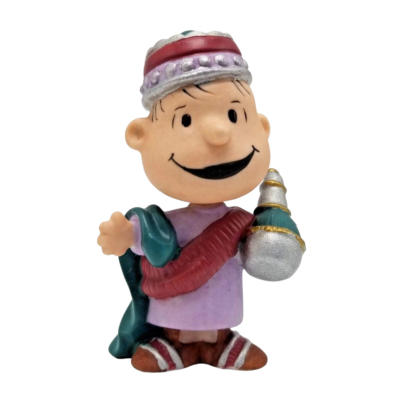 This 2001-dated collectible from the Hallmark Peanuts Gallery line features Linus of the Peanuts gang cast as one of the Three Wise Men, complete with ornate robe and symbolic gift. Crafted in fine porcelain and accented with rich detailing, the figurine presents a thoughtful blend of holiday nativity-theme and classic character charm. Its subtle collector appeal comes from combining nativity symbolism with beloved Peanuts characters—ideal for fans of either or both. The compact size makes it well-suited for display on a shelf or within a curated figurine collection.