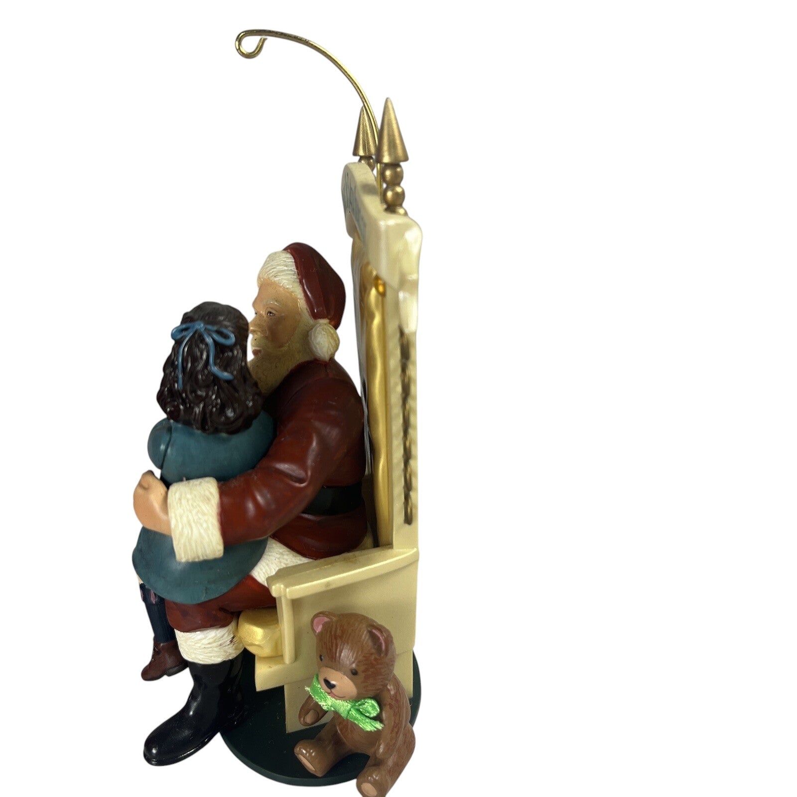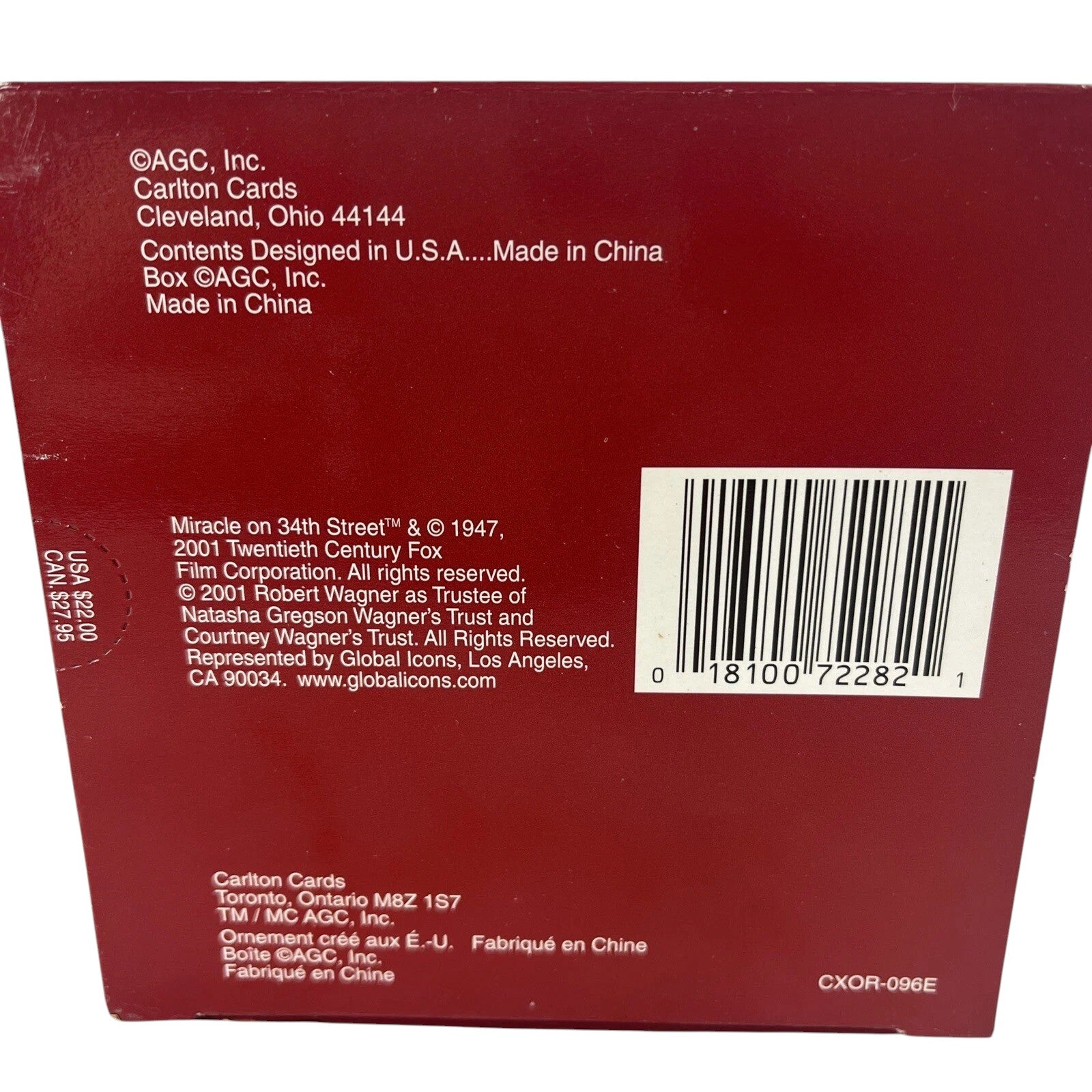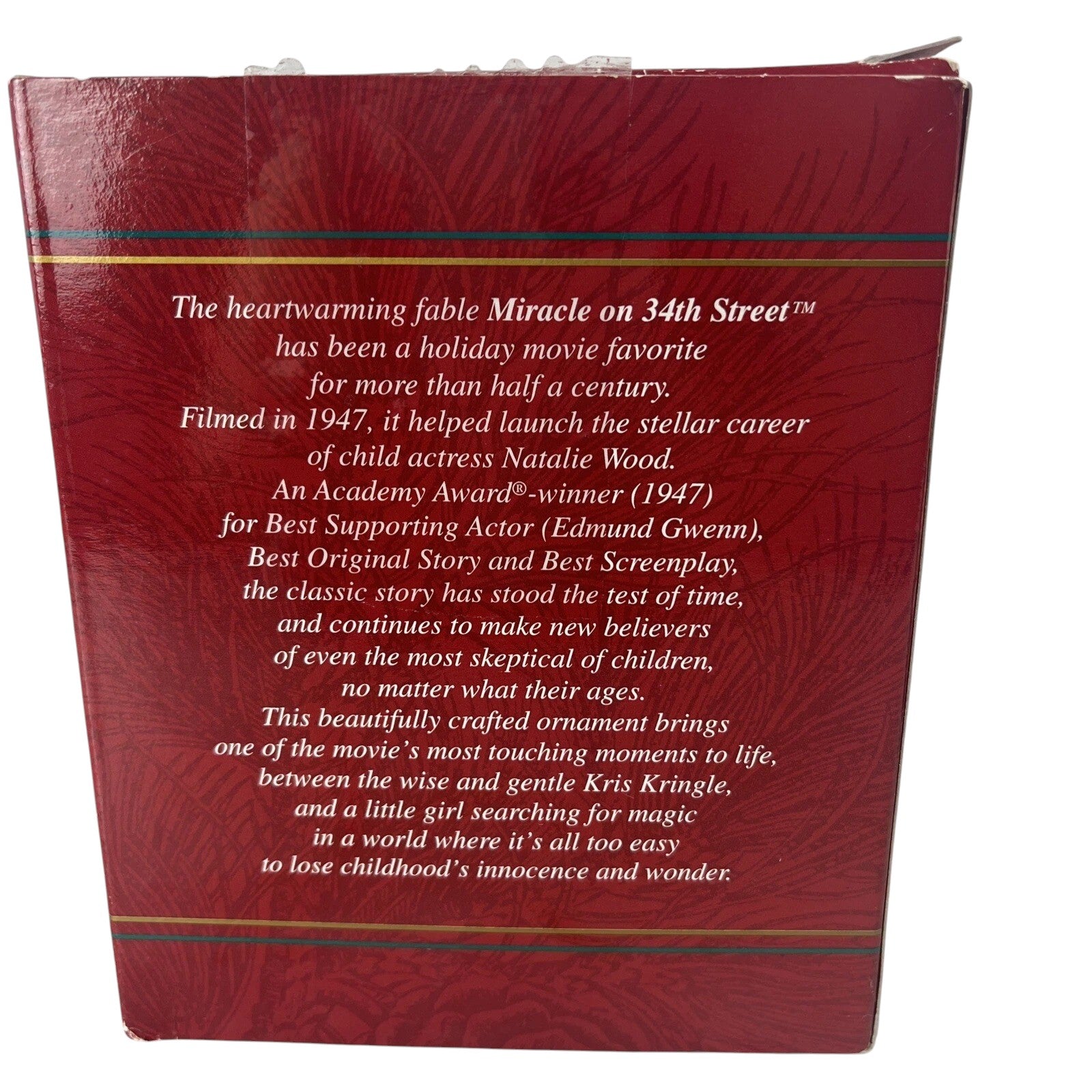 Celebrate a classic holiday film with this 2001 “Believe in Miracles – Miracle on 34th Street” ornament from the Carlton Cards Heirloom Collection. The ornament features an intricately detailed sculpt that evokes the beloved 1947 movie’s iconic Santa-and-Natalie-Wood scene, rendered in multi-colour painted plastic with fine detailing. Its licensed movie connection, clear year mark and variant SKU CXOR-096E make it a collectible standout for film-fans, ornament collectors and vintage holiday décor enthusiasts alike.