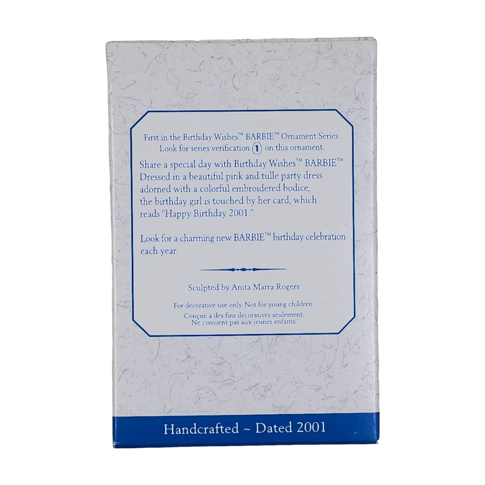 Celebrate a special milestone with this charming 2001 Hallmark Keepsake Birthday Wishes Barbie. The ornament features Barbie dressed in an elegant pink-party gown, holding a cake and gifts—a perfect tribute to commemorate birthdays. This collectible arrives mint-in-box with its original tag and insert, and requires no power—purely decorative and sentimental.