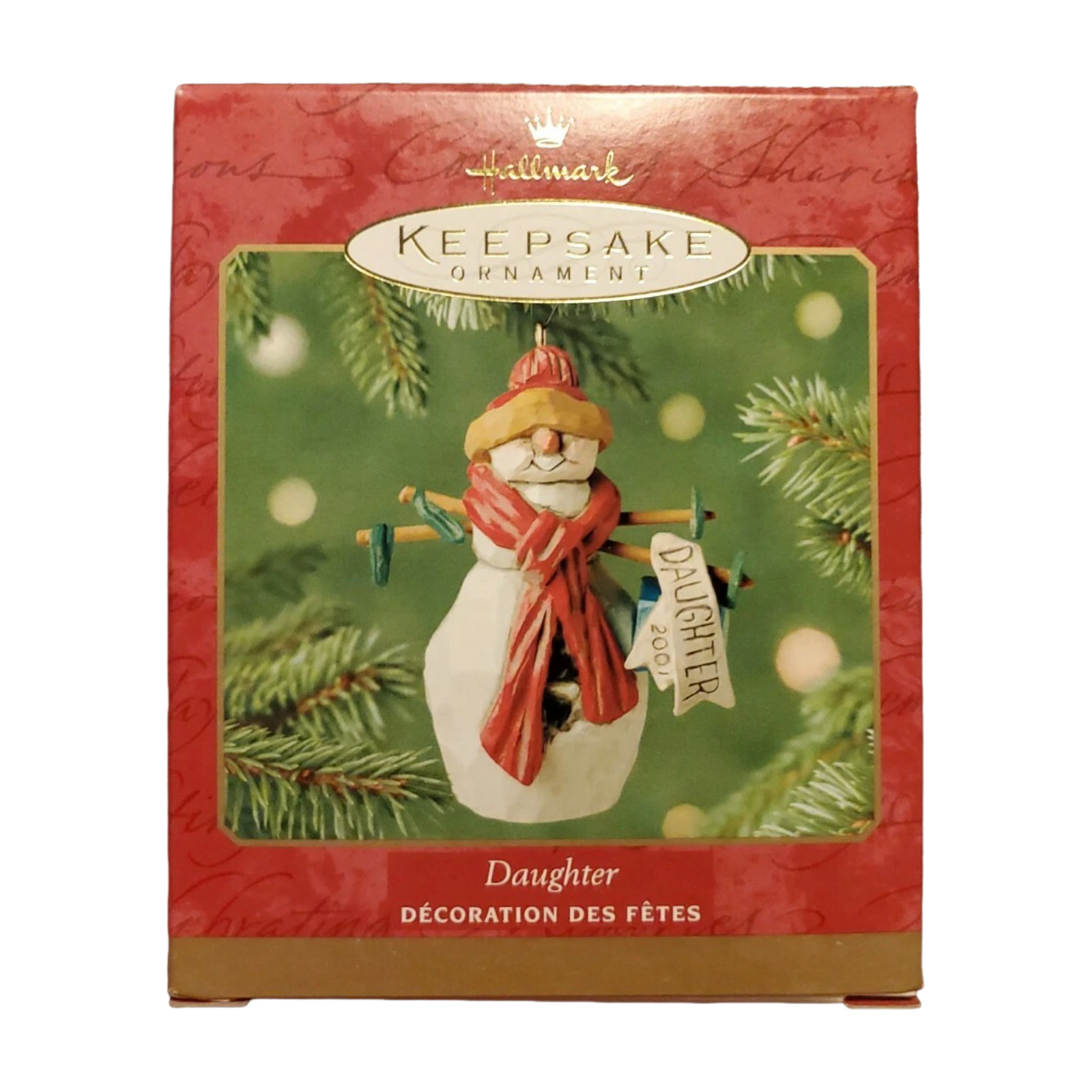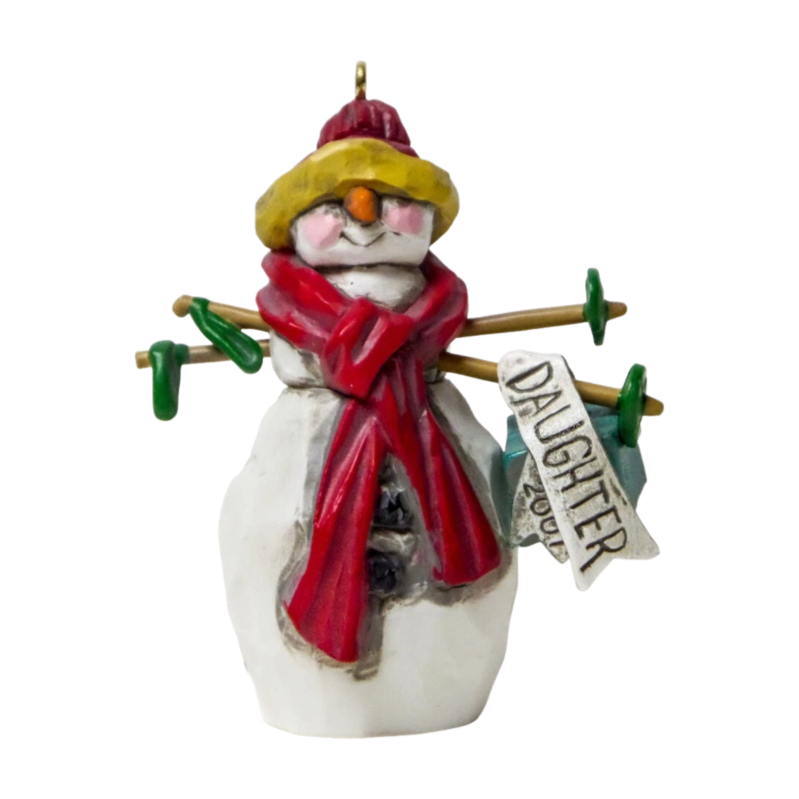 Celebrate the special bond of a daughter with this charming 2001 keepsake from Hallmark. The design features a cheerful snow-woman figure, bundled in a red hat and scarf, standing on skis and holding a blue gift box marked “2001”. Its vibrant winter palette and playful pose make it an engaging piece for any holiday tree. As a dated ornament from 2001, it holds sentimental value and appeal for collectors of family-themed keepsakes. With the clear inscription “Daughter” and the year, it’s a meaningful gift for daughters or those commemorating a family milestone.