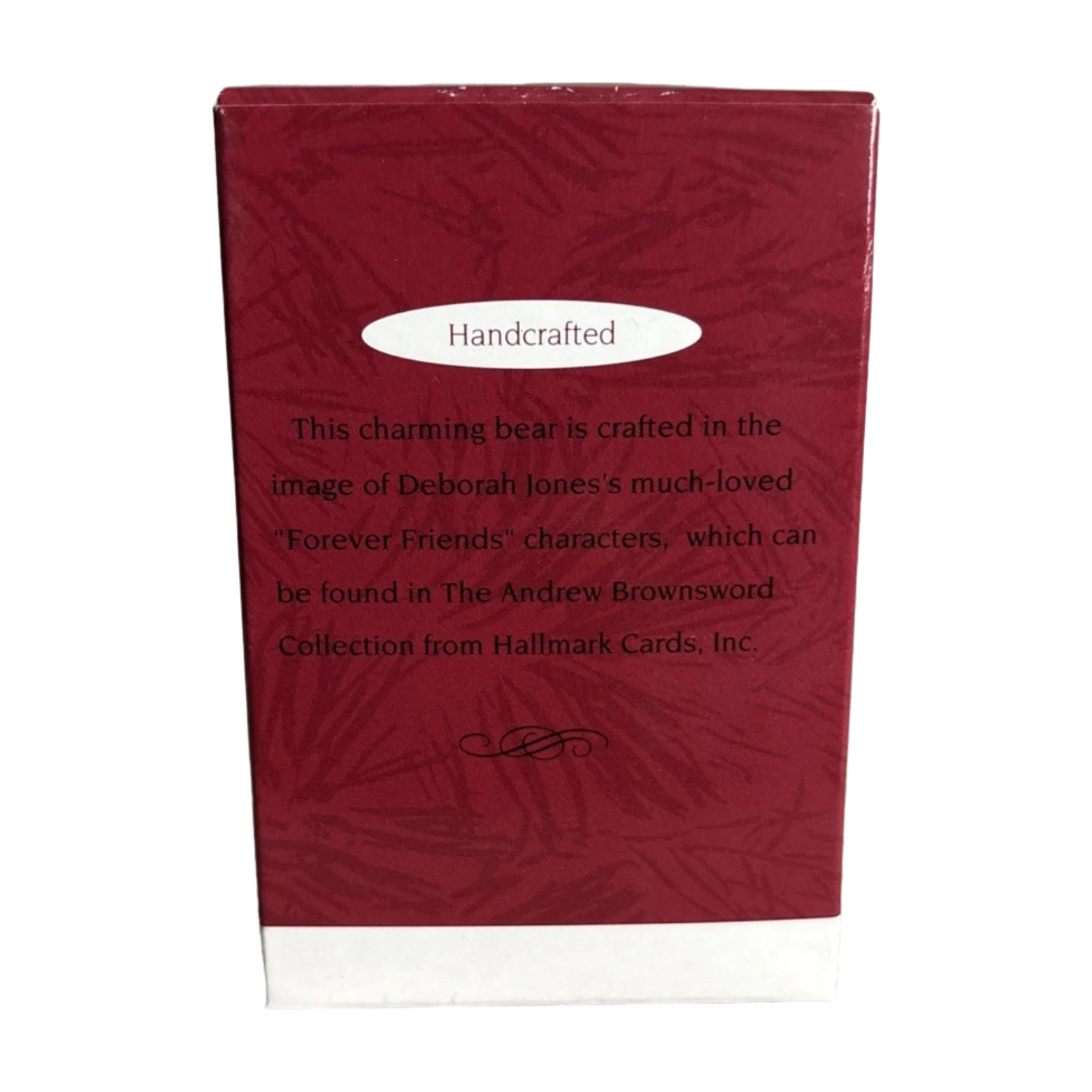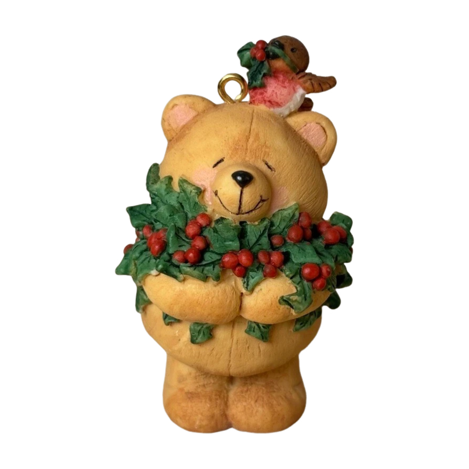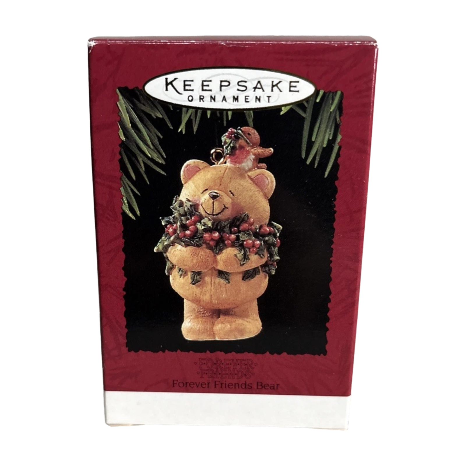 This 2001-dated Keepsake ornament from the Bear collection features an adorable teddy bear character in the “Forever Friends” style, holding a sprig of holly and perched in a wintery pose. The hand-painted finish uses soft, warm colours and the sculpt emphasises the bear’s gentle expression and textured fur. With its heartfelt “friendship” theme, this ornament makes a meaningful gift for a friend or collector, and its compact size is ideal for tree-hanging or display.