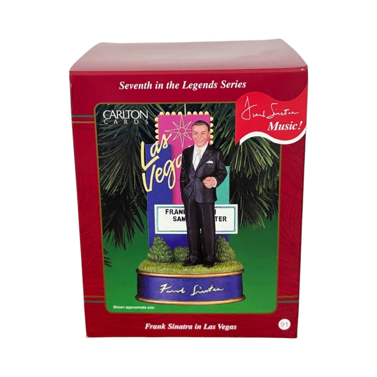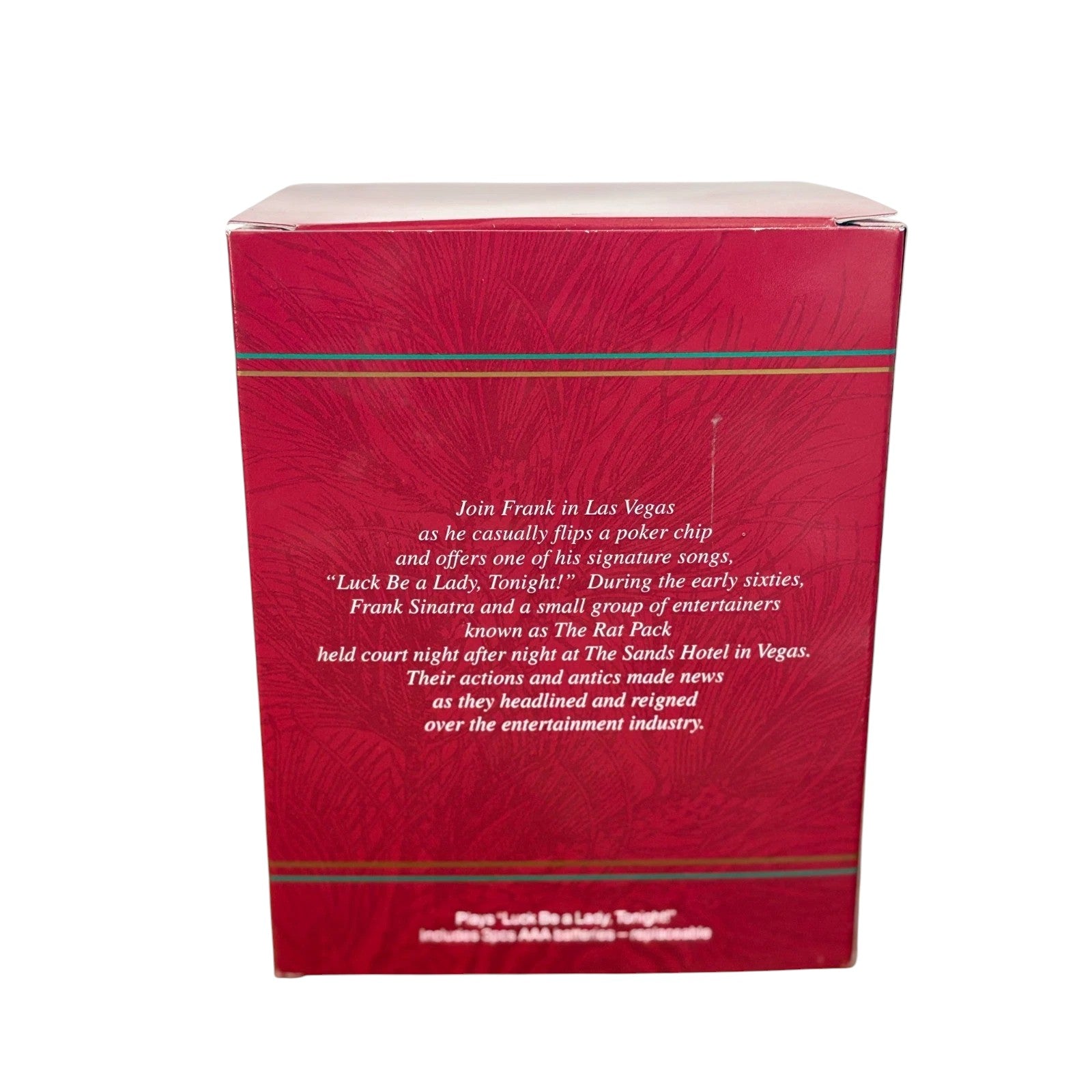 Celebrate the timeless legacy of “Ol’ Blue Eyes” with this special 2001 edition ornament from the Heirloom/Legends series by Carlton Cards. Featuring Frank Sinatra in full Las Vegas-showman mode, the ornament evokes the glitz and glamour of his legendary performances—with a built-in musical mechanism that plays “Luck Be a Lady Tonight!”. The multicolor sculpting, detailed coating and variant code CXOR-054E make this piece both a must-have for Sinatra fans and a collectible highlight for music-themed ornament displays.