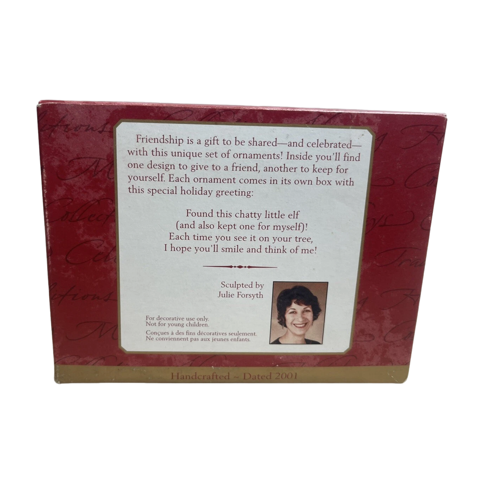 This 2001-dated Keepsake ornament set features two charming elves—one in silver and one in gold—designed as a “give & keep” duo. The silver elf stands at approximately 2.66″ high and the gold elf at approximately 3.13″ high, both delicately detailed and hand-painted. Created by artist Julie Forsyth, the pair captures the spirit of friendship and holiday sharing: one ornament to gift, one to retain. Ideal for collectors of elf or friendship themes, or anyone seeking a meaningful early-2000s Keepsake addition.