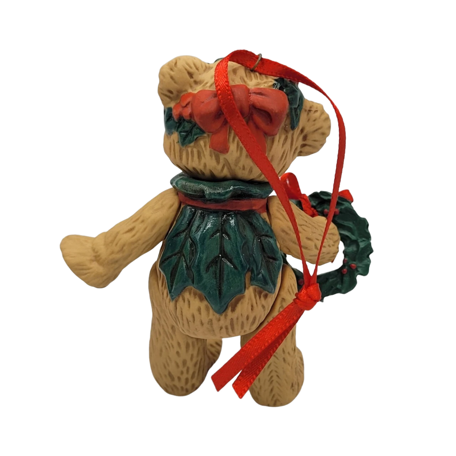 This 2001-dated ornament is number 3 in the “Gift Bearers” series from Hallmark. Crafted in porcelain, the teddy bear figure features poseable, jointed arms and legs, generously detailed with holly-leaf motifs and bearing a wreath that displays the year “2001”. At approximately 3¼″ high, the piece combines traditional holiday charm with motion-capable limbs, making it a standout for collectors of holiday bears, rep-posable figurines, or Keepsakes from the early 2000s.