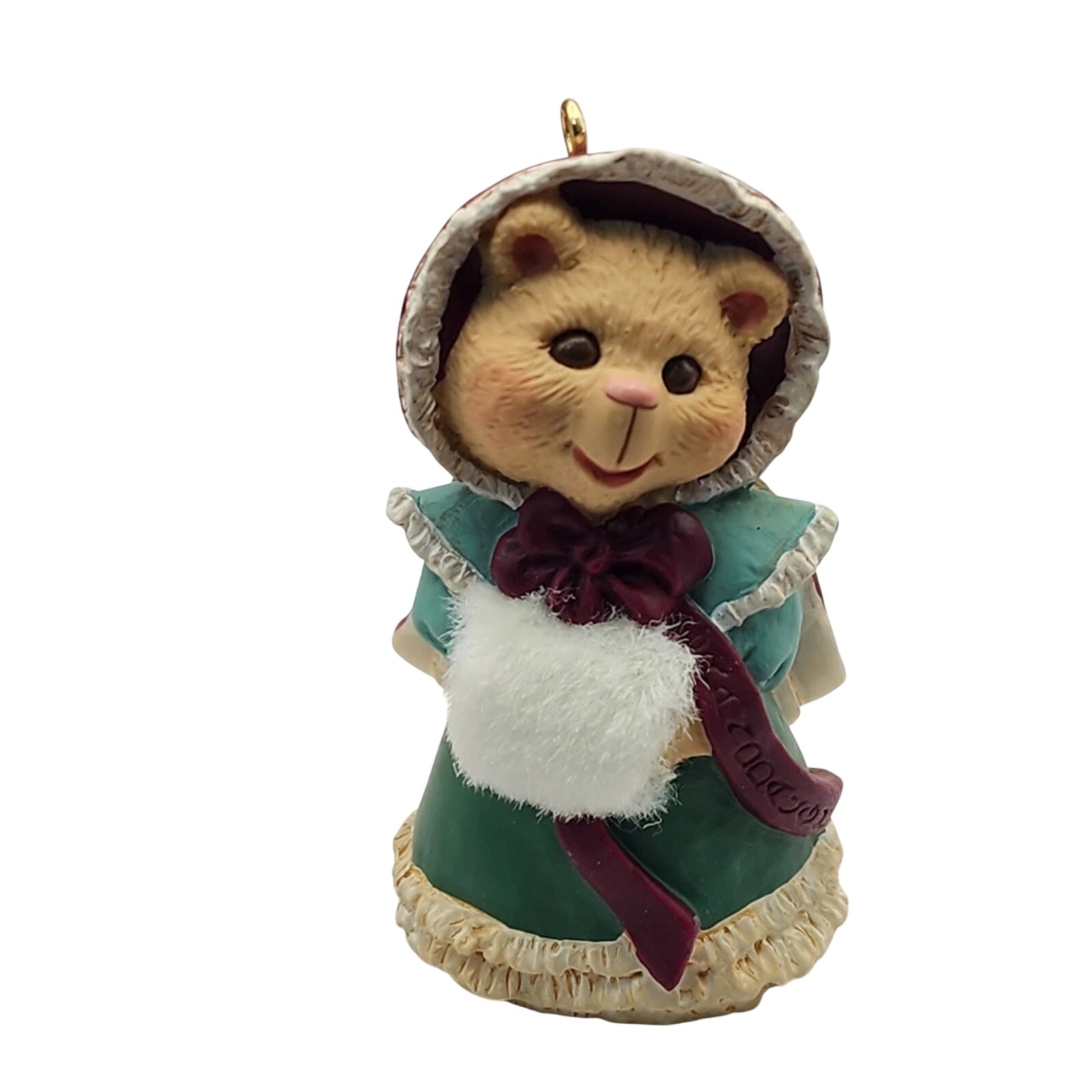 Celebrate cherished family memories with this 1999 Granddaughter Keepsake Ornament. This endearing miniature portrays a teddy bear bundled up in a festive green jacket and purple scarf, sledding on a saucer inscribed with “1999 Granddaughter.” Designed by Ed Seale, the die-cast metal figurine stands approximately 2½″ tall, arrives mint‑in‑box, and adds a warm, nostalgic touch to any holiday decor—no power required.