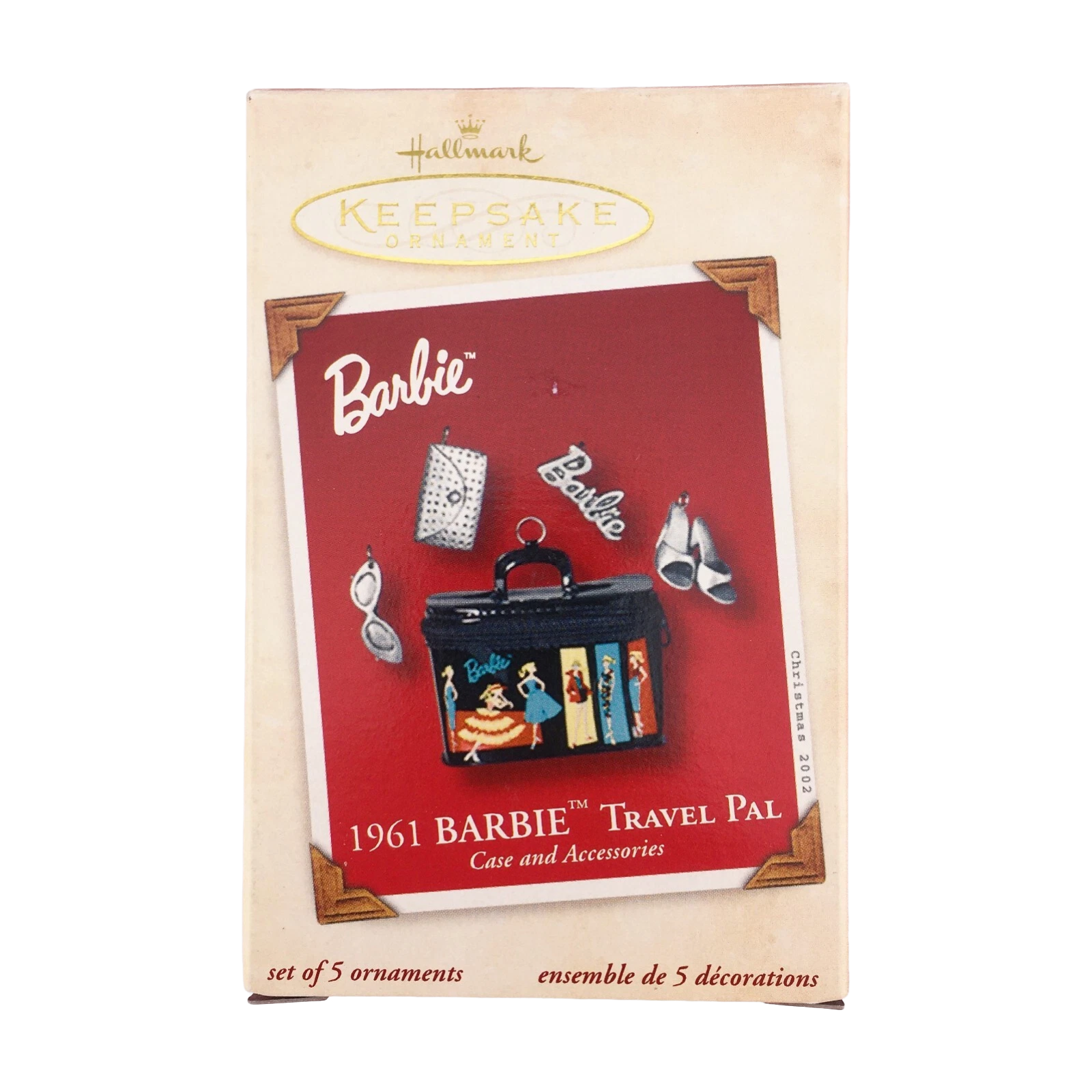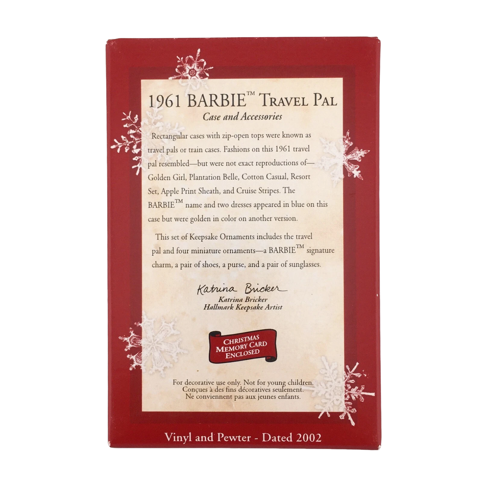 Celebrate Barbie’s early style with the 2001 (1961) Travel Pal Case & Accessories (Barbie) miniature ornament set. This retro keepsake features a compact vintage-style “travel pal” case with a working zipper and Barbie-themed illustrations—evoking the classic 1961 aesthetic. The case opens to reveal four adorable pewter accessories: a Barbie signature charm, a pair of high heels, a purse, and sunglasses. Designed by Katrina Bricker, this ornament set arrives in its original Keepsake Ornament box with the Hallmark tag and requires no power—just chic, nostalgic flair for your holiday décor.