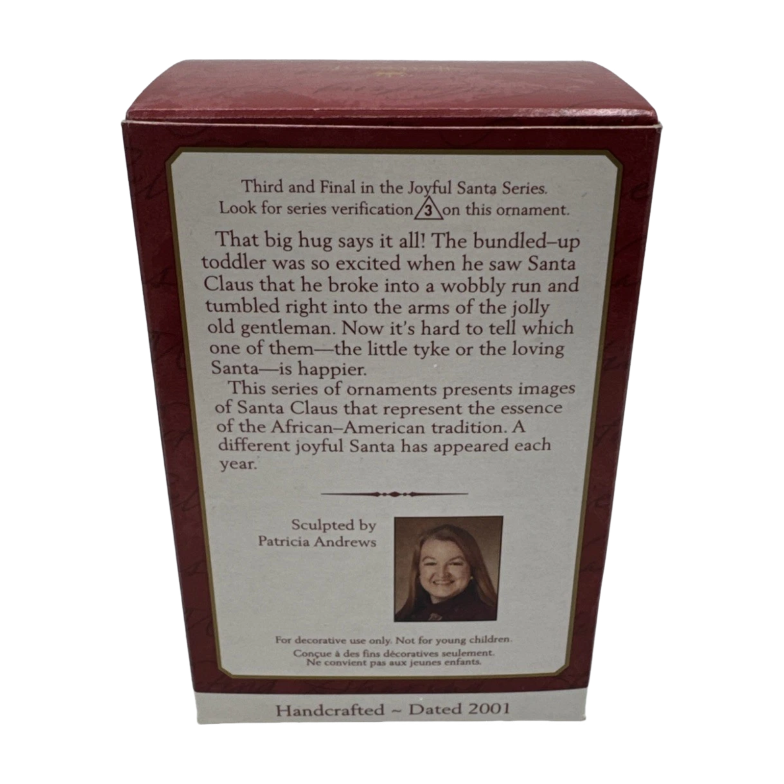 This heartwarming 2001 Joyful Santa ornament captures a touching moment: an African-American Santa giving a tender hug to a excited child. Expertly crafted by Patricia Andrews, this keepsake comes Mint-in-Box, complete with its original packaging and hanging loop—ready to grace your holiday tree without the need for batteries or light cords.