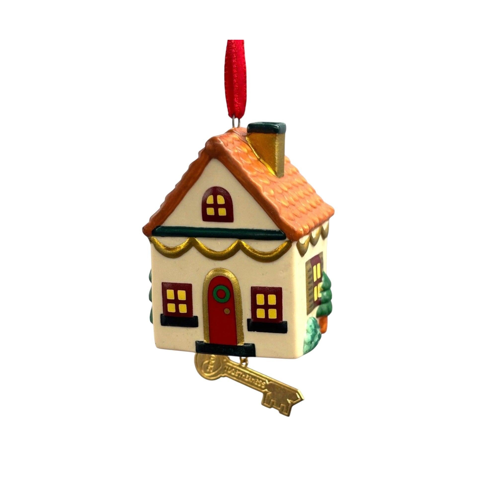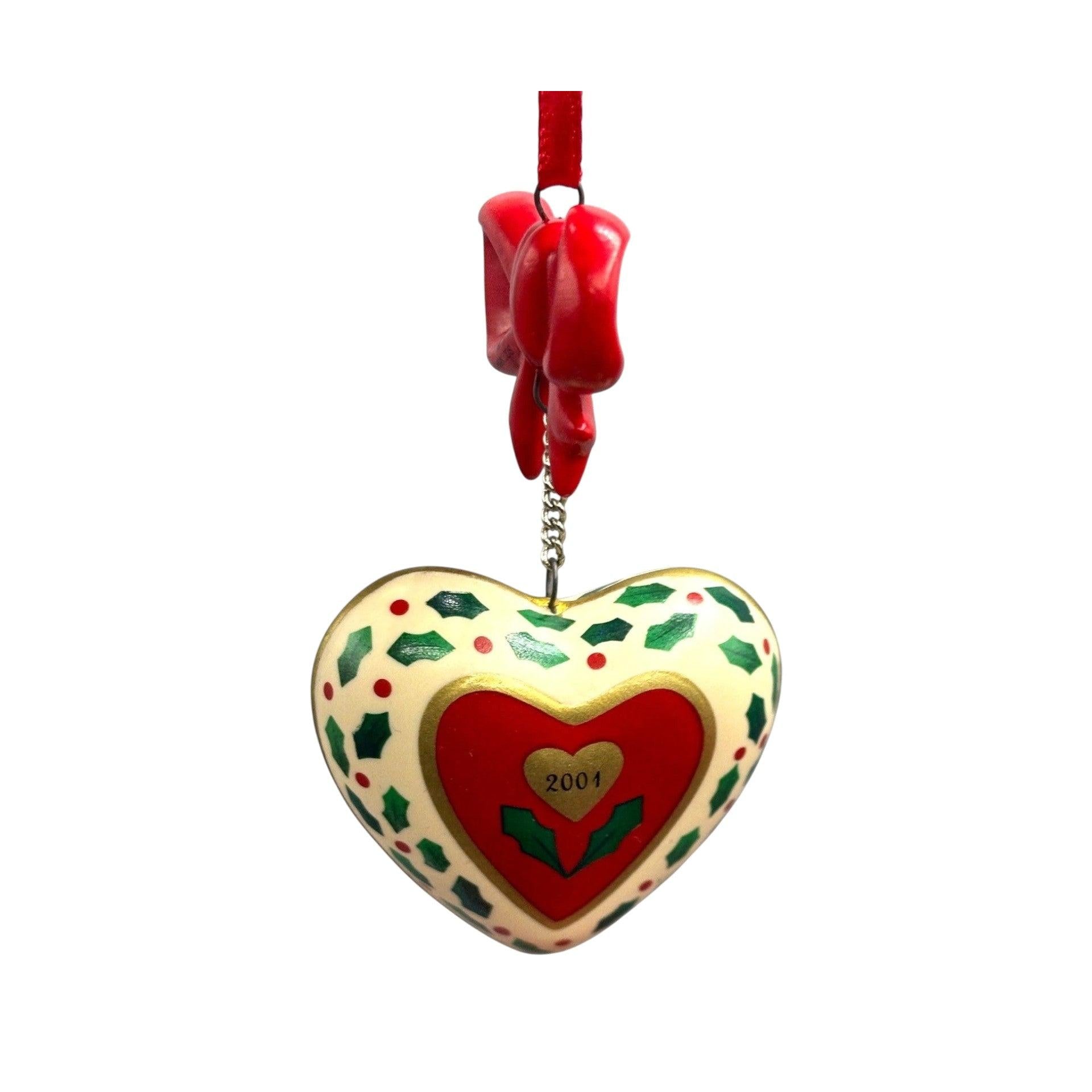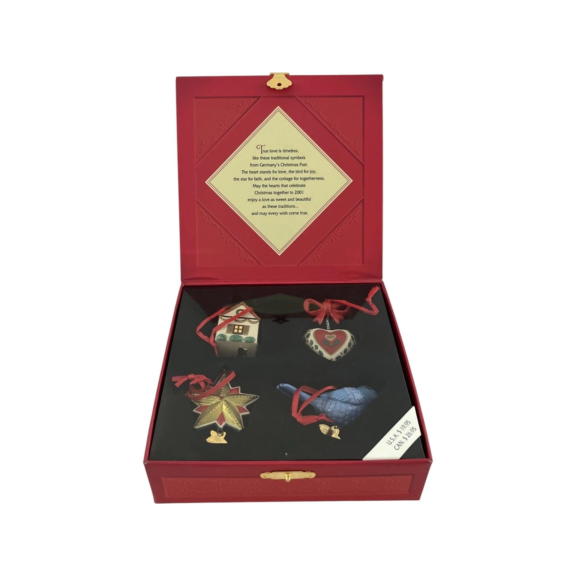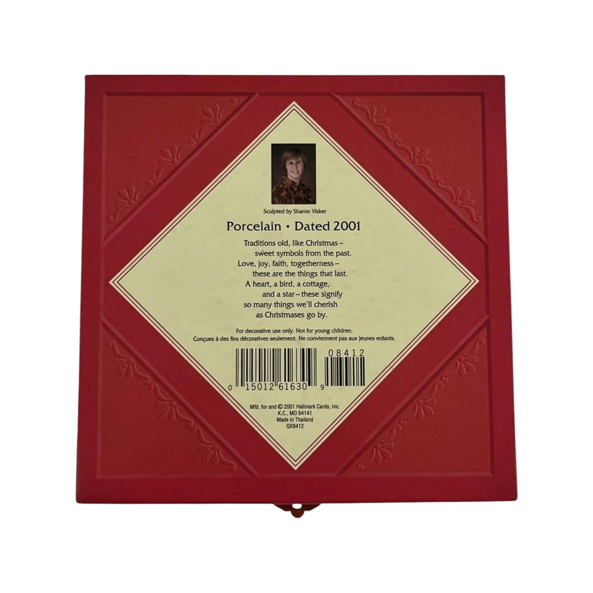 This keepsake ornament set from Hallmark includes four porcelain pieces symbolizing timeless holiday themes: a heart (love), a bird (joy), a star (faith) and a cottage/home (togetherness). The set is dated 2001 and includes little gold motifs (for example the bird bears a gold acorn inscribed “Joy 2001”). It makes a meaningful gift for couples, families or those celebrating “togetherness” and adds value in a year-dated Keepsake collection.