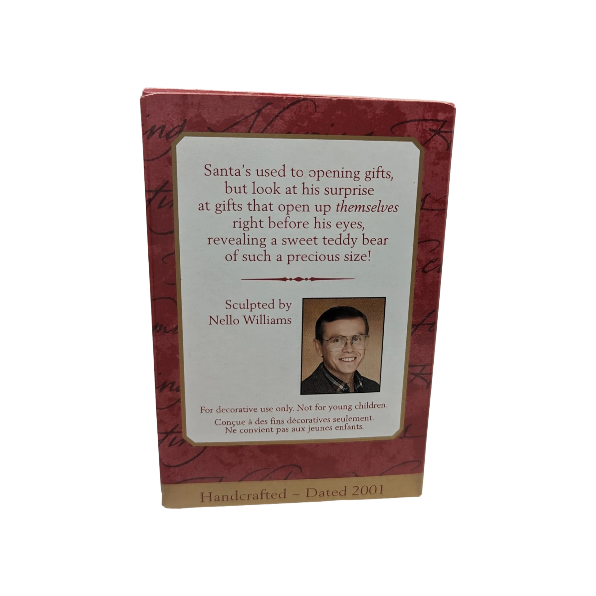 This 2001 Keepsake ornament features a cheerful, whimsical Santa Claus “peeking” from behind (or emerging from) a present — effectively capturing the surprise and joy of Christmas gift-giving. The design evokes a playful holiday spirit and works well on a Christmas tree or as part of a collectible Keepsake display. When complete and in mint condition, the ornament typically includes the original box and hanging hook/ribbon, making it collectible or gift-ready. There is no light, sound, or mechanical motion — the ornament is purely decorative and doesn’t require batteries, cords, or light strings.
