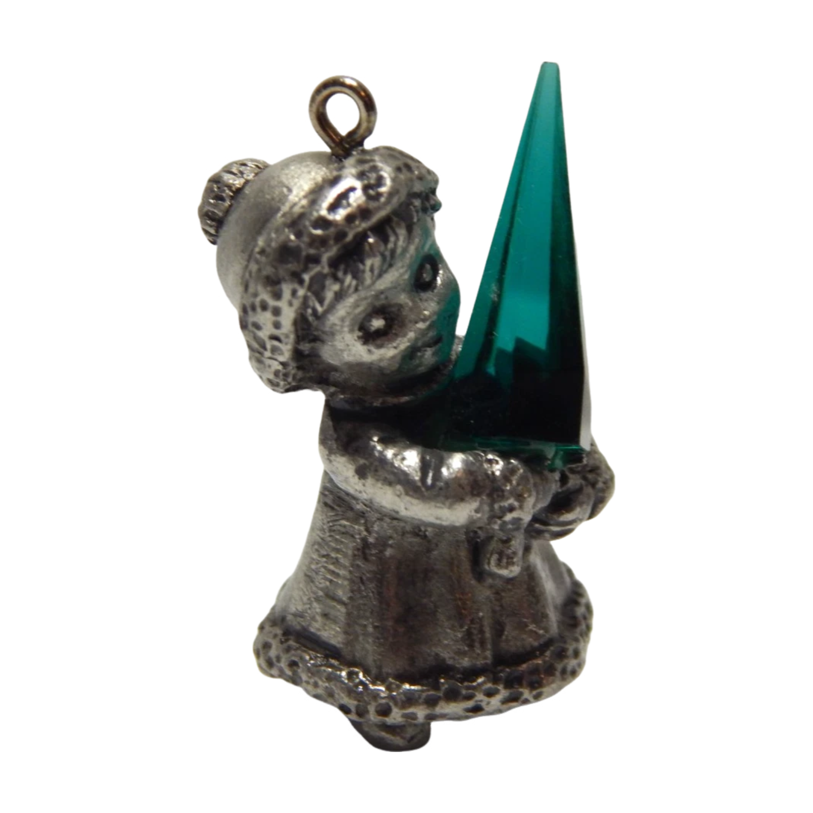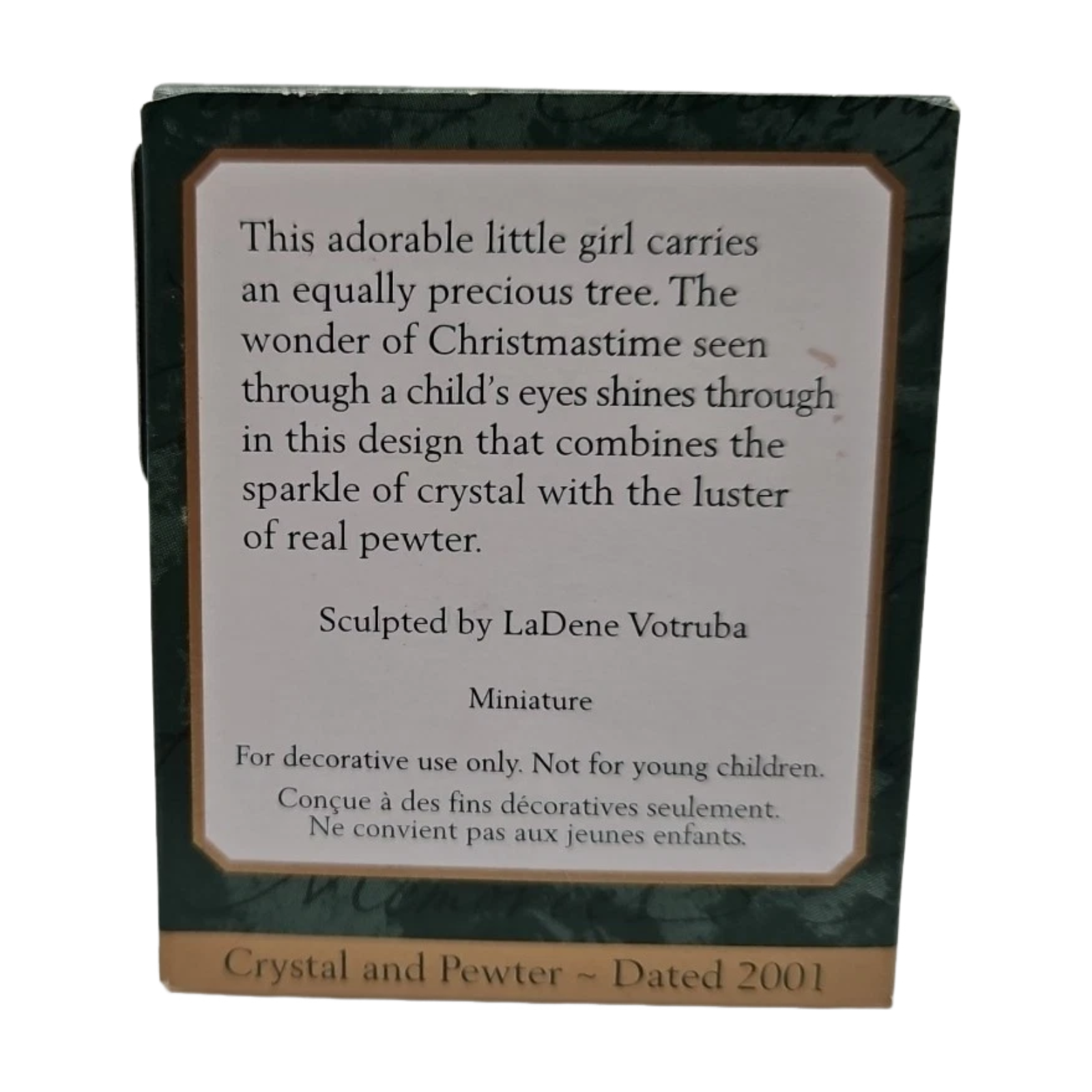 Add a sparkle to your Miniature collection with 2001 Radiant Christmas, a Precious Editions ornament by Hallmark. This petite keepsake features a pewter “little girl” holding a green crystal tree, crafted by artist LaDene Votruba. The ornament is approx 1″ high and combines the shine of real pewter with the sparkle of crystal. It includes the ornament itself; mint-in-box versions come with the original packaging. No batteries, cords, lights, or sound—pure miniature charm.
