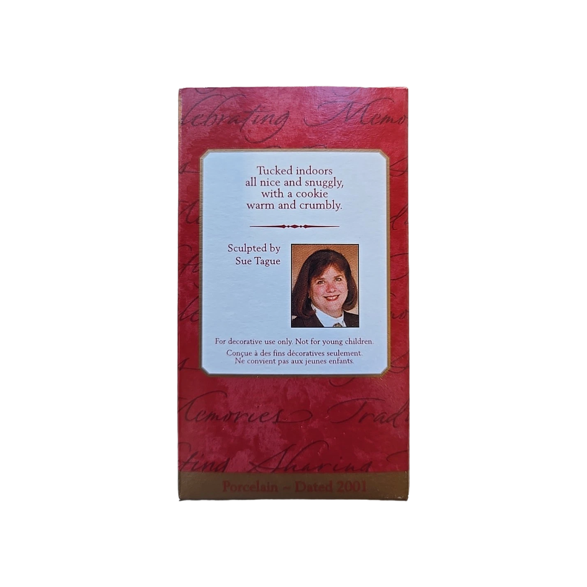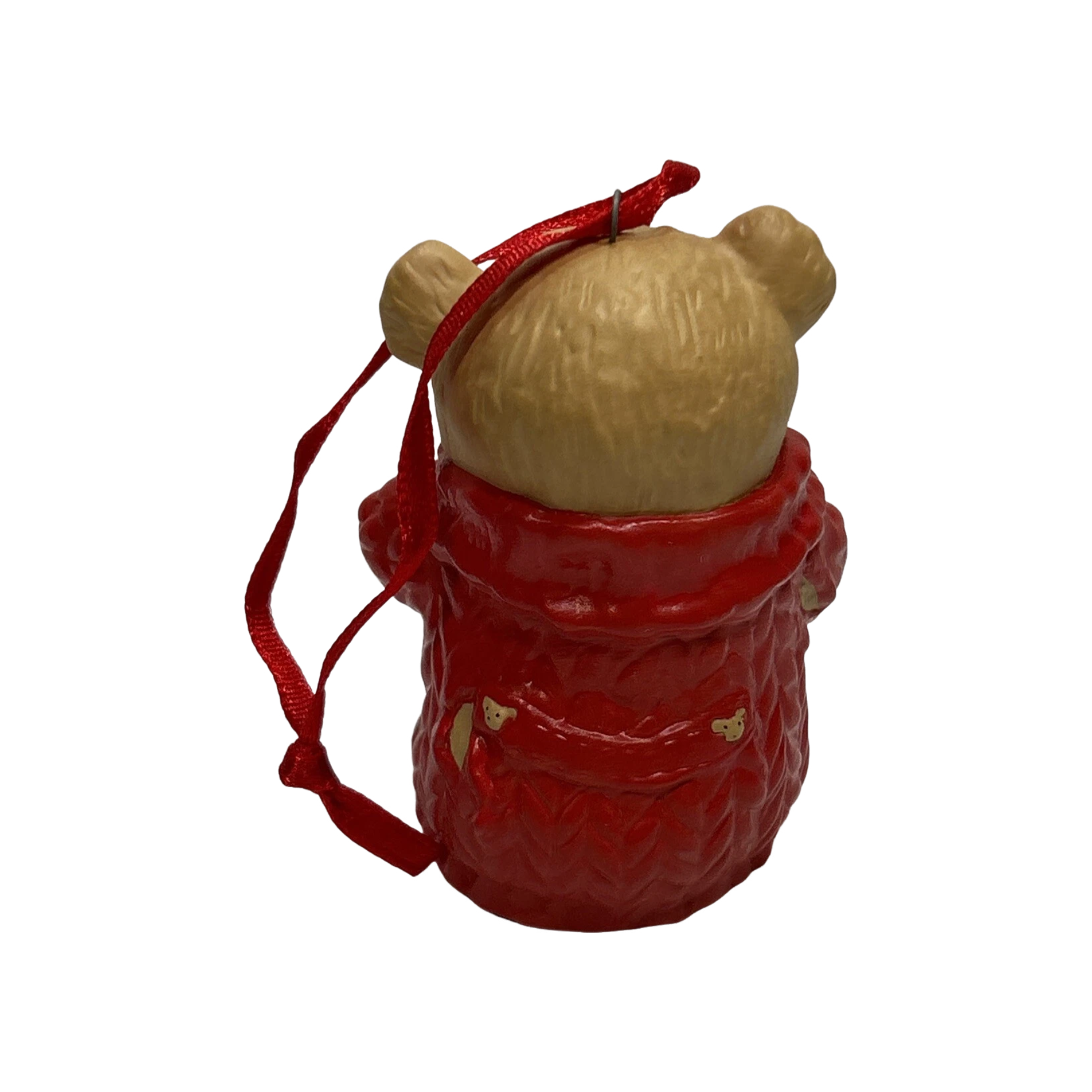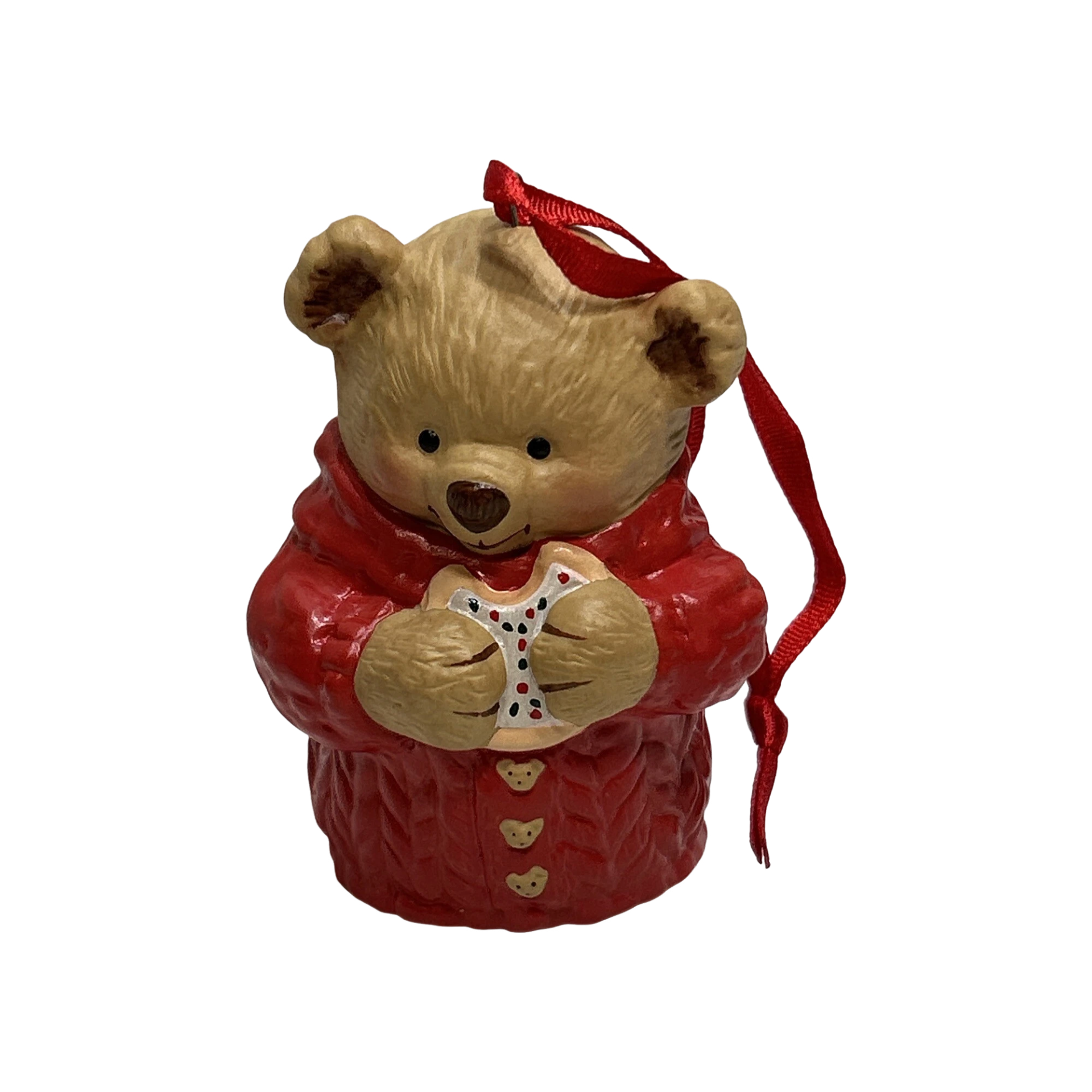 This 2001 Keepsake ornament — the Hallmark “Snuggly Sugar Bear Bell” — features an adorable teddy-bear character dressed in a cozy red sweater and holding a Christmas cookie, capturing a warm, nostalgic holiday spirit. The bear’s legs dangle loosely so the ornament mimics a bell-like motif, adding a playful, whimsical charm. When in mint (new-in-box) condition, the package includes the porcelain bear bell ornament and its original Hallmark box, ready for tree-hanging or display. The ornament is purely decorative: there’s no light, sound, or mechanical motion — no batteries or cords required