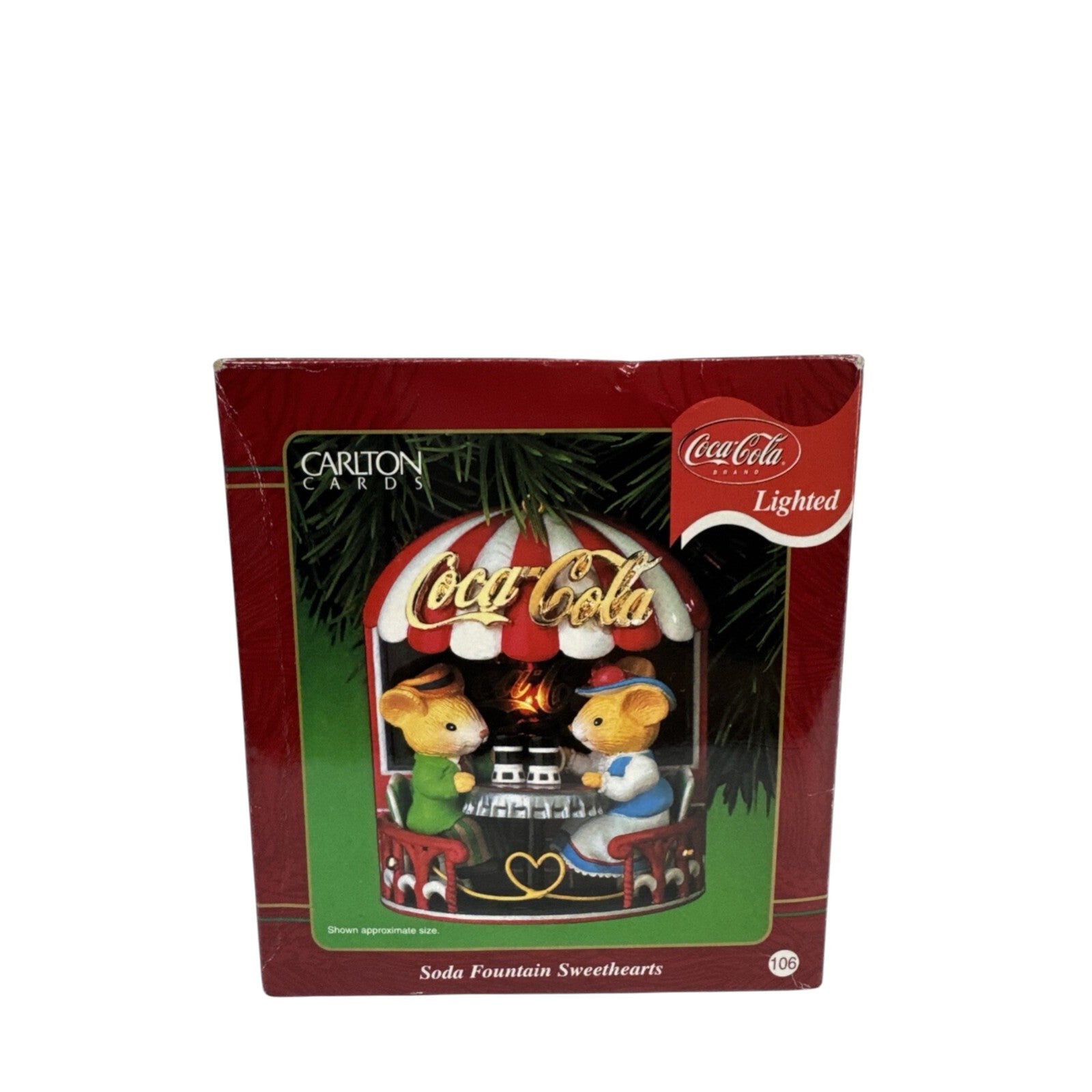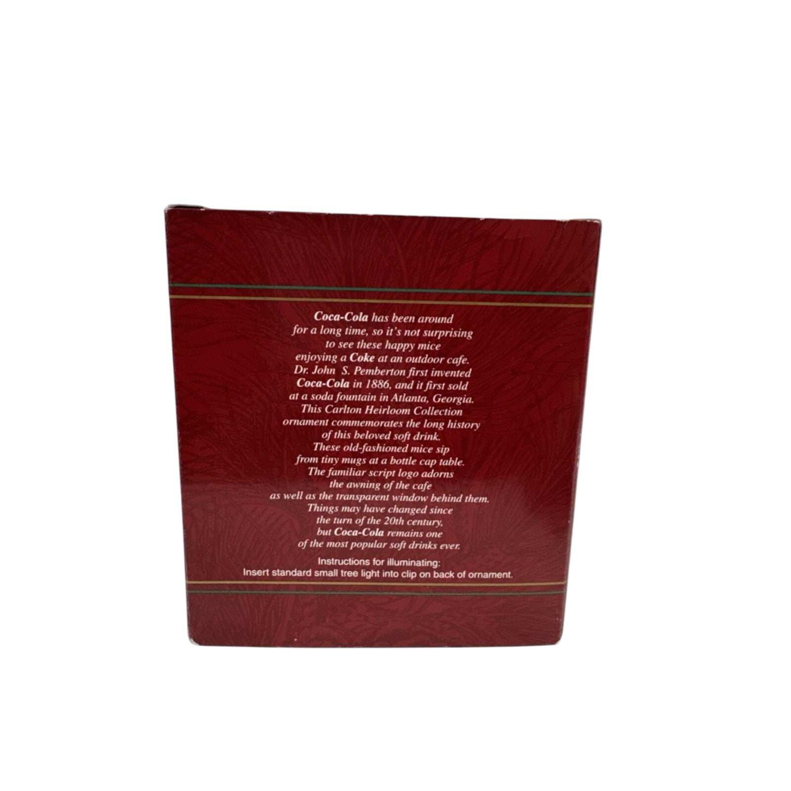 This collectible ornament features a charming scene of two mice sharing a classic Coca-Cola at an old-fashioned soda fountain, complete with red and white detailing and nostalgic design cues. As part of the “Heirloom Coca-Cola” themed line, the piece includes a light-clip back so it can be hung in front of a tree light and glow from within—a sweet, retro touch. Its multicolor finish, whimsical characters, and licensed Coca-Cola branding make it an appealing find for both holiday décor lovers and Coca-Cola memorabilia collectors. Though often referred to as “vintage,” this ornament was manufactured in 2001 and evokes the charm of a bygone soda-shop era.