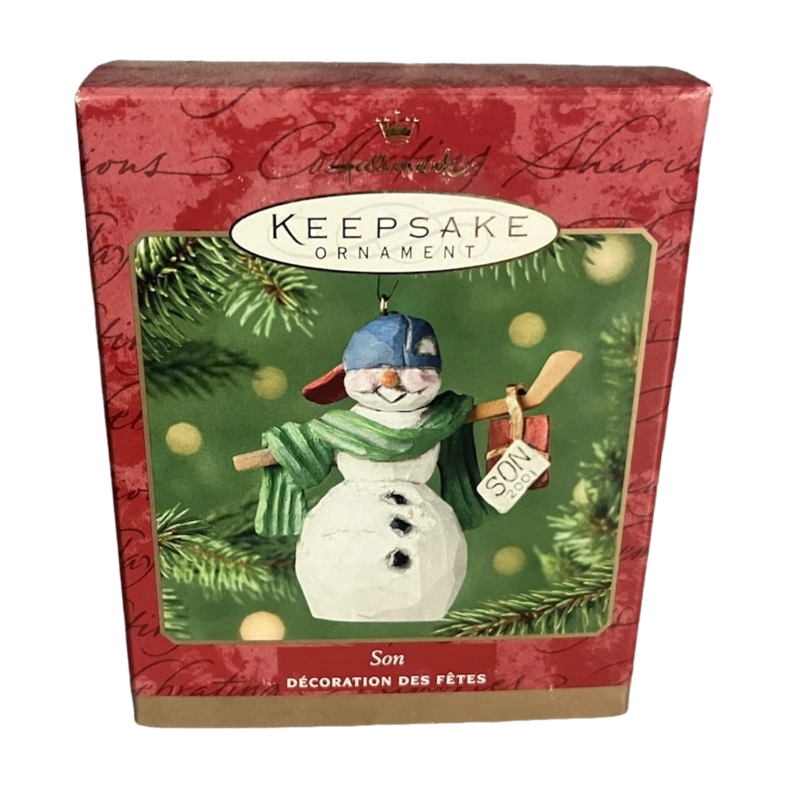 Celebrate the son in your life with this heartfelt 2001 keepsake from Hallmark. This design features a cheerful snow-man wearing a baseball cap and scarf, holding a hockey stick-style arm that supports a sign reading “Son 2001”. The playful winter sports motif, vibrant colors, and clearly dated “2001” marking make it a meaningful yearly memento. As part of the “Family” themed series, it’s perfect for highlighting family bonds on your tree and stands out as a collectible from the early 2000s Hallmark line.