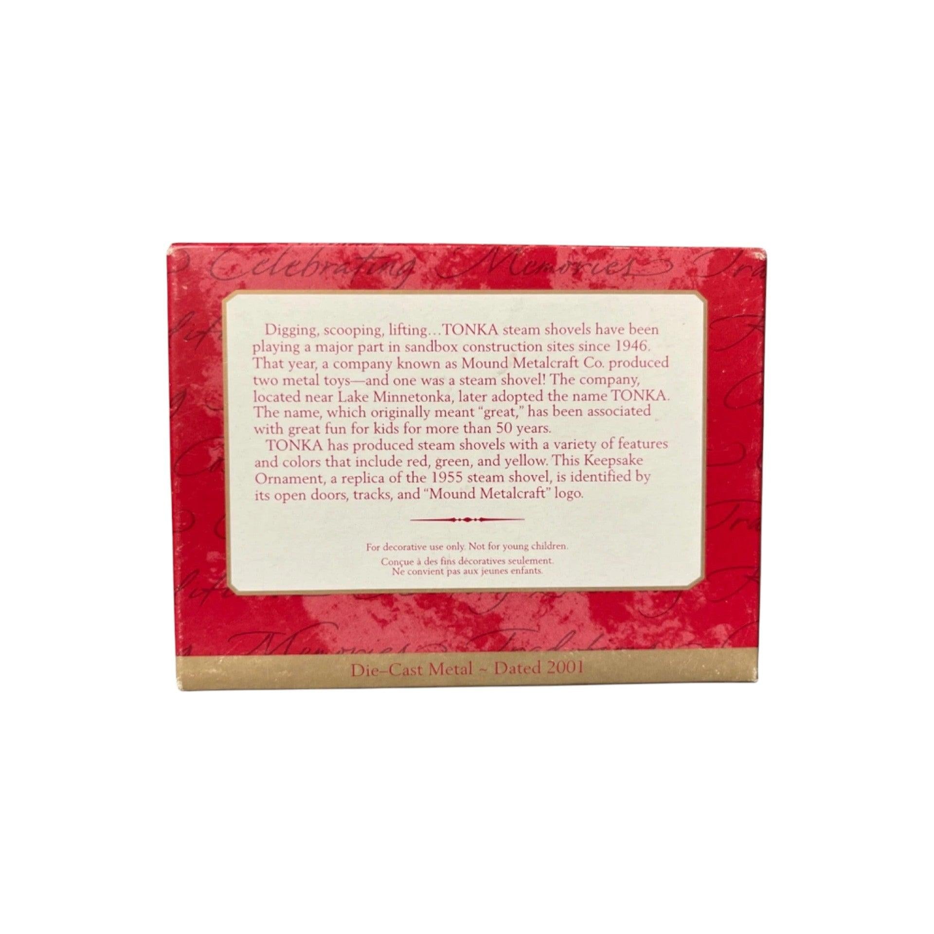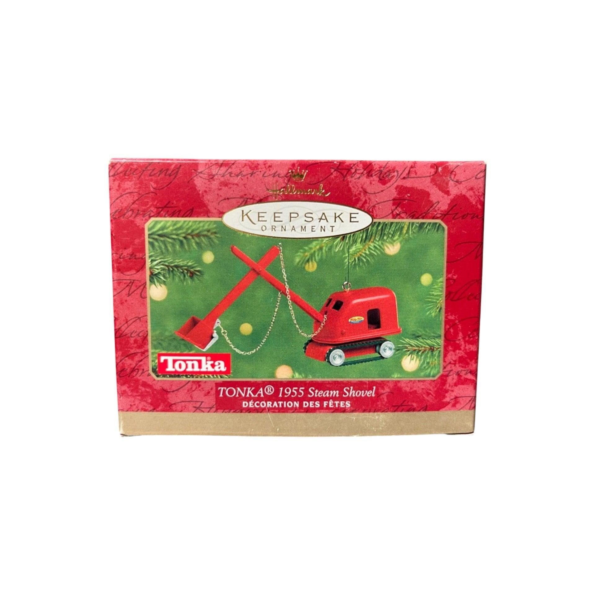 Dig into nostalgia with the 2001 Tonka 1955 Steam Shovel Keepsake ornament. This vintage-style mini construction machine captures the classic 1955 steam shovel, crafted of die-cast metal with working parts: the cab rotates, and the tread belt and wheels turn. Fully dated 2001, this piece is sized at 2.520″ H × 3.649″ W × 1.425″ D. It includes the original hanging loop, and the original box when available.