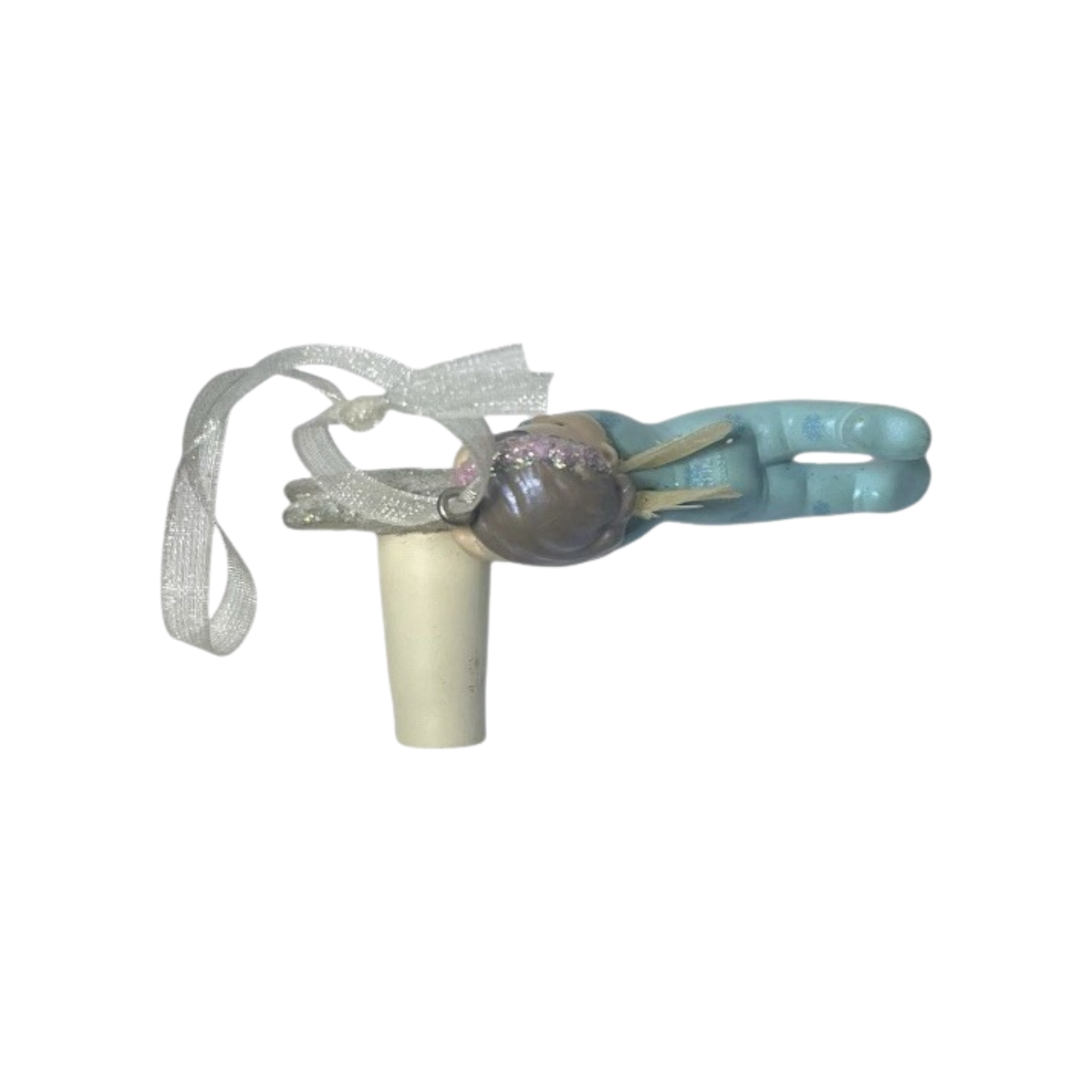 Illuminate your holiday with the 2002 Baby Estrella ornament from Hallmark’s Frostlight Faeries “Too” series. Crafted by artist Joanne Eschrich, this charming fairy baby floats mid-flight in footed pajama-style attire, clutching a sparkling snowflake. Equipped with fiber-optic lighting, she glows gently when placed in a standard miniature light bulb. This collectible arrives mint‑in‑box complete with original packaging and tag, and requires no batteries or cords—making her a radiant touch of winter magic all on her own.