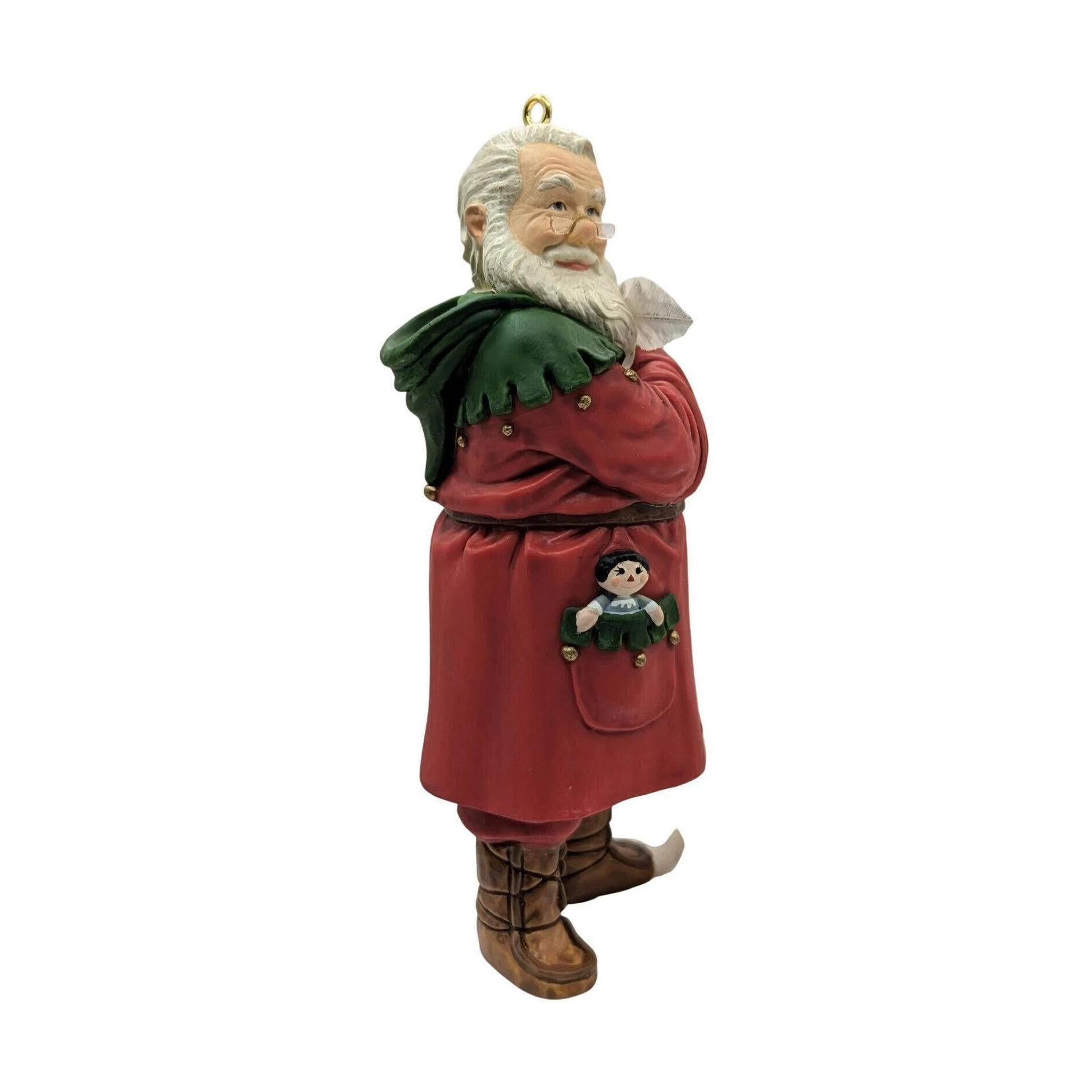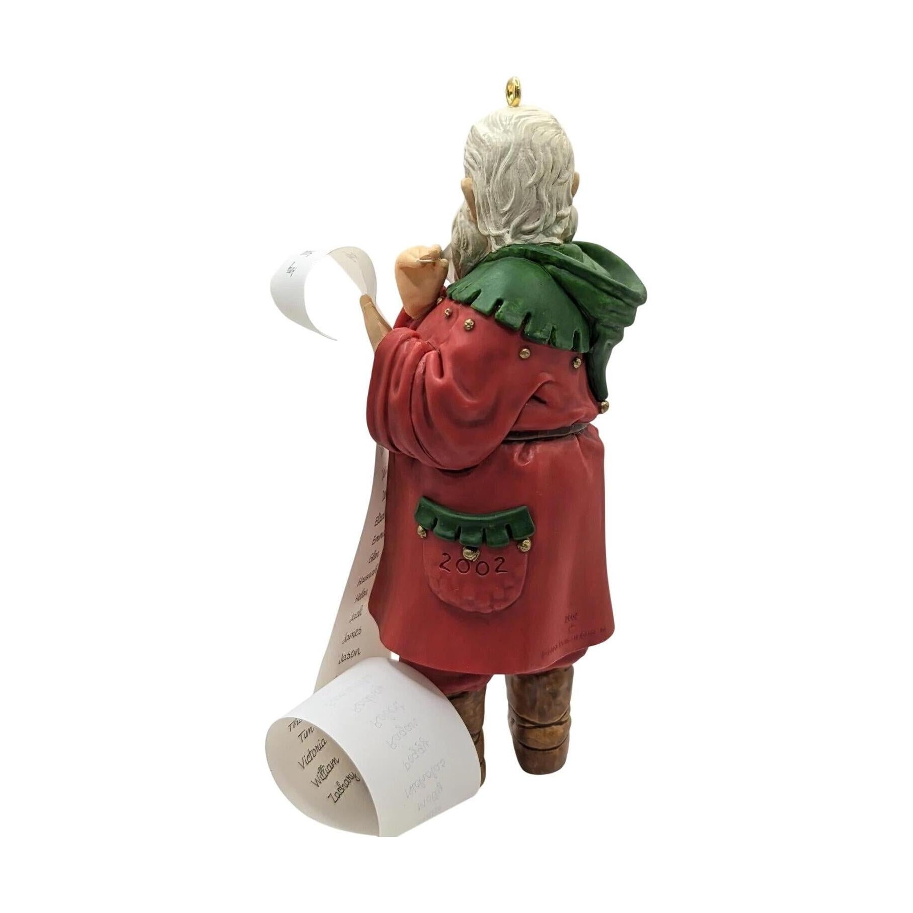 This 2002 ornament from the Hallmark Keepsake collection, titled “Checking the List”, features Santa Claus in a classic pose: standing upright and reviewing his book of holiday lists to ensure he’s accounted for every gift — naughty and nice alike. The design highlights Santa’s dedication and the timeless charm of his Christmas Eve preparations. With its subtly painted detail and the year “2002” clearly marked, this piece holds both display appeal and collectible value within the Keepsake line.