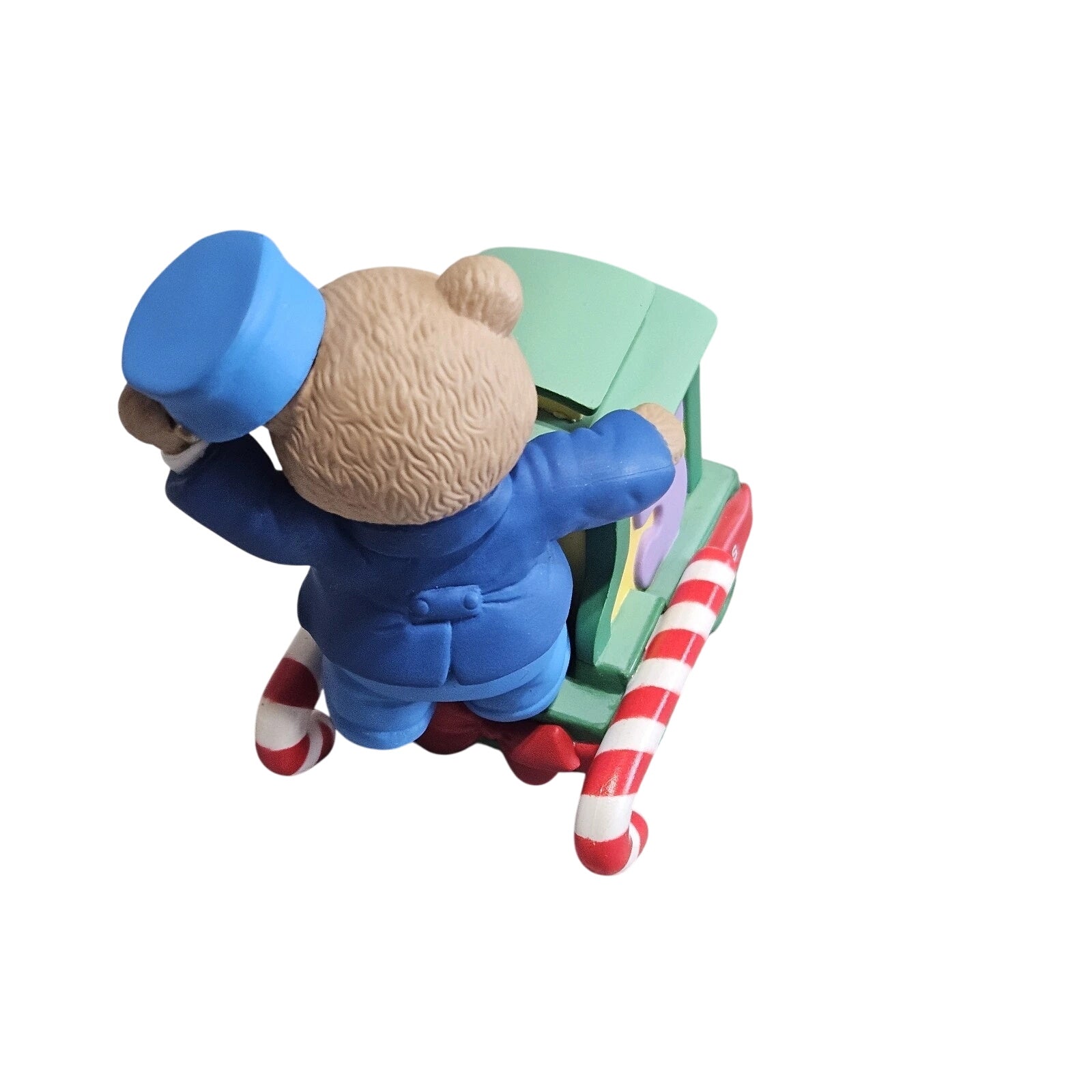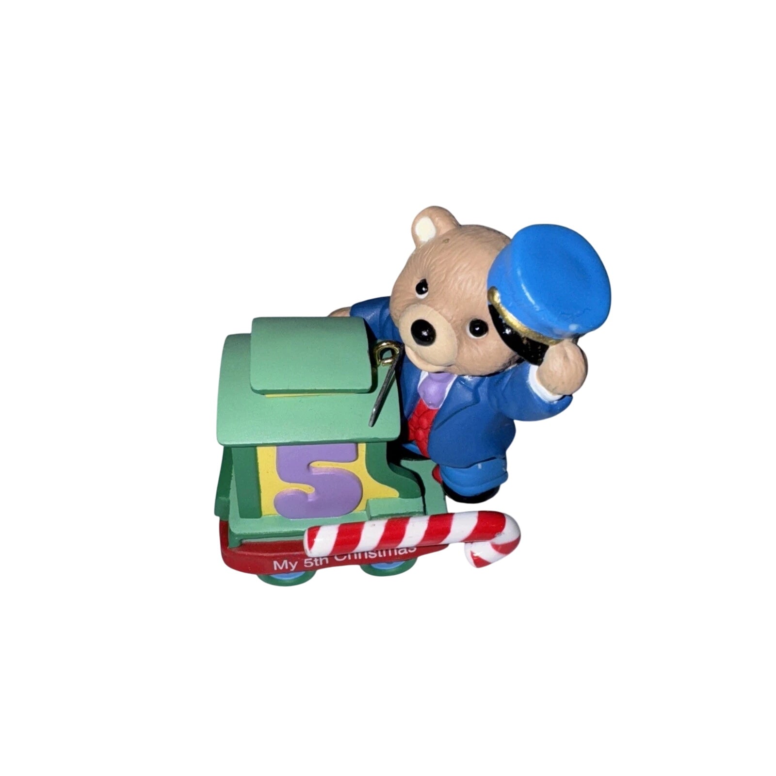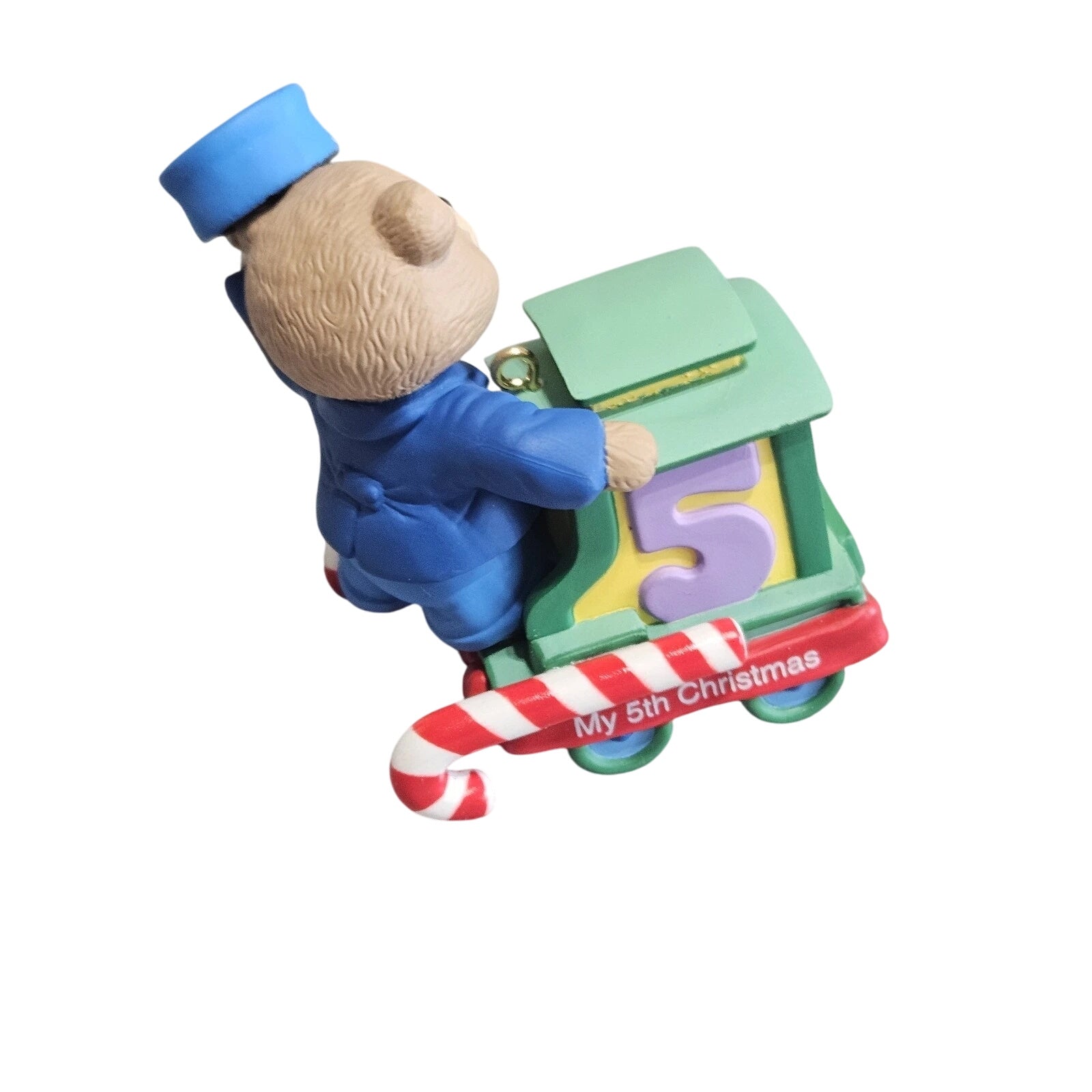 Celebrate a cherished milestone with the 2004 Child’s Fifth Christmas ornament. This iconic keepsake features a whimsical teddy bear riding in a festive train car marked with the number 5, complete with the inscription “My 5th Christmas.” The sculpted detail on the train, the bear’s expression, and the candy-cane accents evoke the playful spirit of turning five.