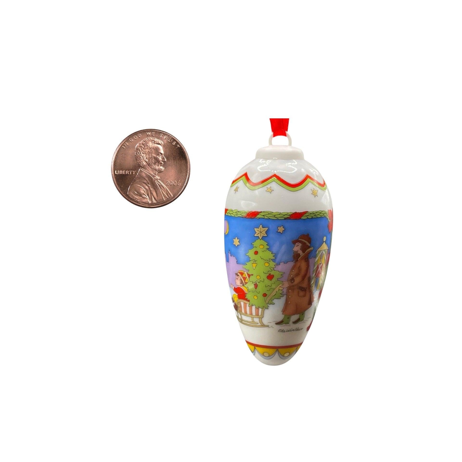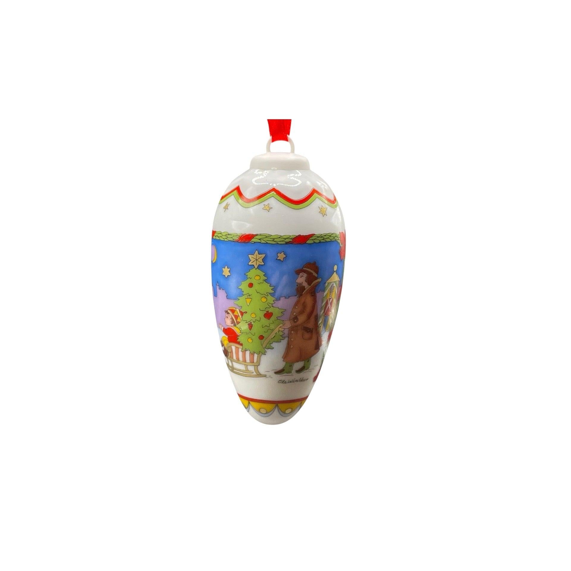 This 2002 Hutschenreuther Christmas Pine Cone ornament is a classic porcelain pine-cone shaped keepsake from the brand’s annual Christmas Tree collection, featuring richly detailed, hand-painted holiday scenes wrapped around the cone in soft winter pastels with gold accents. The top is finished with a white cap and hanging loop, designed to mimic a real pine cone while adding an elegant, Old-World German Christmas feel to your tree.
