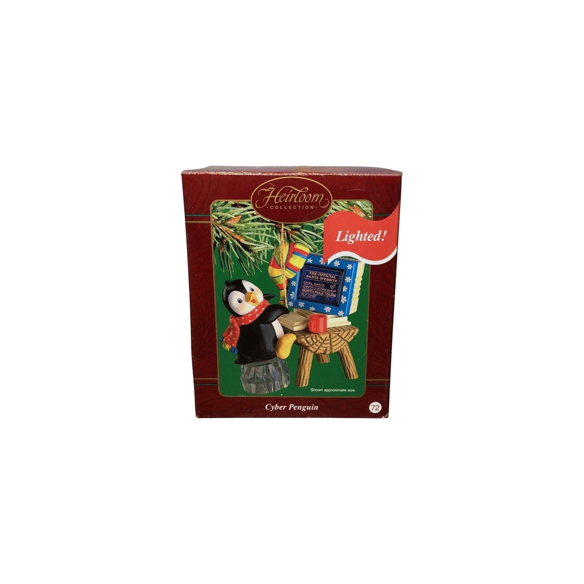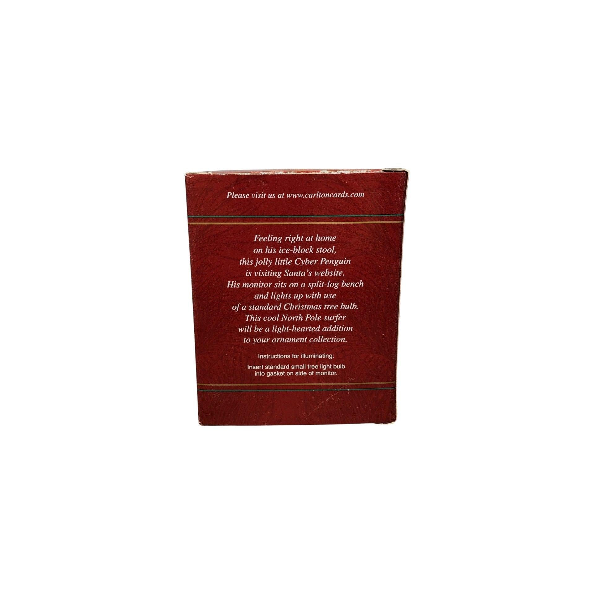 This fun and unique ornament from the Carlton Cards Heirloom/“Vintage” line features a cheerful penguin in a playful “cyber” or tech-inspired setting—complete with a monitor on his ice-block stool and a split-log bench. The detail is whimsical, applying holiday décor to a penguin using modern gadget motifs. With its dated collectible appeal and themed novelty, it’s perfect for penguin collectors, tech-novelty holiday trees, or ornament aficionados seeking something different.