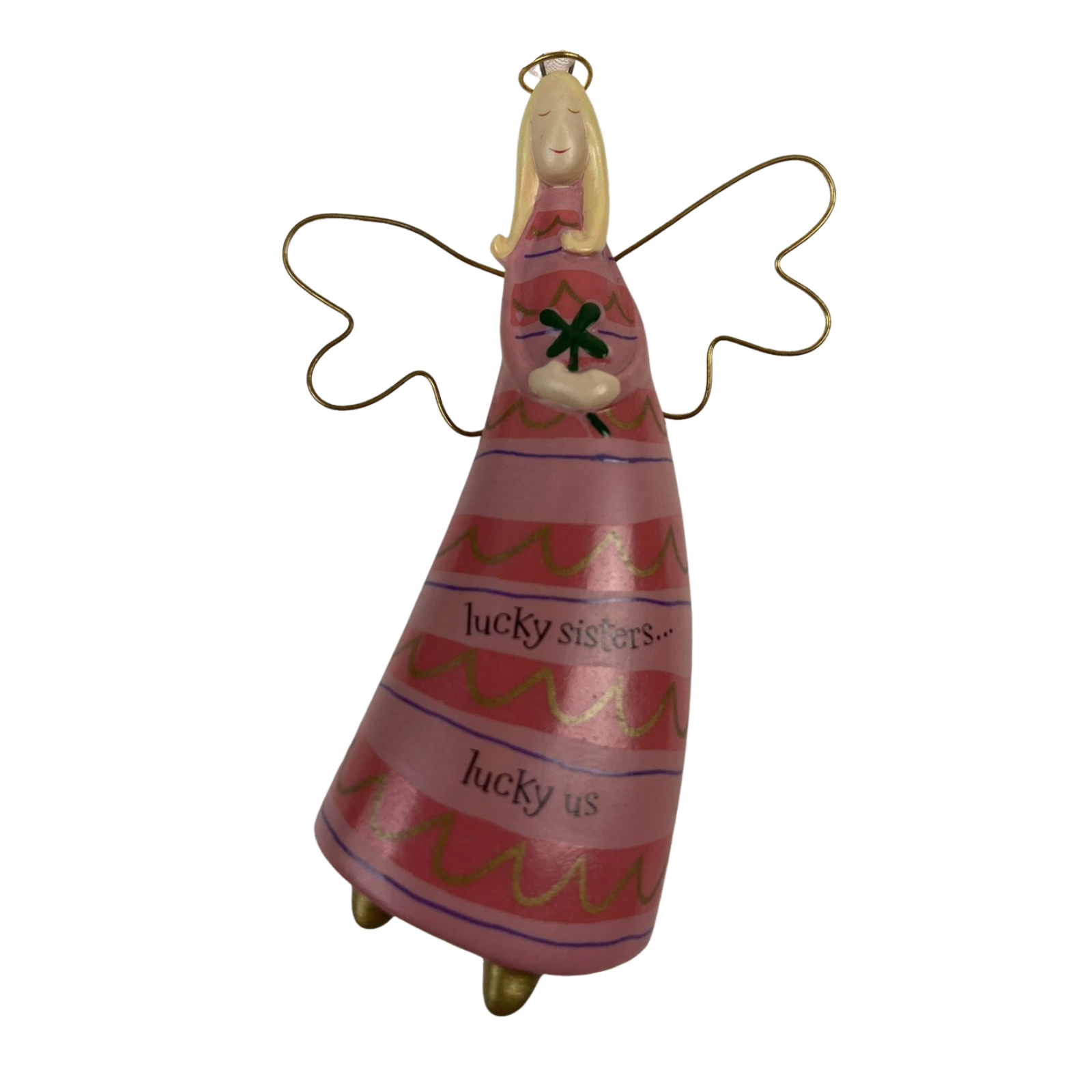 Celebrate the special bond of sisterhood with this charming Lucky Sisters ornament from Hallmark’s Between Us collection. Crafted in 2002, the porcelain angel (dressed in a soft pink gown) holds a four-leaf clover, accented by delicate gold wire wings. The heartfelt inscription—“lucky sisters... lucky us”—makes this piece a thoughtful keepsake that beautifully honors family and lasting connection. Designed by Kristina Kline, it arrives lovingly preserved in its original box—no power required; simply hang and cherish.