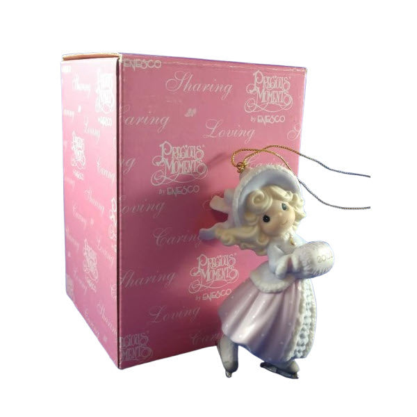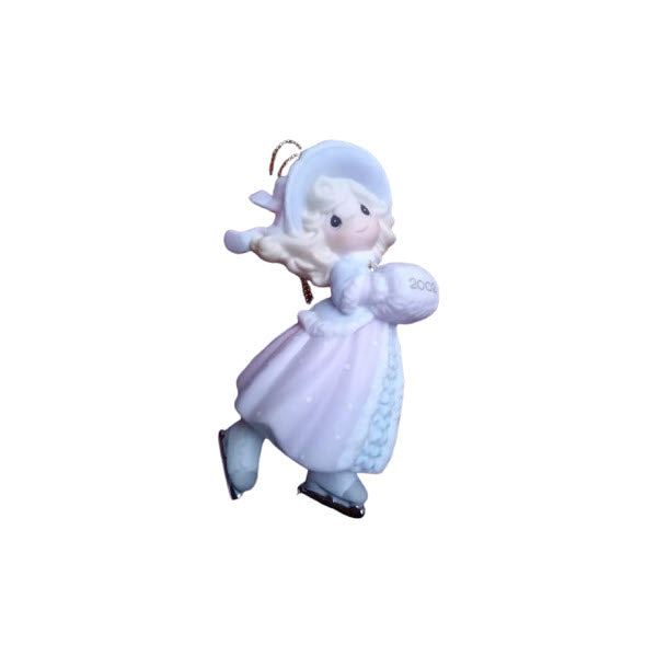 The Precious Moments "May Your Holiday Sparkle with Joy" Dated 2002 Ornament features a sweet girl character surrounded by festive decorations, spreading holiday cheer with her joyful expression.