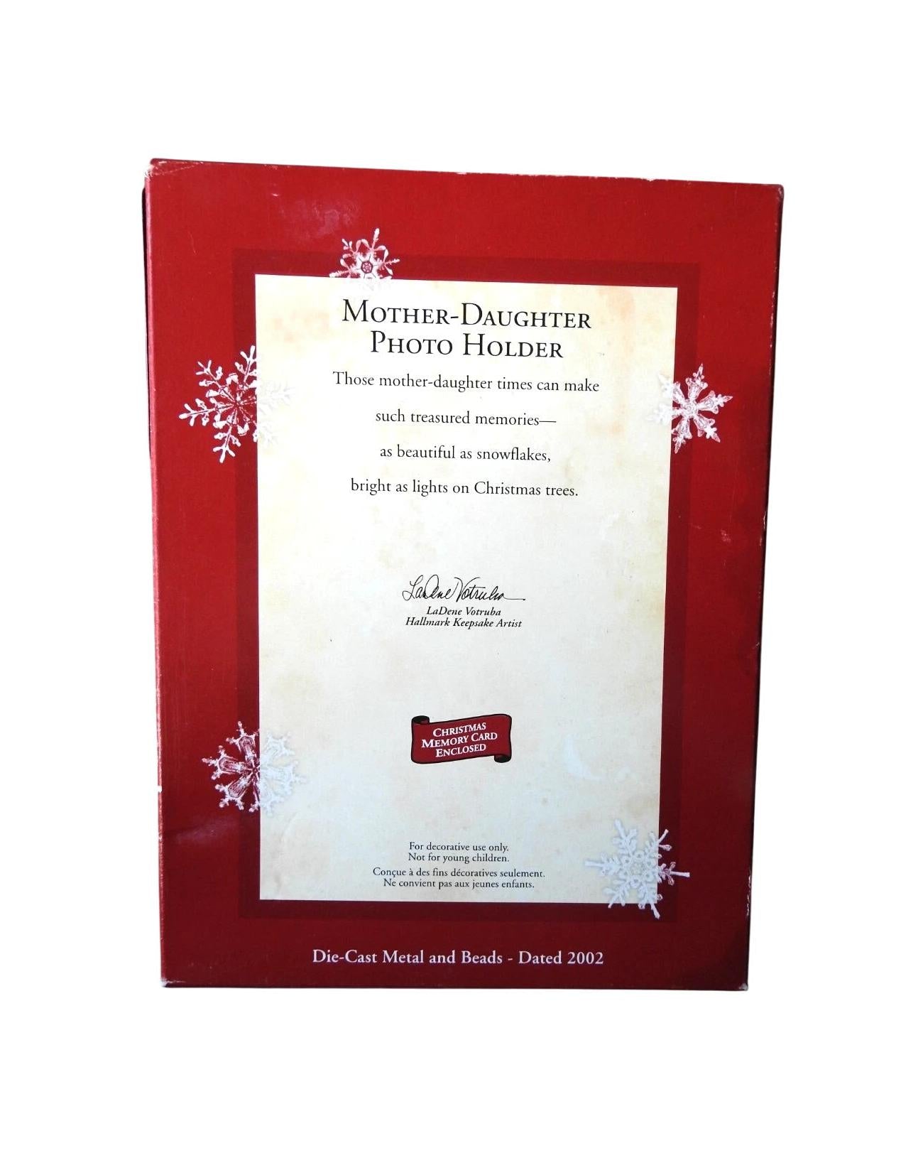 Celebrate the special bond between mother and daughter with the 2002 edition of the Hallmark Keepsake “Mother-Daughter” photo-holder ornament. This beautifully crafted piece features a snowflake-shaped metal frame, adorned with glass beads, and includes a spot for inserting a cherished photo of the two of you together. Measuring approximately 6 ⅛″ tall by 3 ⅜″ wide, it is made of metal and glass beads and is designed by artist LaDene Votruba. With its elegant design and functional photo-frame aspect, it makes an ideal keepsake gift for Mother’s Day, a first Christmas together, or simply to honor the relationship year after year.