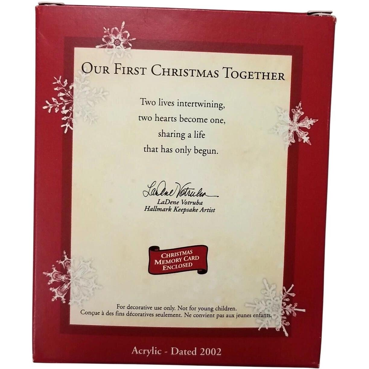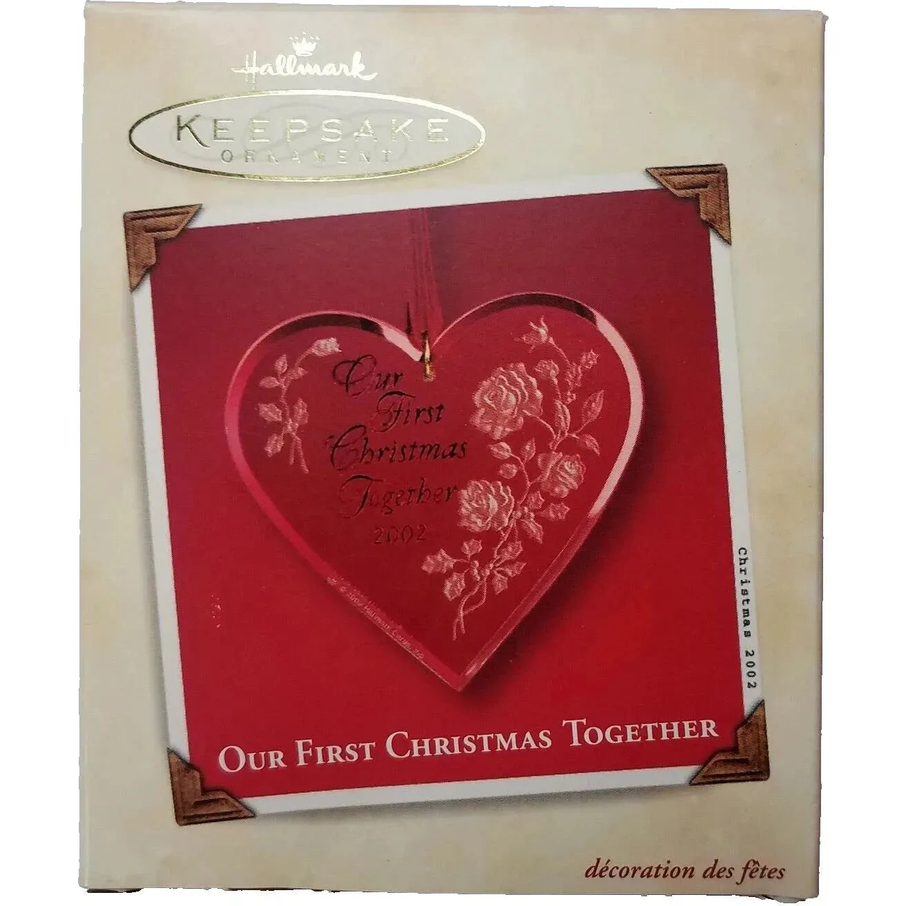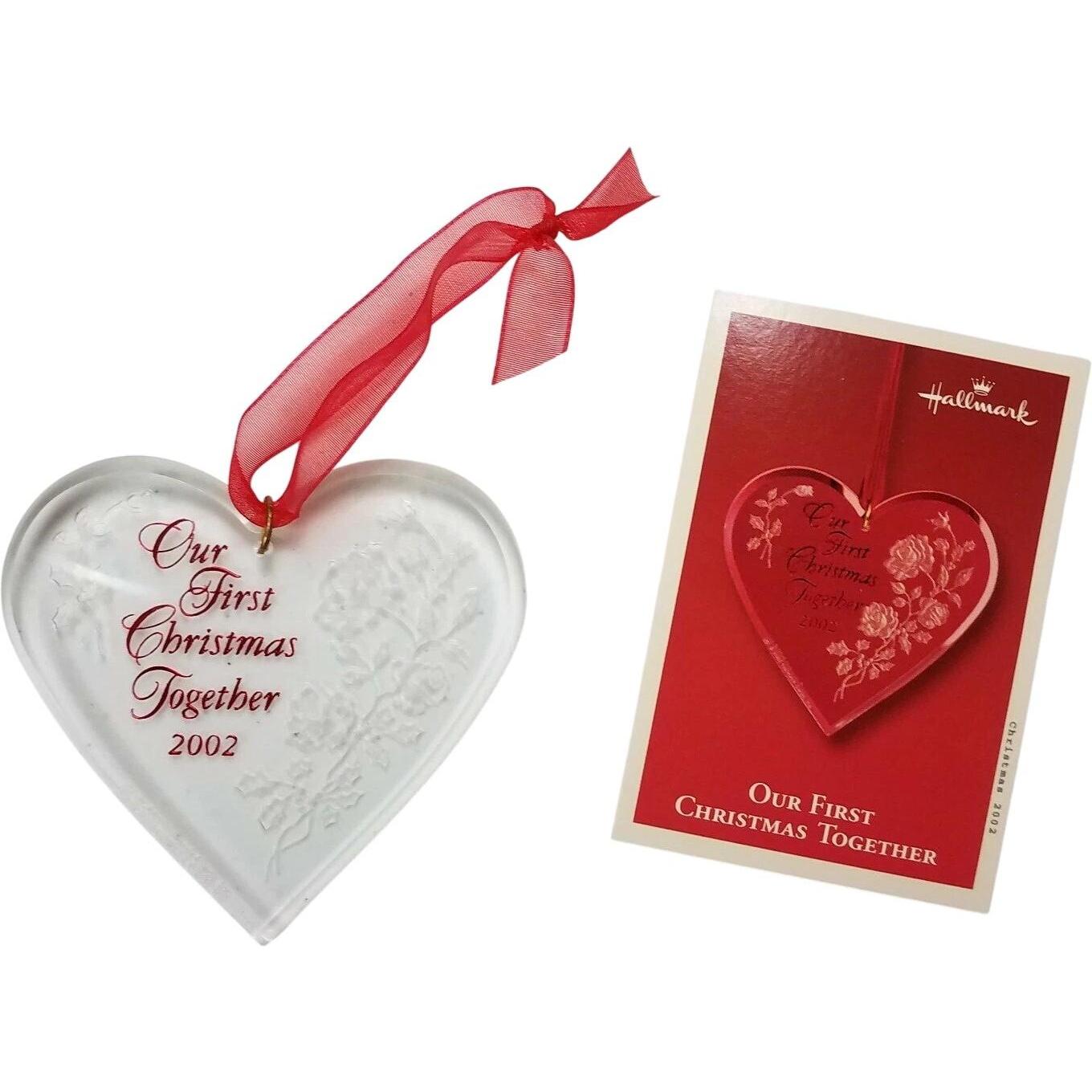 Celebrate the joy of a shared holiday season with the 2002 Our First Christmas Together ornament from Hallmark's Our First Christmas series. This elegant acrylic heart features the etched sentiment "Our First Christmas Together 2002" adorned with delicate floral designs. Measuring approximately 3.25 inches wide, it captures the essence of love and togetherness. The ornament is in mint condition, complete with its original box and dated 2002. Please note, this ornament does not require batteries, cords, or light strings.