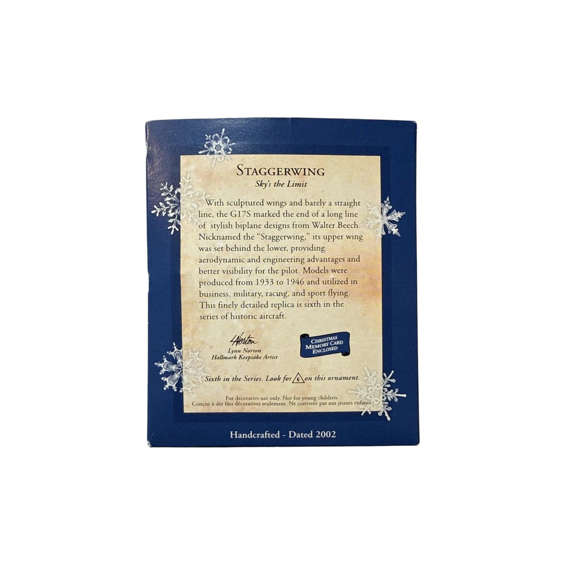 Experience vintage air racing elegance with the 2002 Staggerwing (Sky’s the Limit) ornament—the sixth release in Hallmark’s aviation-themed Sky’s the Limit series. This beautifully sculpted replica of the famed Beechcraft Model 17 Staggerwing celebrates the innovation of 1930s aviation. It features a spinning propeller and functional turning front wheels. Designed by Lynn Norton, this collectible measures approximately 3½″ wide by just under 1″ high, and comes in its original box with hang tag—no power required, ready to hang and display.