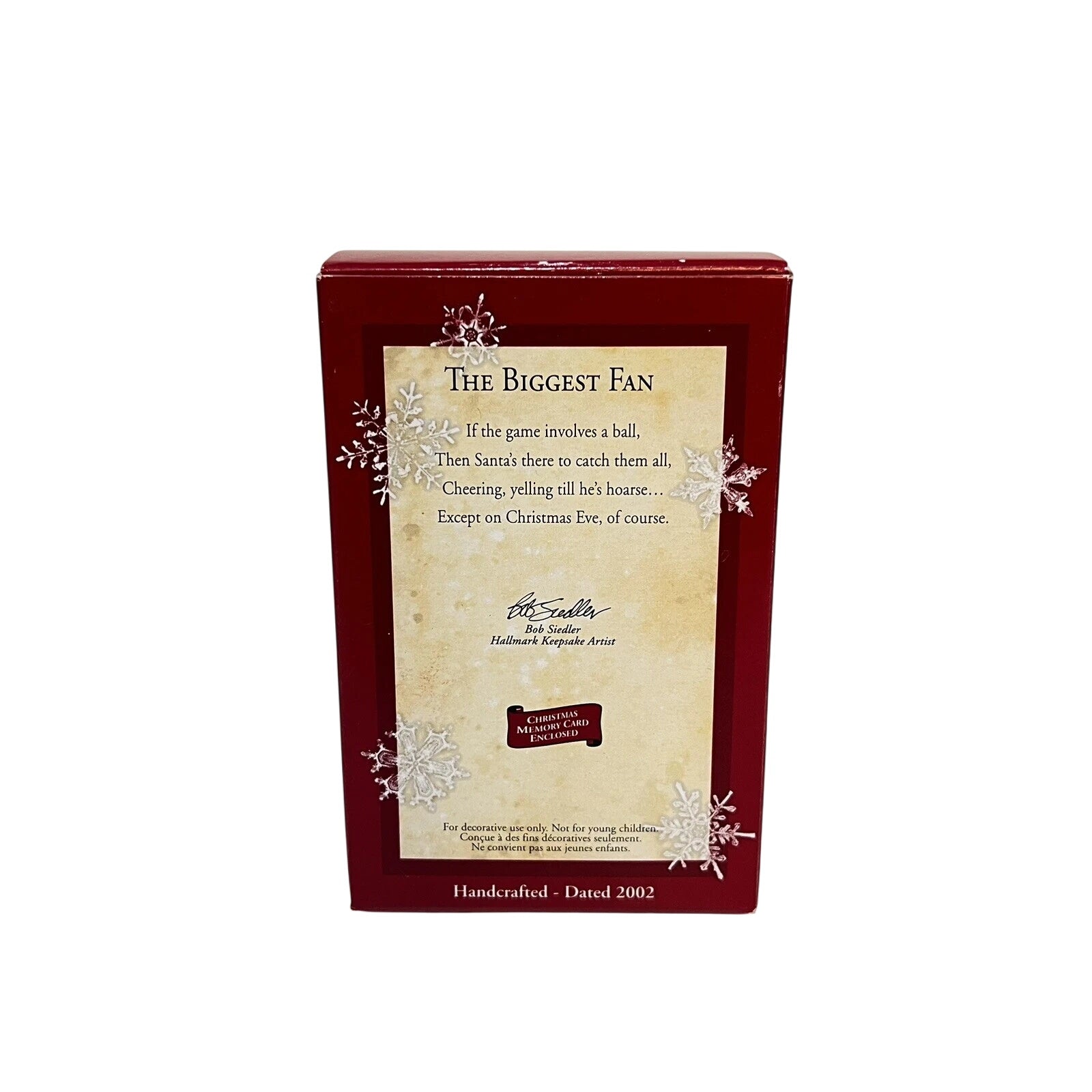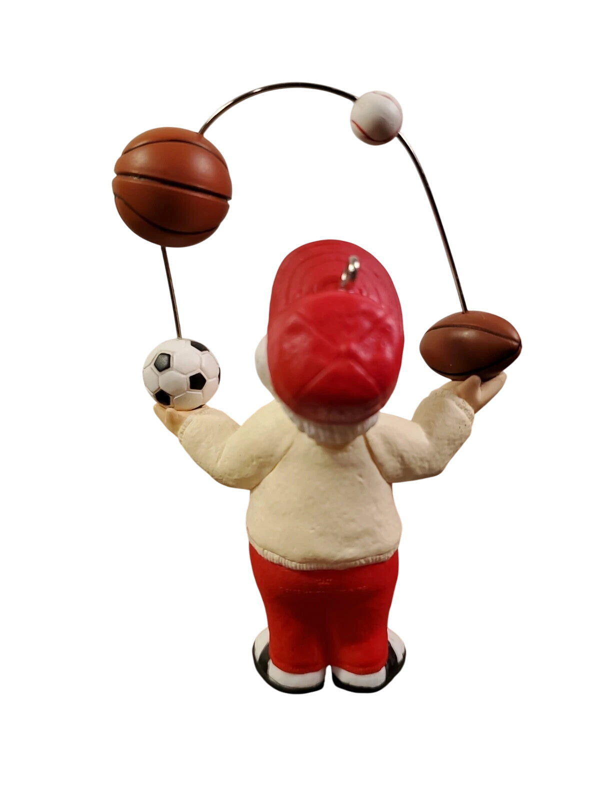 For the ultimate sports enthusiast, the 2002 “The Biggest Fan” ornament by Hallmark is a playful tribute to every ball-game lover. The figural design features Santa dressed as a “#1 Fan,” juggling a football, baseball, basketball and soccer ball — showcasing his all-sports loyalty. With cheerful colour and dynamic posture, it’s perfect for decorating the tree of any sports fan, coach, or team supporter and fits nicely into a “sports” theme or holiday keepsake collection.