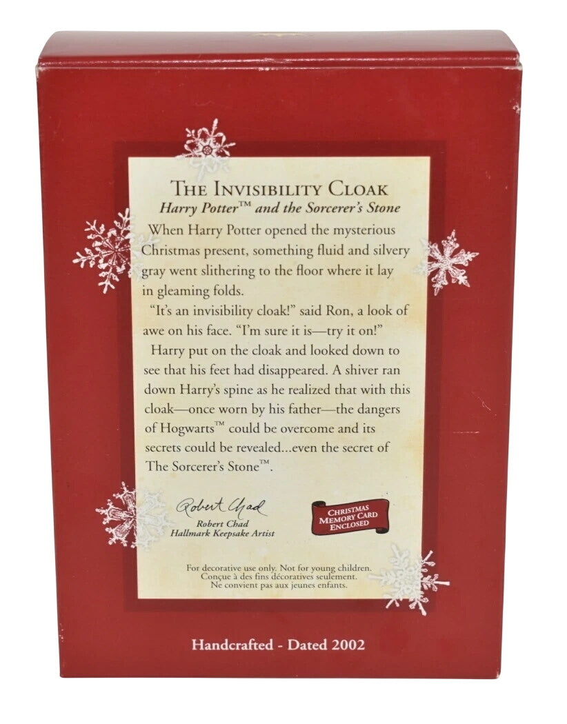 This 2002 Hallmark ornament features Harry Potter snug beneath his silvery invisibility cloak, depicted mid-motion as he begins to fade from sight. Crafted in hand‑painted plastic (to resemble pewter and fabric), the piece measures approximately 3½″ tall and 4″ wide, and arrives in its original red Keepsake box with tag. Created by artist Robert Chad, this static collectible requires No Power Needed, allowing immediate display upon unboxing.