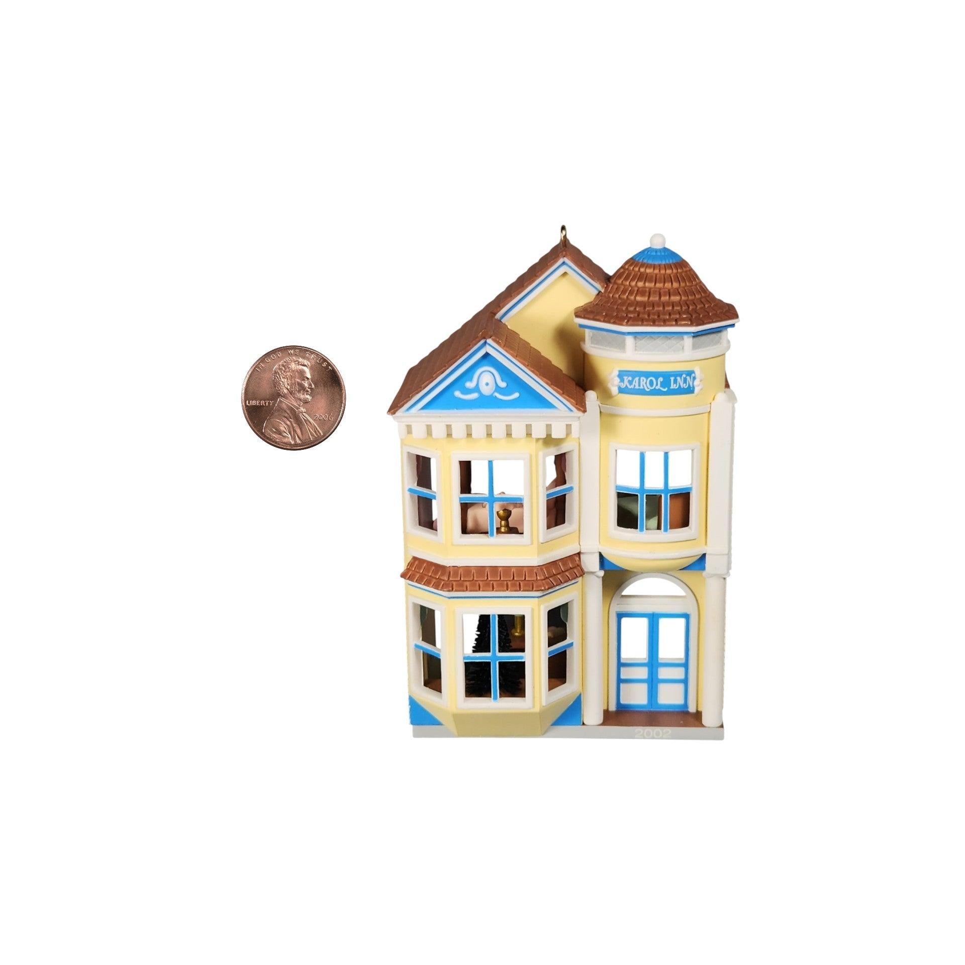 This charming 2002 edition of the Hallmark Keepsake ornament features “Victorian Inn” — #19 in the Nostalgic Houses & Shops series. The design showcases a beautifully detailed yellow-and-blue three-story Victorian style inn with a round turret, ornate trim, and welcoming holiday décor. This collectible comes in its original box (box condition may vary) and includes the tag. No batteries, cords or light strings are required — simply hang and enjoy this perfect piece for fans of Victorian architecture or historic house scenes.