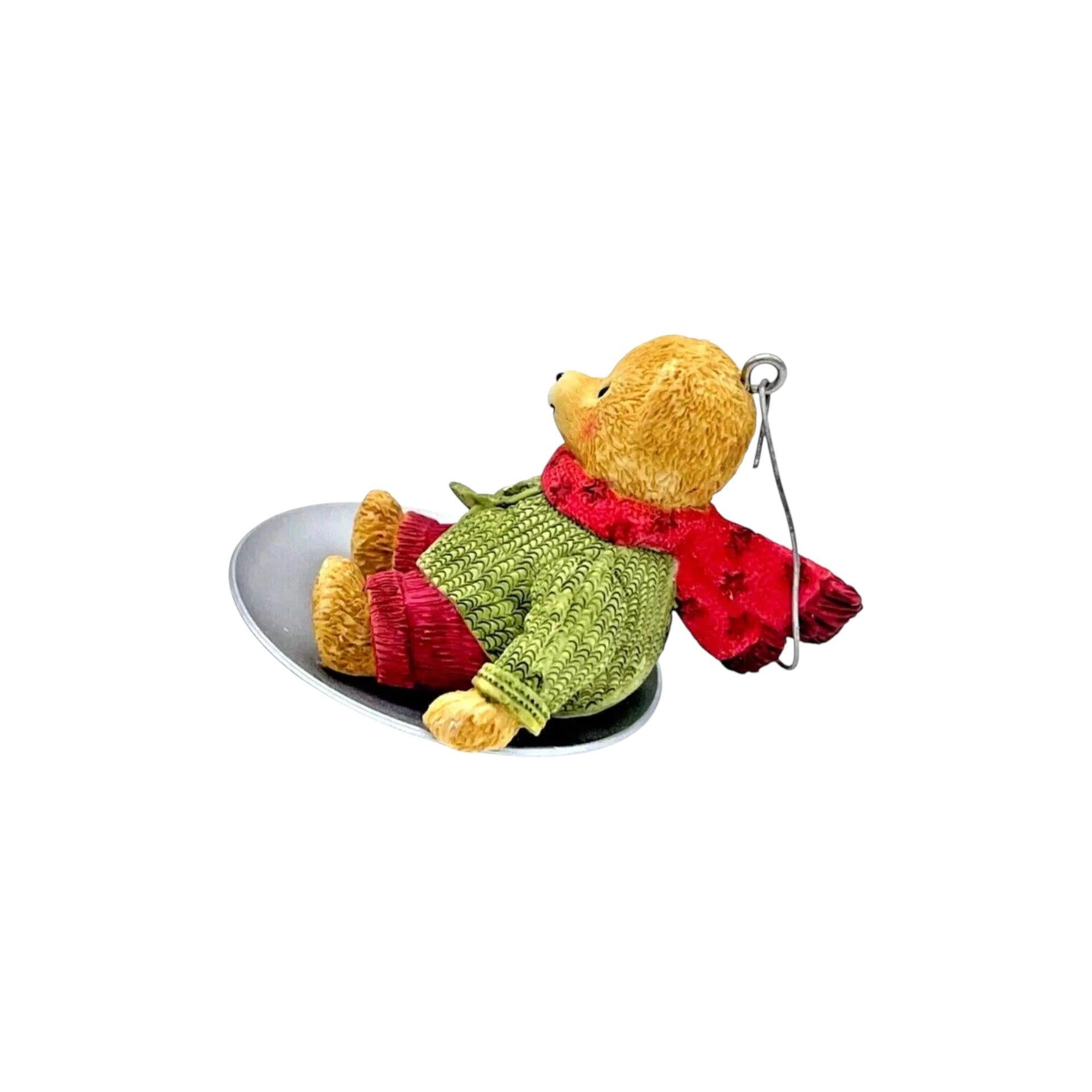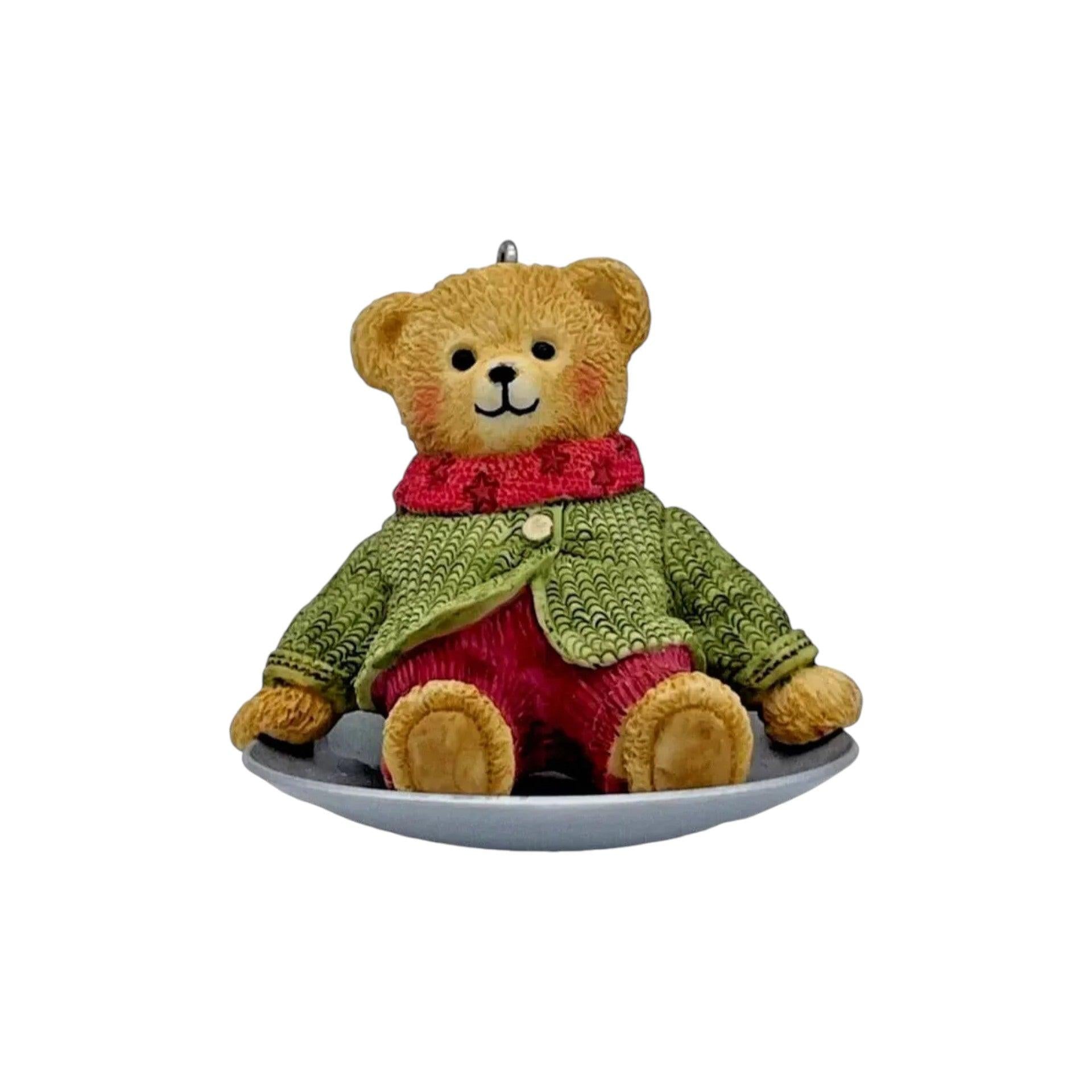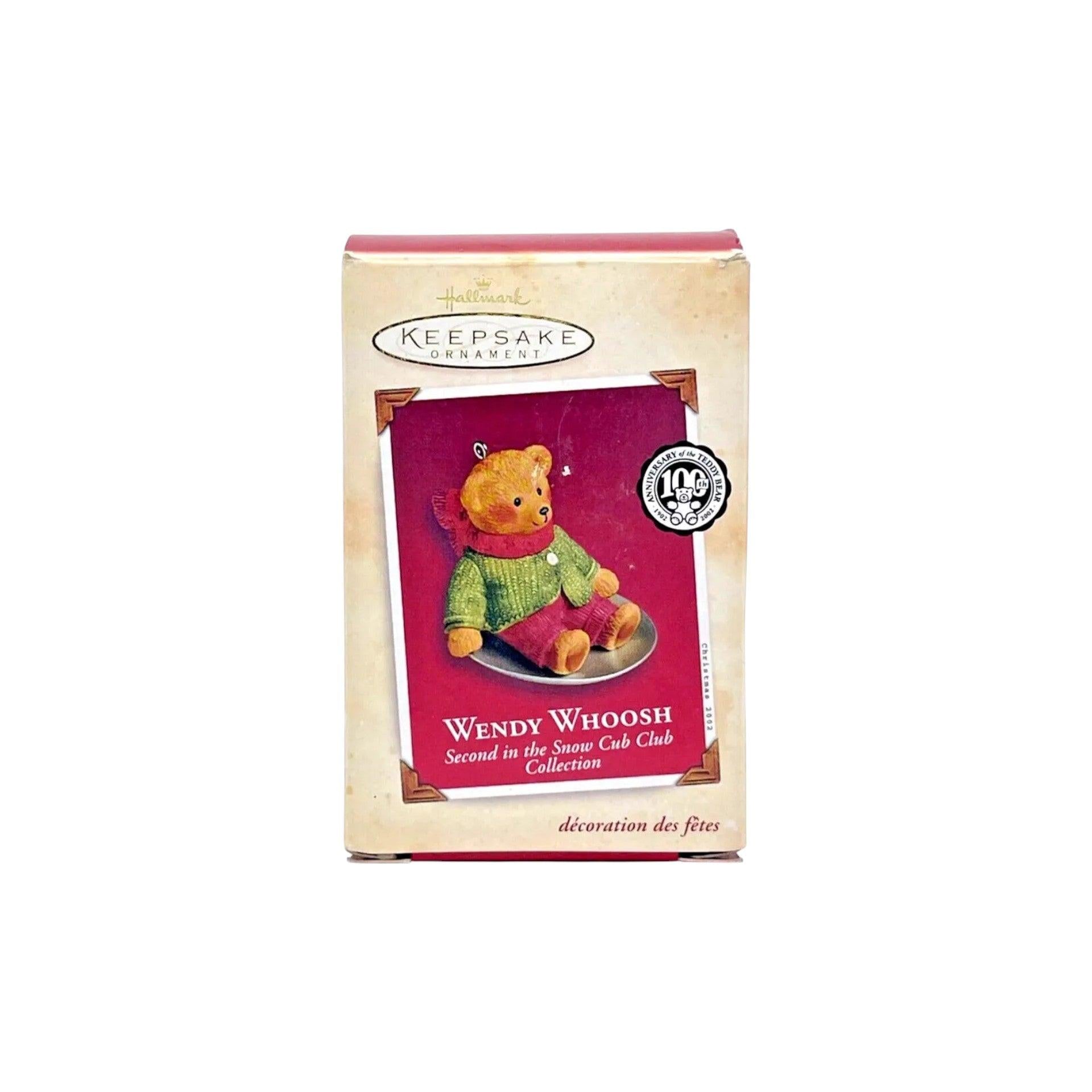 Meet 2002 Wendy Whoosh, the second ornament in Hallmark’s Snow Cub Club 2002 Reach promotion, featuring a cheerful bear cub ready to frolic through winter snow. Wendy Whoosh is captured with sled or snow-details (bear in motion), crafted with painted mixed materials by artist Ed Seale. Measures about 2.018″ H × 2.186″ W × 2.82″ D, includes original box when available, and requires no batteries, cords, lights, sound or motion — just vintage winter charm for your tree.