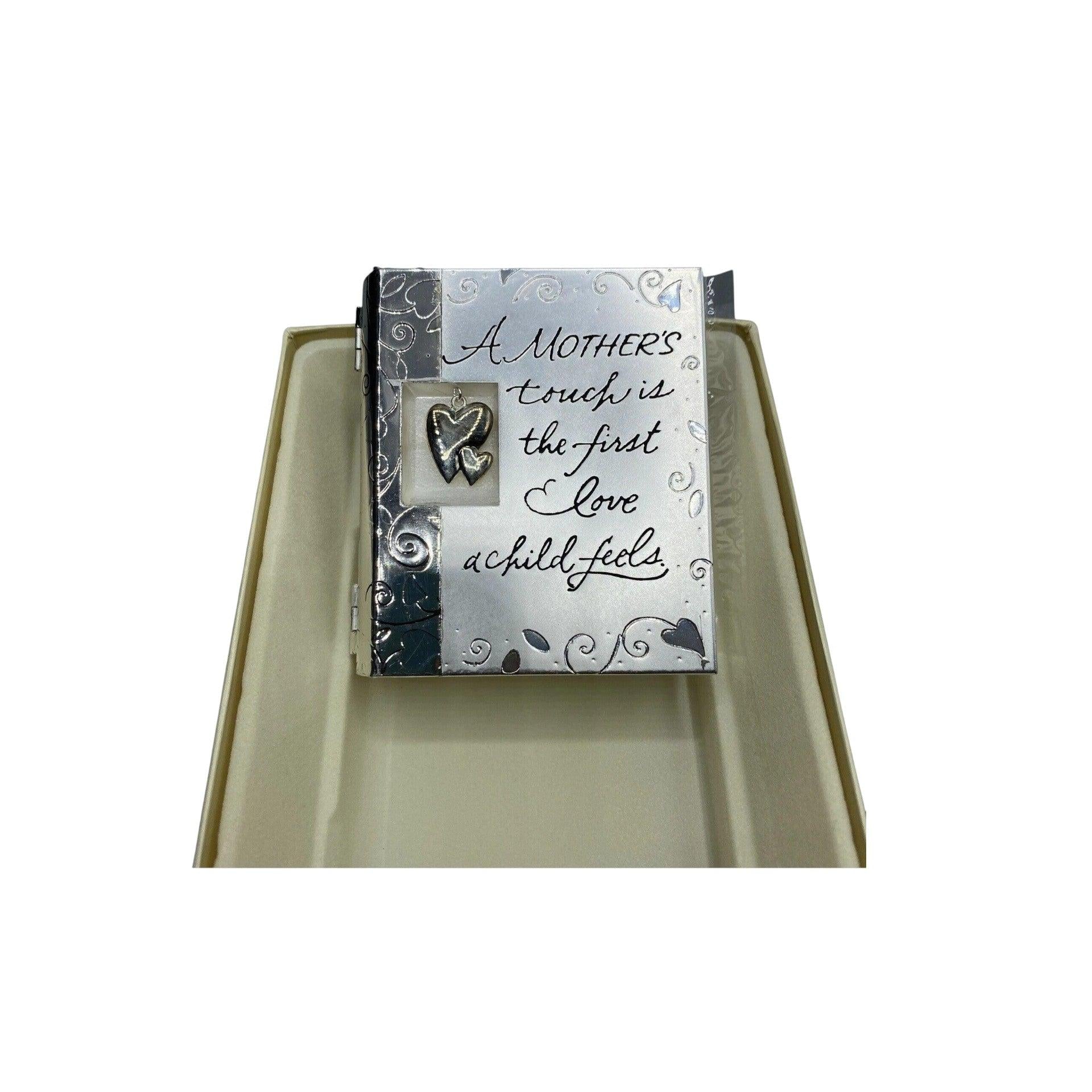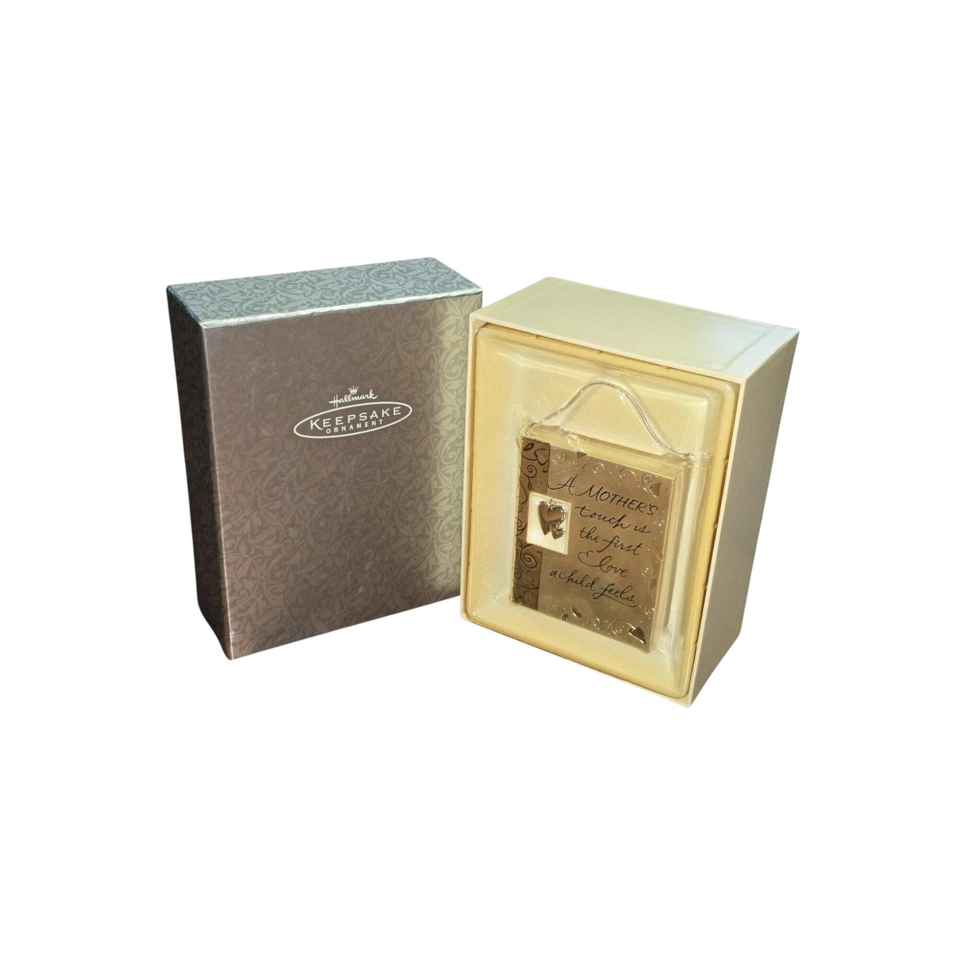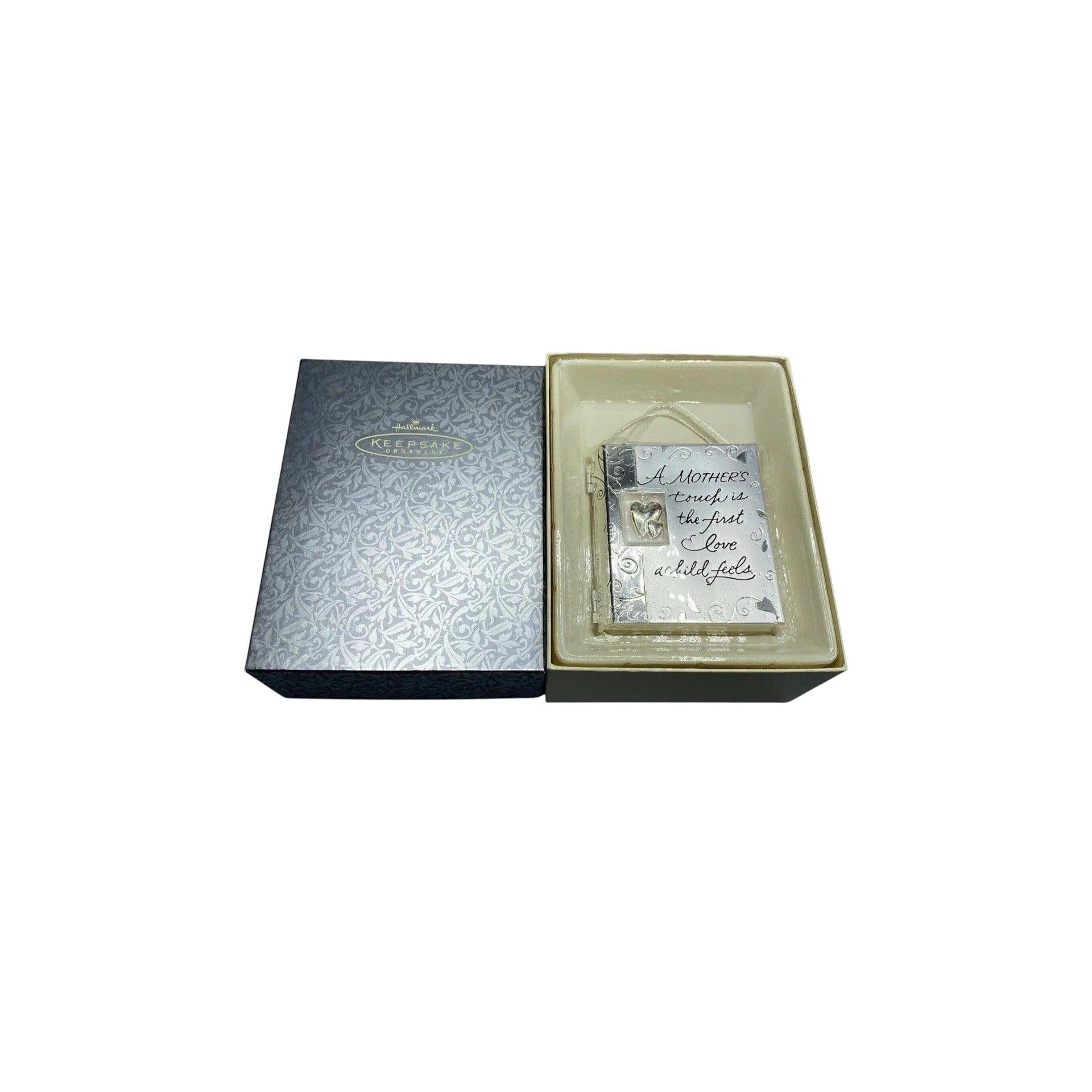 Celebrate the enduring bond between a mother and child with the 2003 Hallmark Keepsake ornament, A Mother’s Touch—a cherished piece from the Heart of Motherhood collection. This elegant book-shaped keepsake folds open to reveal heartwarming imagery and is lovingly inscribed with: “A Mother’s touch is the first love a child feels.” Designed by Joanne Eschrich, it is silver‑plated with detailed etchings and holds a timeless message of maternal love—no batteries or lights needed.
