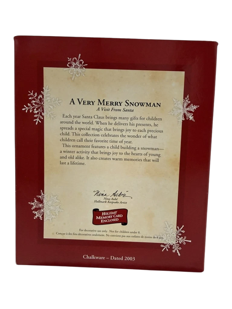 Add a touch of nostalgic warmth to your holiday décor with the 2003 A Very Merry Snowman ornament, part of Hallmark’s A Visit From Santa collection. This delightful chalkware-inspired piece features a young boy lovingly placing the final touches on a snowman—complete with twig arms, a jaunty hat, and a festive pine sprig. Crafted in detailed resin with a textured cracked finish, this collectible comes with its original red Keepsake box, hanging cord, tag, and protective insert. No power required—perfectly delightful in its classic static form.