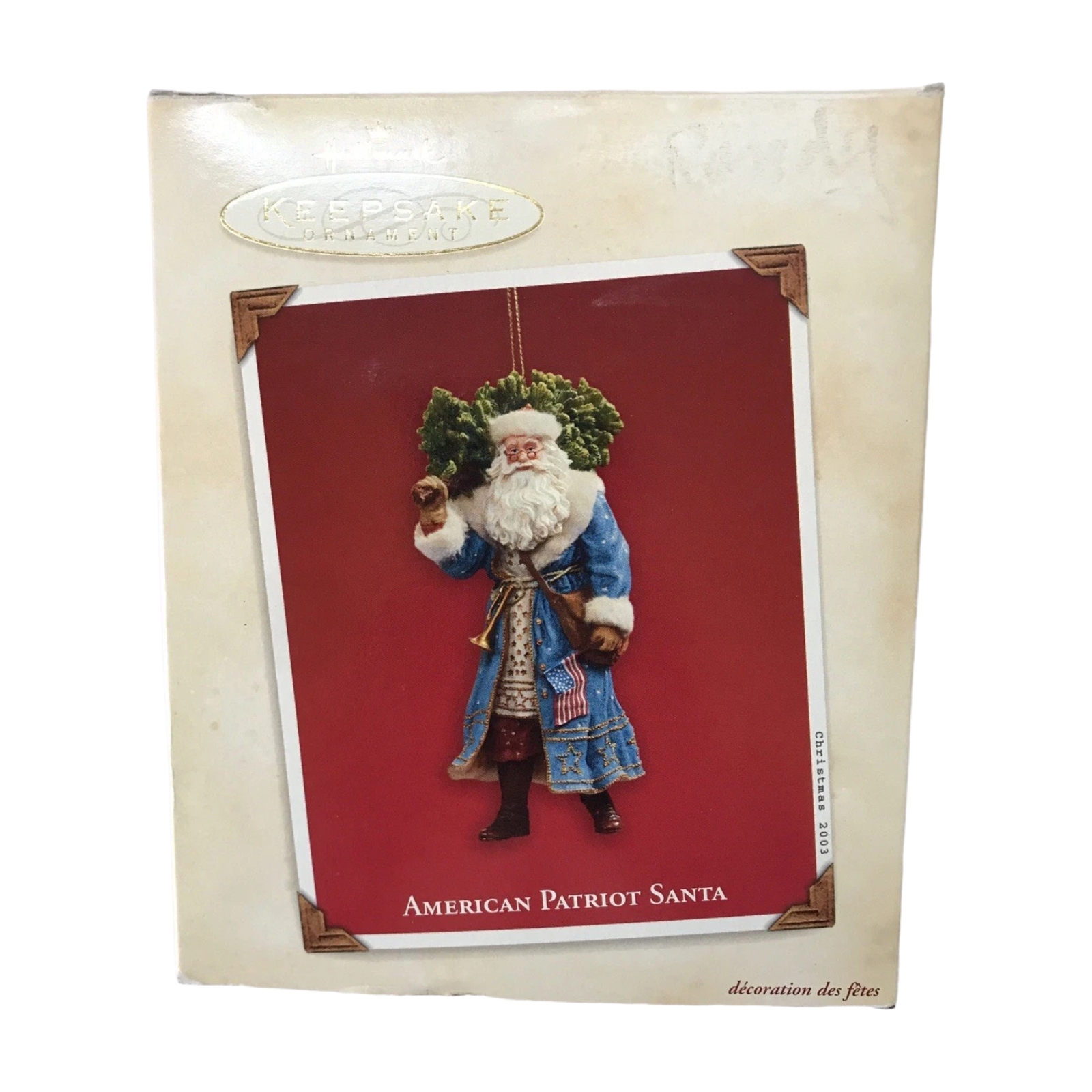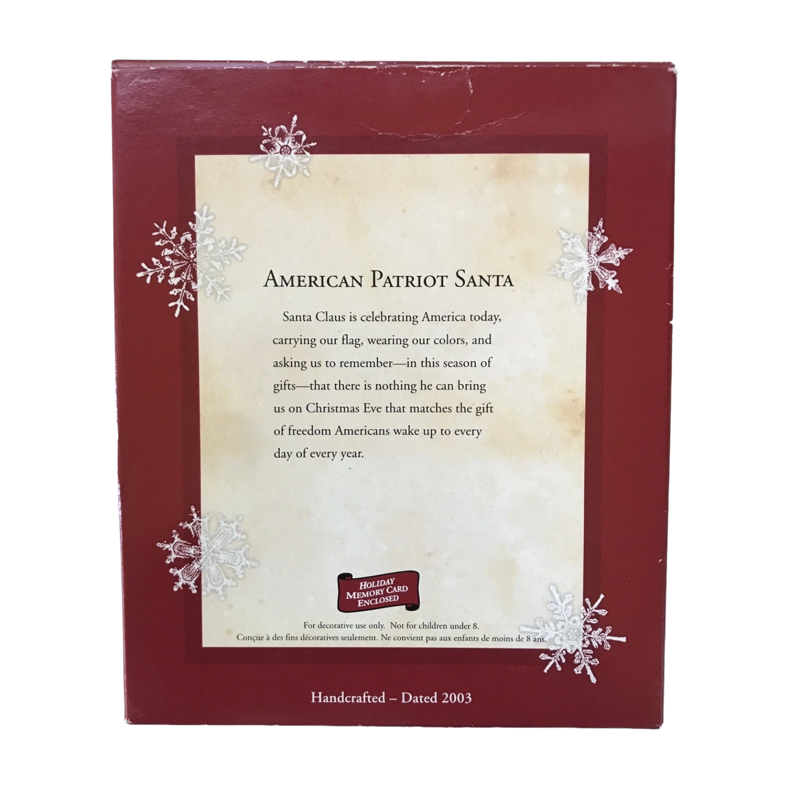 Celebrate the spirit of patriotism and holiday cheer with this 2003 edition from Hallmark. The ornament depicts Santa Claus carrying a full Christmas tree over his shoulder, merging classic holiday imagery with a subtle nod to American pride. At approximately 4.757″ high, this piece features rich hand-painted details and a well-sculpted form that stands out on any tree. Ideal for those who love Santa-themed ornaments, patriotic décor, or collectible holiday pieces, it blends nostalgia with craftsmanship.