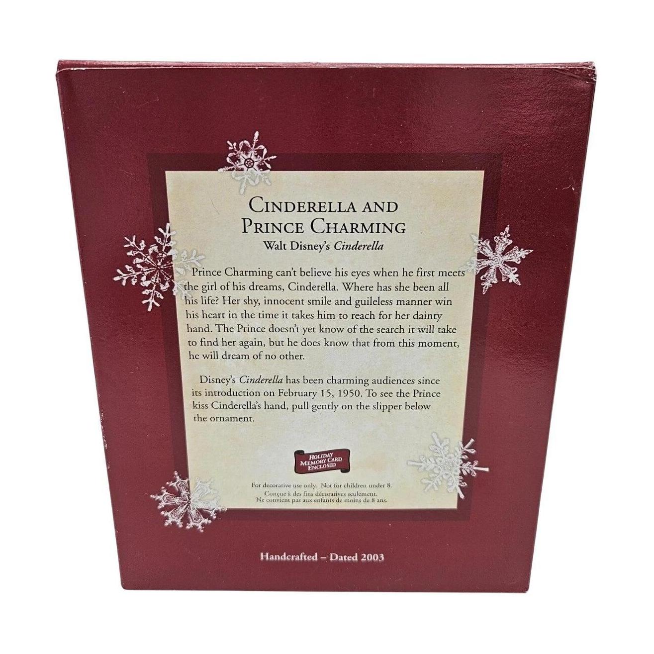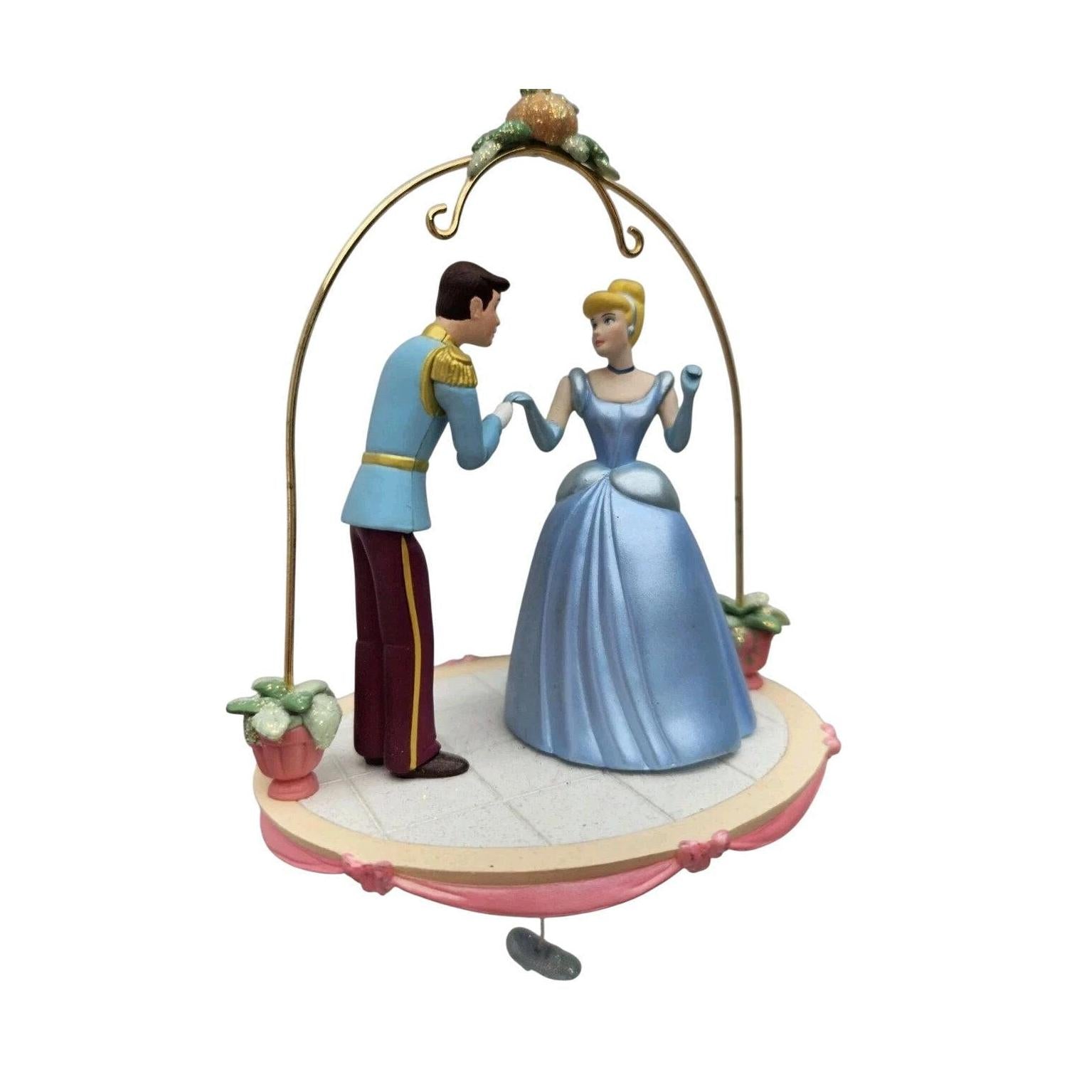 Recreate the magical moment when Cinderella meets her prince with this 2003 Hallmark Keepsake ornament featuring Cinderella in her iconic blue gown, poised as Prince Charming bows to kiss her hand beneath a graceful arch. The elegant scene includes a dangling glass slipper—pull it gently and watch the sweet hand-kiss in motion. Delivered in its original box with tag and instructions, this enchanting ornament requires no batteries—just pull the slipper to activate motion.