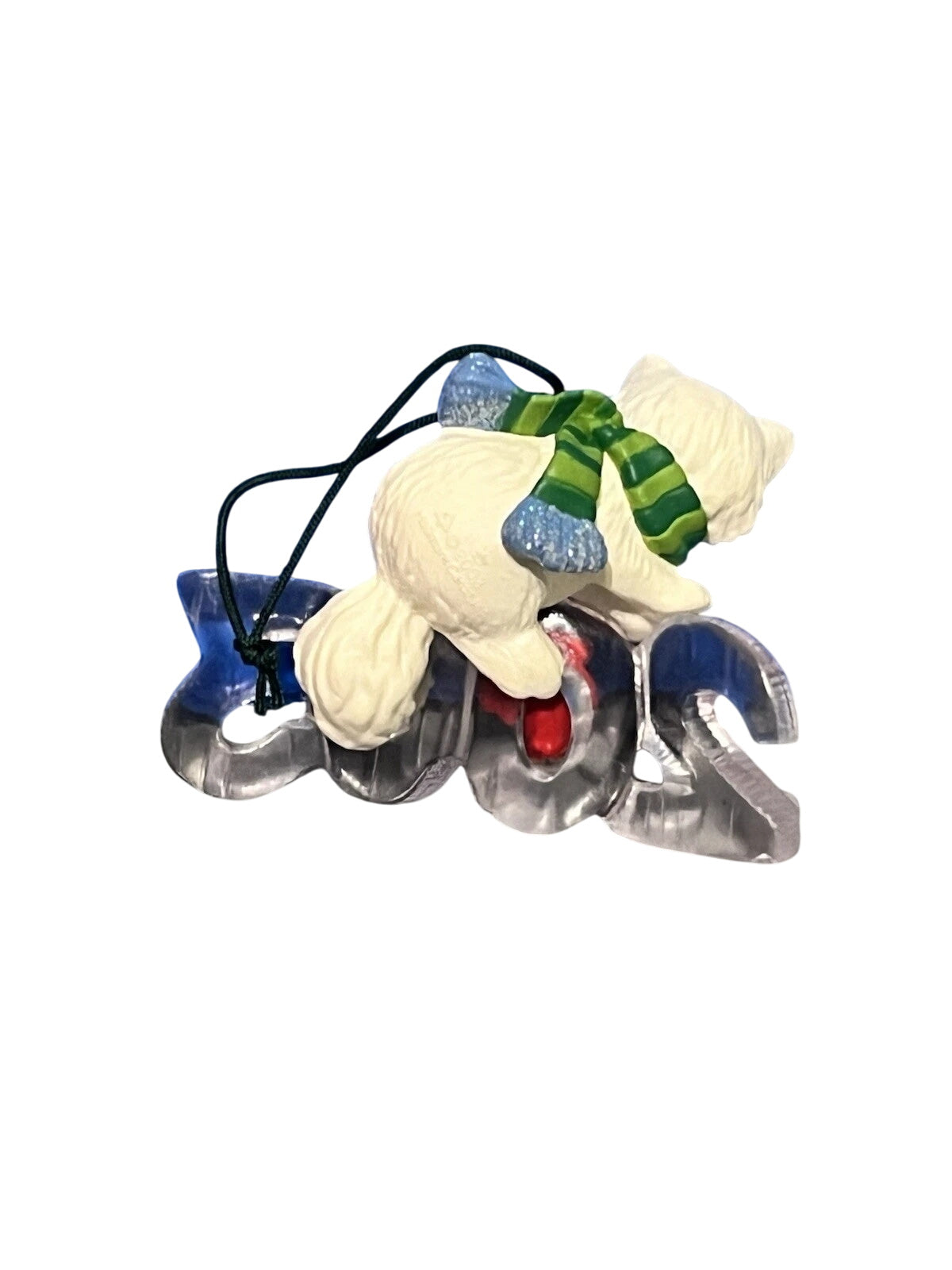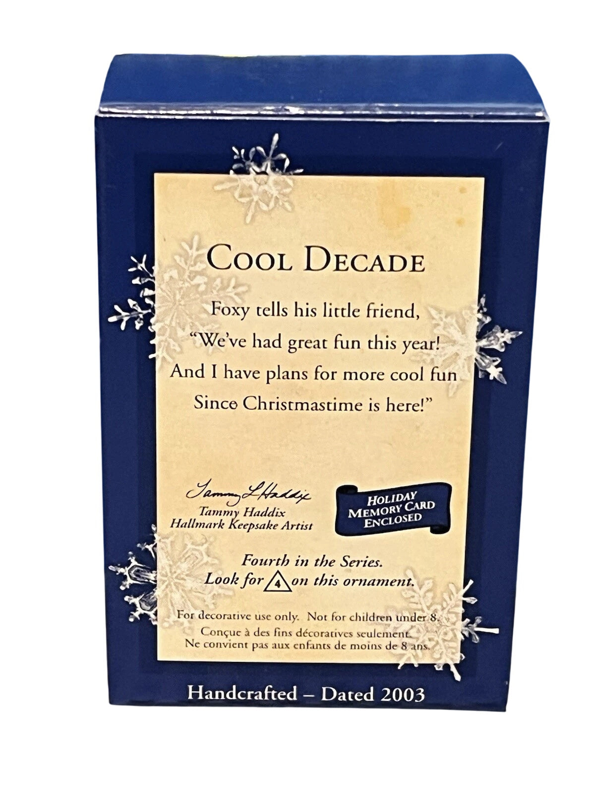 Embrace the chill of the early 2000s with the 2003 Cool Decade #4 – Fox ornament (Item QX8079). This charming keepsake portrays a sleek arctic fox carved from ice, perched atop frosted numerals reading “2003.” Designed by Tammy Haddix, the ornament measures approximately 1.8″ H × 2.4″ W × 1.3″ D, comes in its original boxed packaging with hang tag, and requires no batteries or lights—ready to hang and celebrate the new millennium.