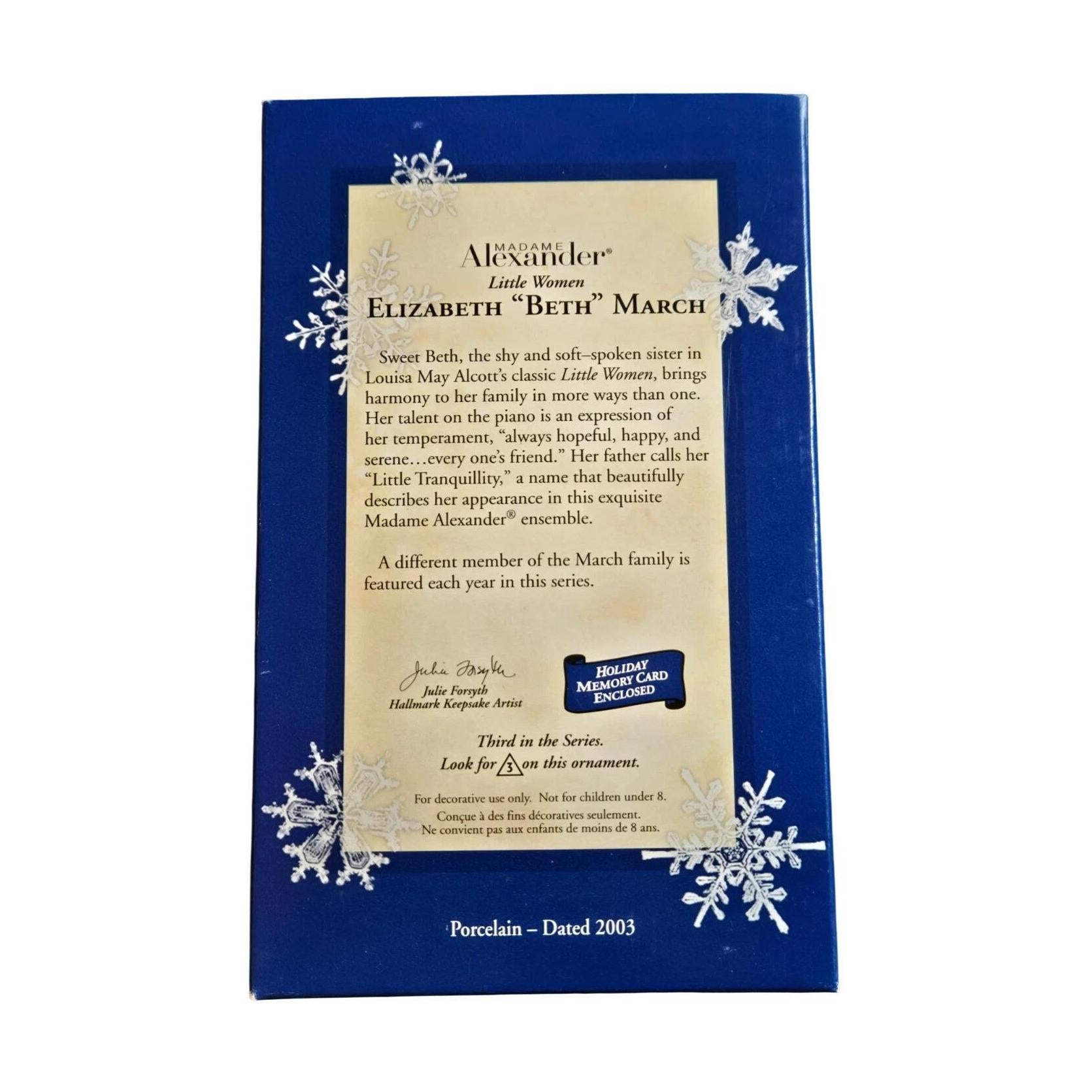 Meet Elizabeth "Beth" March, the serene third sister from Hallmark’s Madame Alexander Little Women series (2003, QX8187). Sculpted by Julie Forsyth in porcelain, this collectible ornament depicts Beth in a sky-blue winter coat, bonnet, and lace-trimmed dress. Standing approximately 4″ tall, she comes Mint in Box with satin ribbon and requires No Power Needed—instantly ready to grace your tree with gentle literary charm.