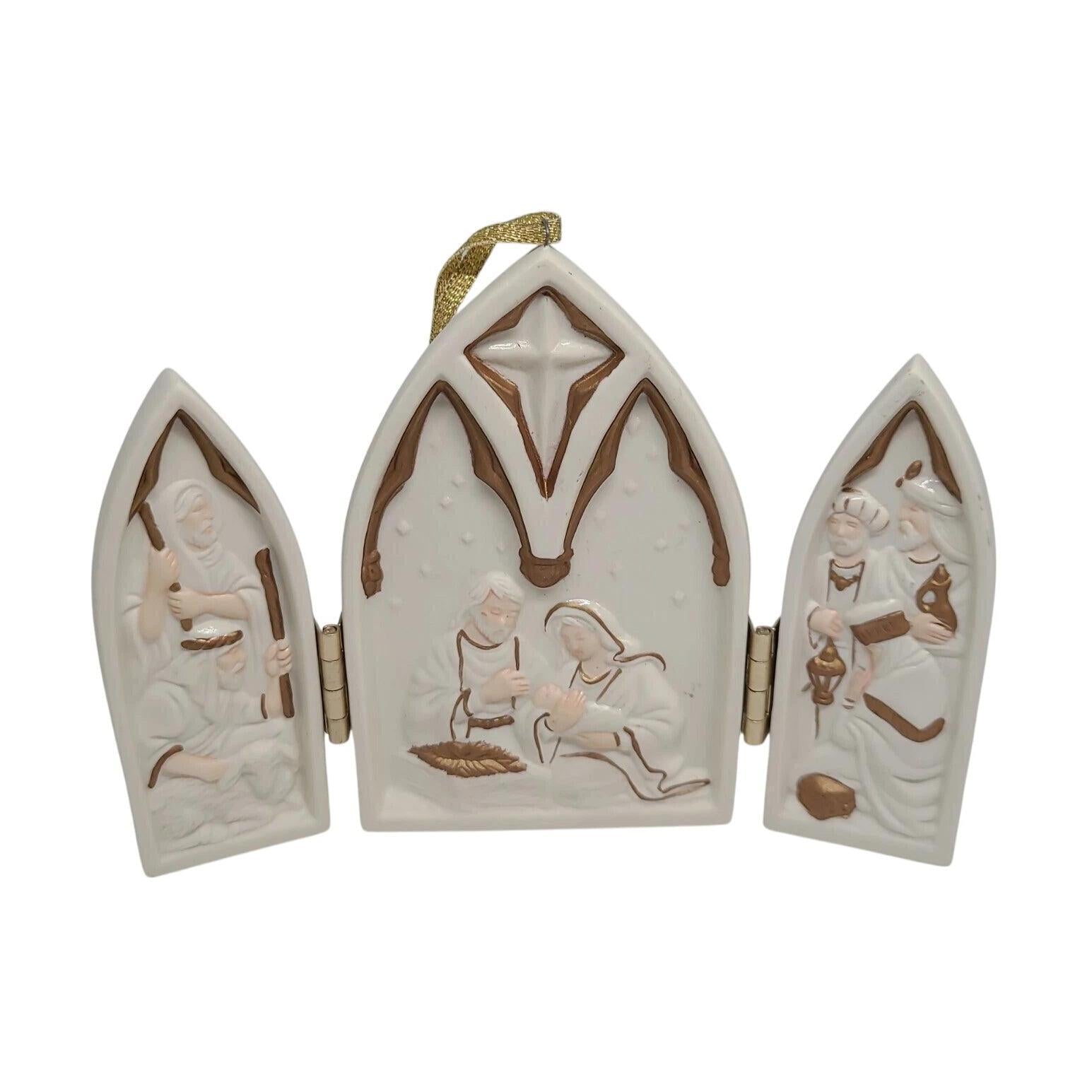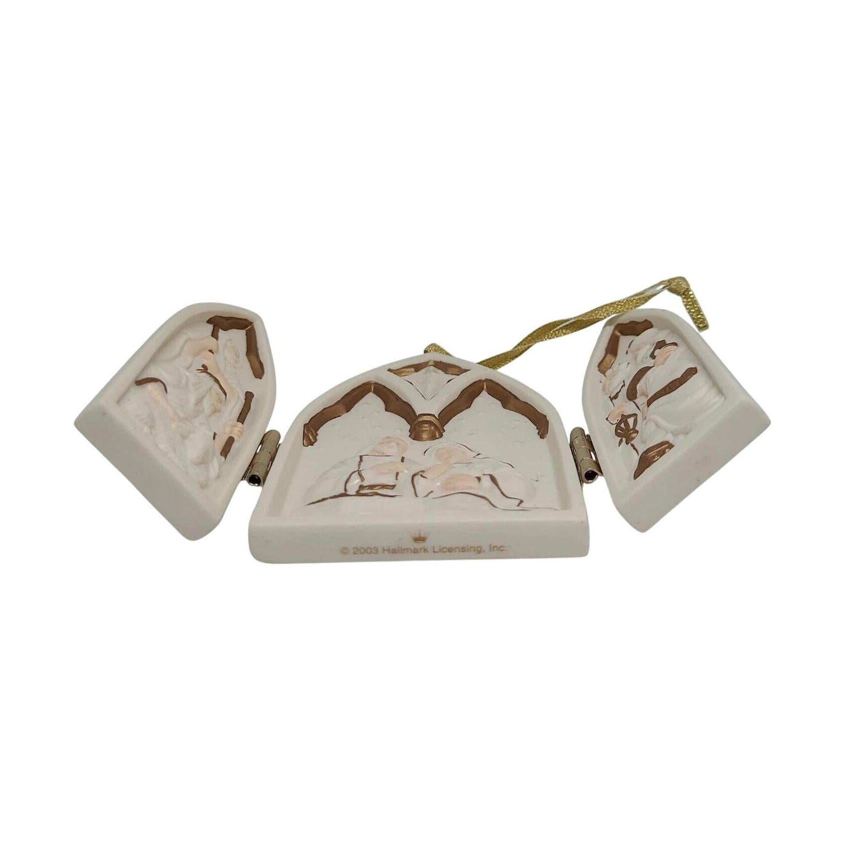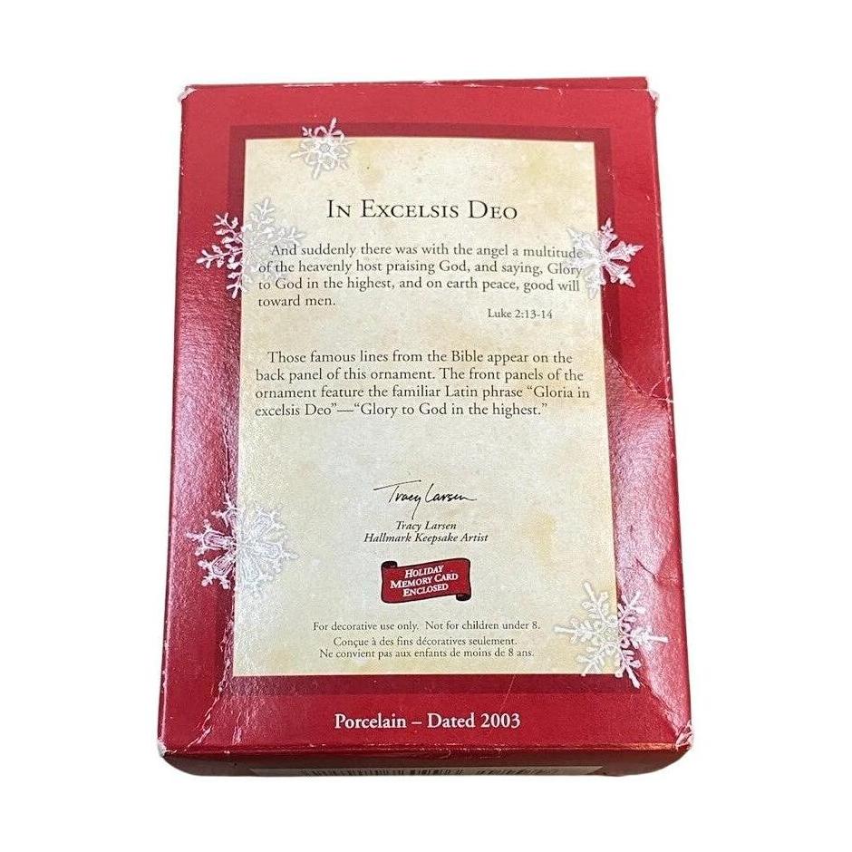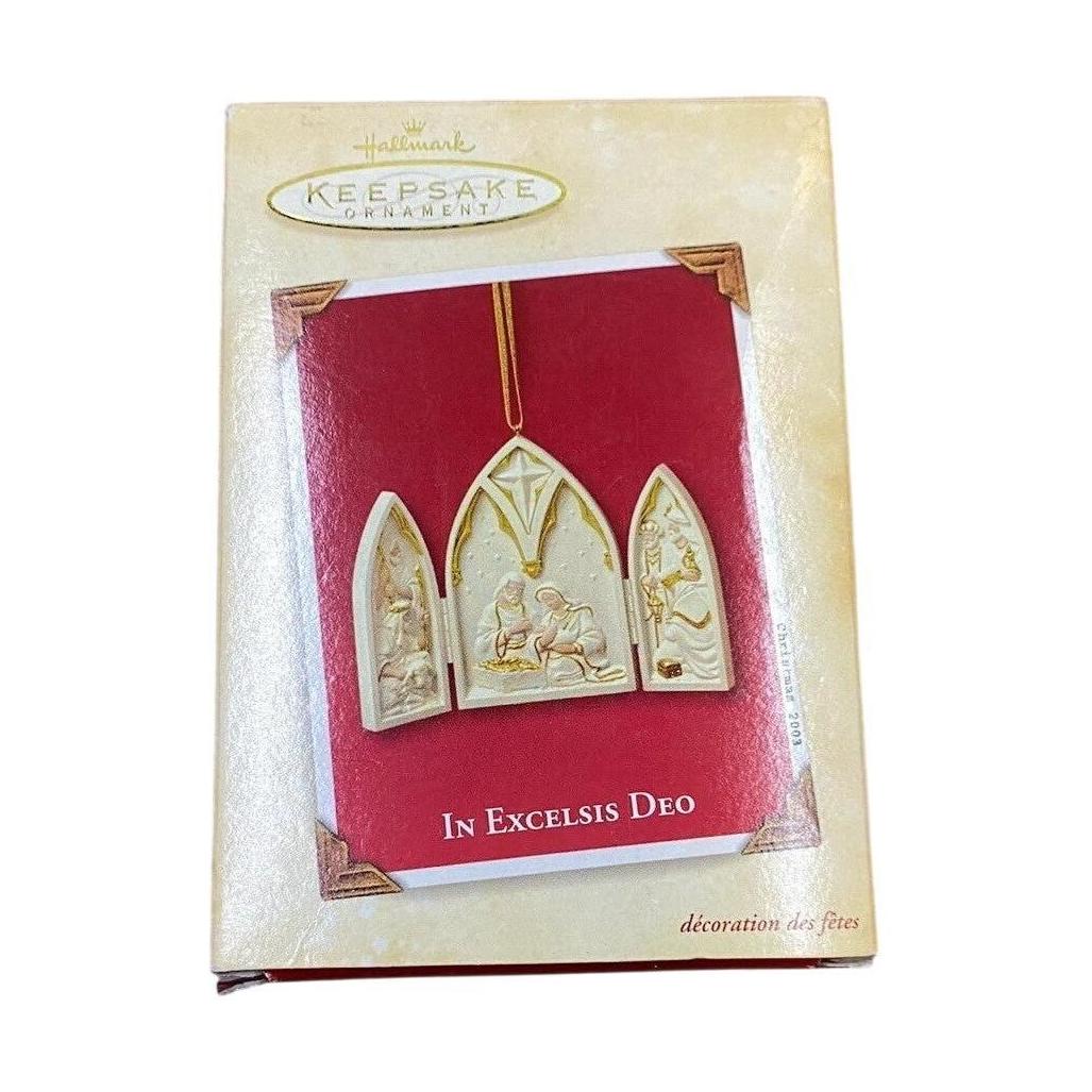 This heartfelt 2003 edition of the Hallmark Keepsake ornament is entitled In Excelsis Deo. The design is a hinged, triptych-style piece in porcelain, featuring the Latin phrase “Gloria in excelsis Deo” (“Glory to God in the highest”) on its front panels. On the back you’ll find a Bible verse, giving it a deeply devotional feel. At approximately 3.84″ high by 2.67″ wide when closed, it’s a meaningful addition to a religious or Christmas tree collection—especially for those who appreciate faith-based ornamentation.