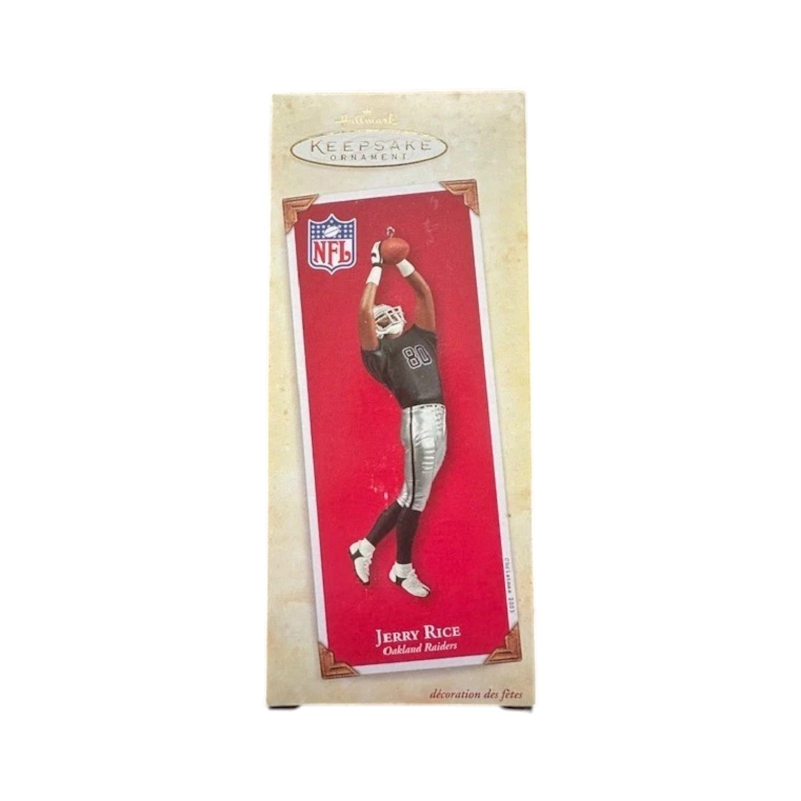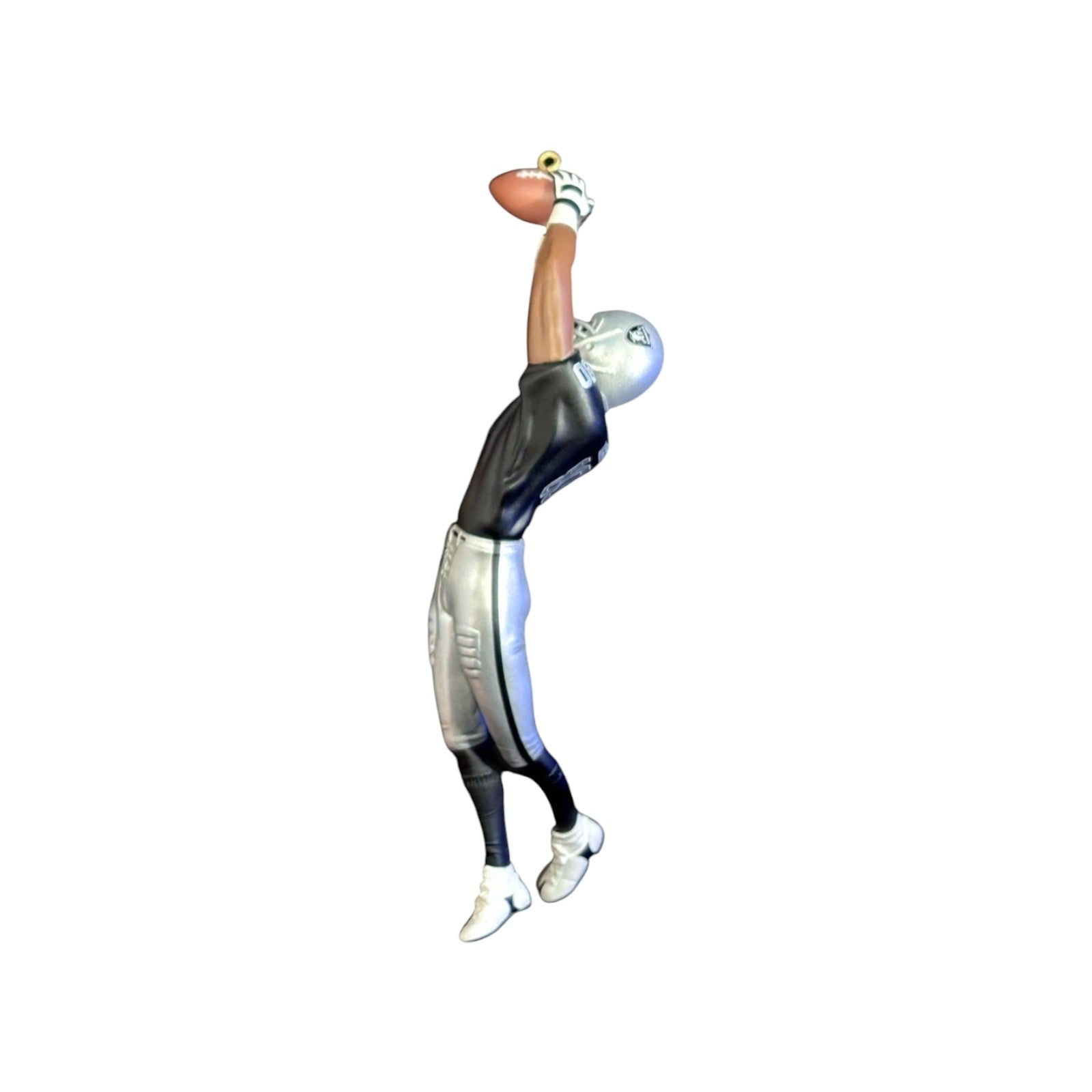 Pay homage to NFL icon Jerry Rice in his Oakland Raiders era with this 2003 Football Legends ornament. Captured in a dynamic leaping catch pose, this finely crafted resin-style keepsake stands approximately 6″ tall and comes complete with its original box—no batteries or accessories needed, just hang and enjoy. It's a striking collector’s item that blends holiday décor with football legacy.