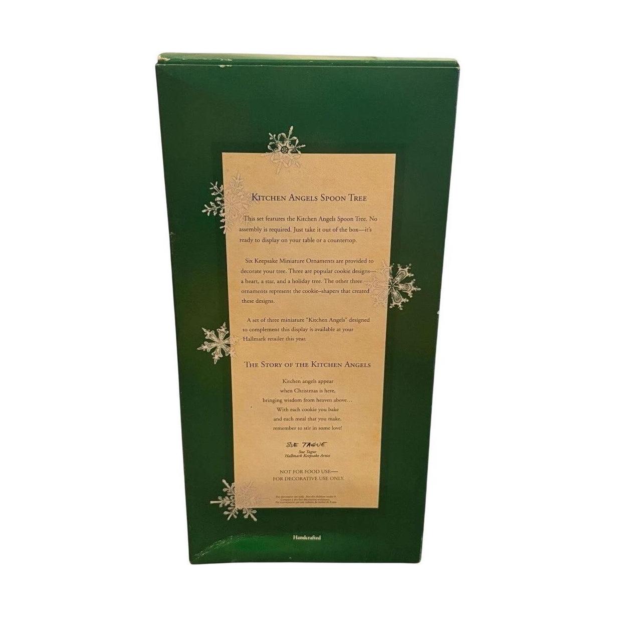 This 2003 tabletop-display from Hallmark Keepsake features a charming “Kitchen Angels” theme: a small spoon-shaped tree that holds six miniature ornaments—three cookie-design ornaments (a heart, a star, a tree) and three utensil decorations (shapes of cutters/spoons). Designed by artist Sue Tague, the set is intended for display on a counter or shelf—especially suited for kitchen décor or themed collections.