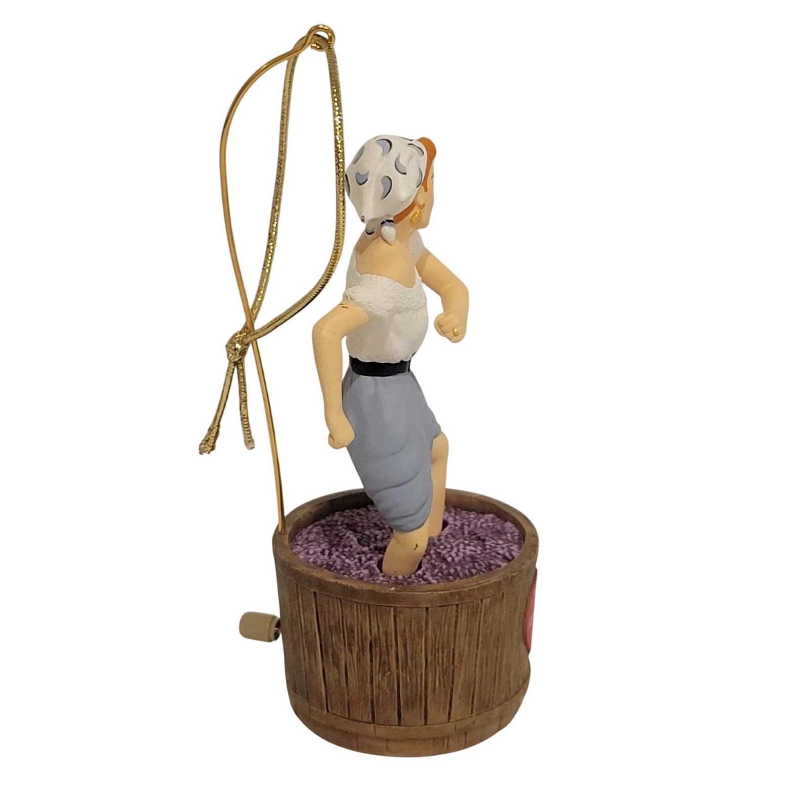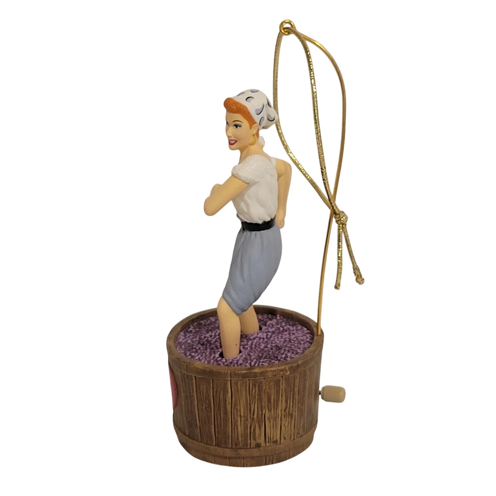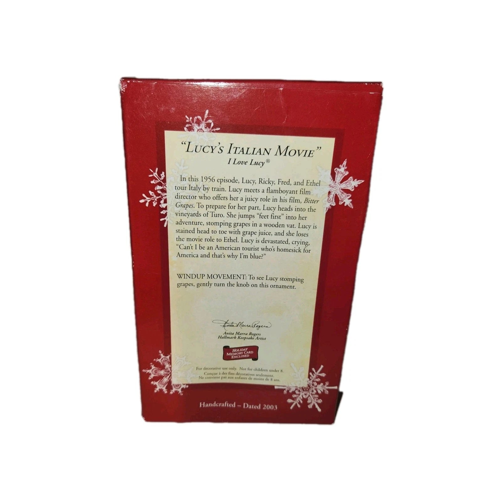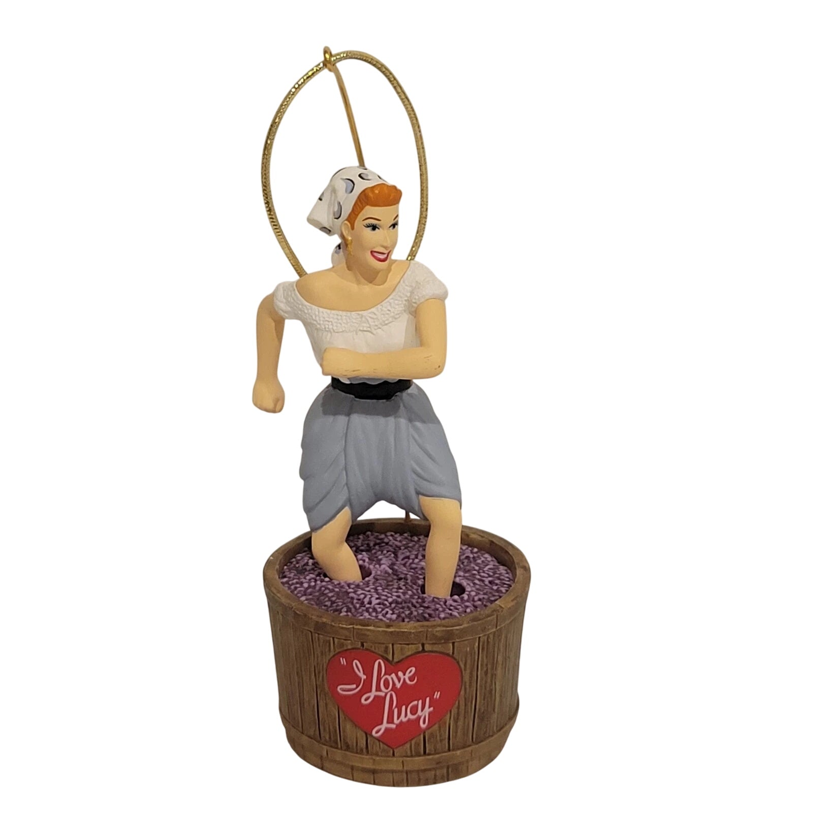 Step into television history with the 2003 Lucy’s Italian Movie Keepsake Ornament—featuring Lucy Ricardo’s delightfully chaotic attempt at grape stomping in pursuit of a movie role. Wind her up to relive the moment of humorous mayhem in miniature. Crafted by Anita Marra Rogers and arriving ready to display in Hallmark’s original Keepsake packaging, this animated collector’s piece is perfect for fans of I Love Lucy, vintage TV aficionados, or anyone who cherishes a dash of nostalgia on their holiday tree.