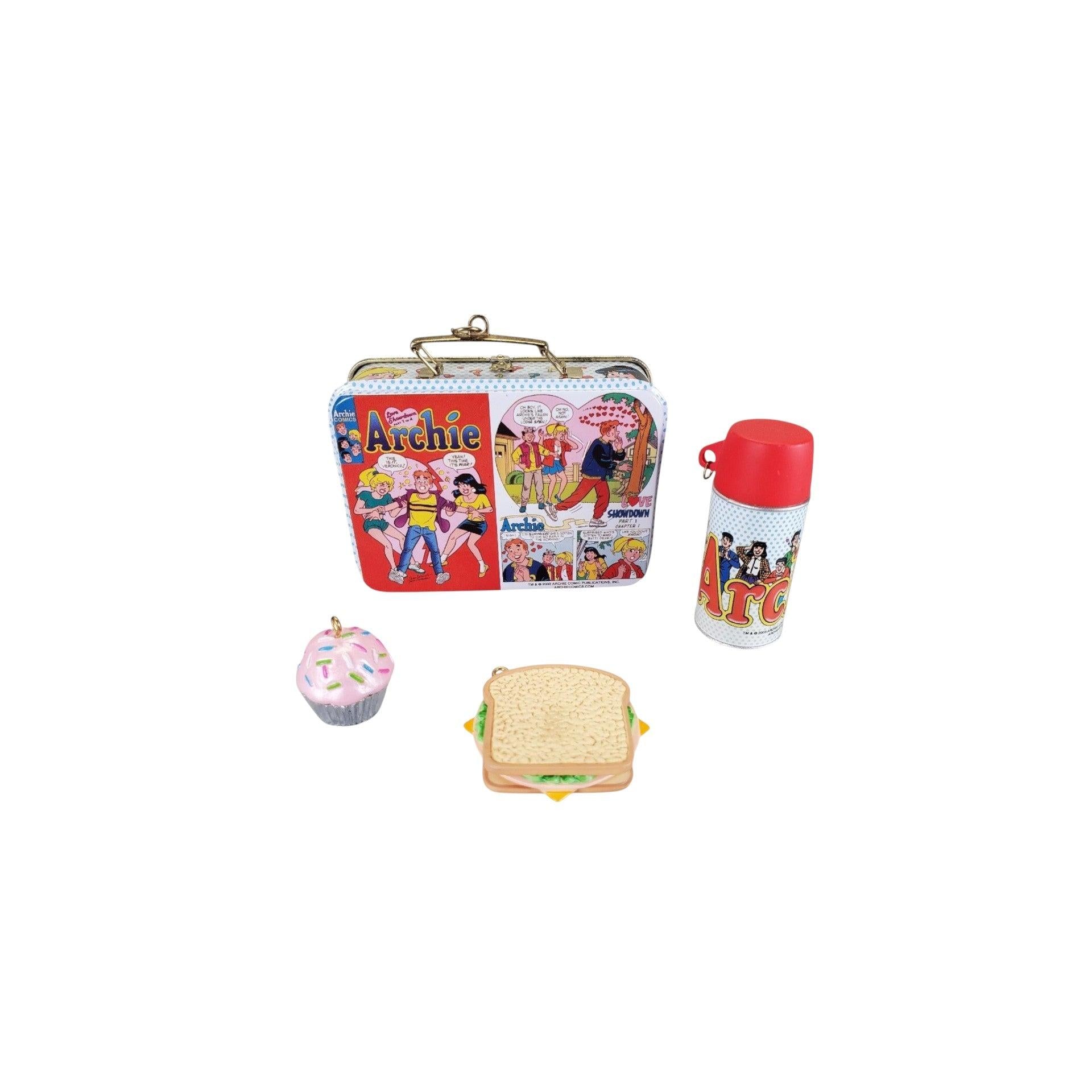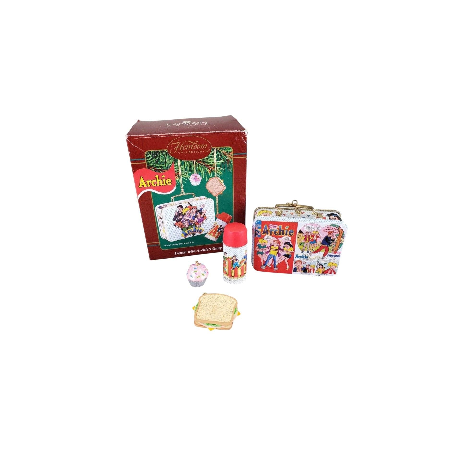 Flash back to Riverdale holiday nostalgia with this 2003 “Lunch with Archie’s Gang” ornament, styled as a tiny retro lunchbox featuring Archie, Betty, Veronica, Jughead, and friends in bright comic-book artwork on the lid. The ornament opens to reveal miniature lunch goodies inside—a little thermos, a sandwich, and a cupcake—making it a playful 3-D keepsake that feels like a childhood lunchroom memory. As issued, it comes in the original Carlton Cards Heirloom Collection gift box with protective insert and tag/label. This is a static ornament with no motion, sound, or lighting, so it does not require batteries, cords, or light strings.