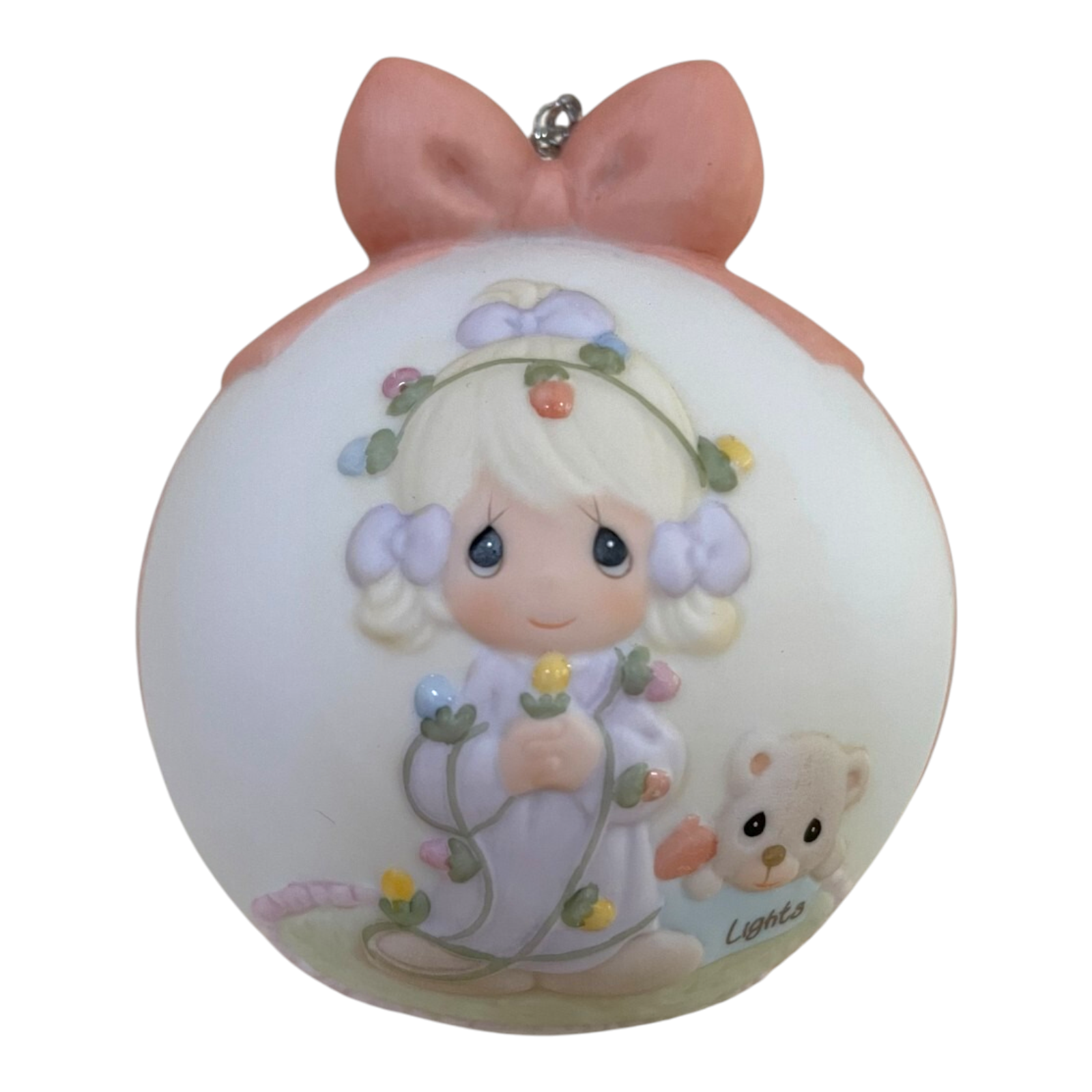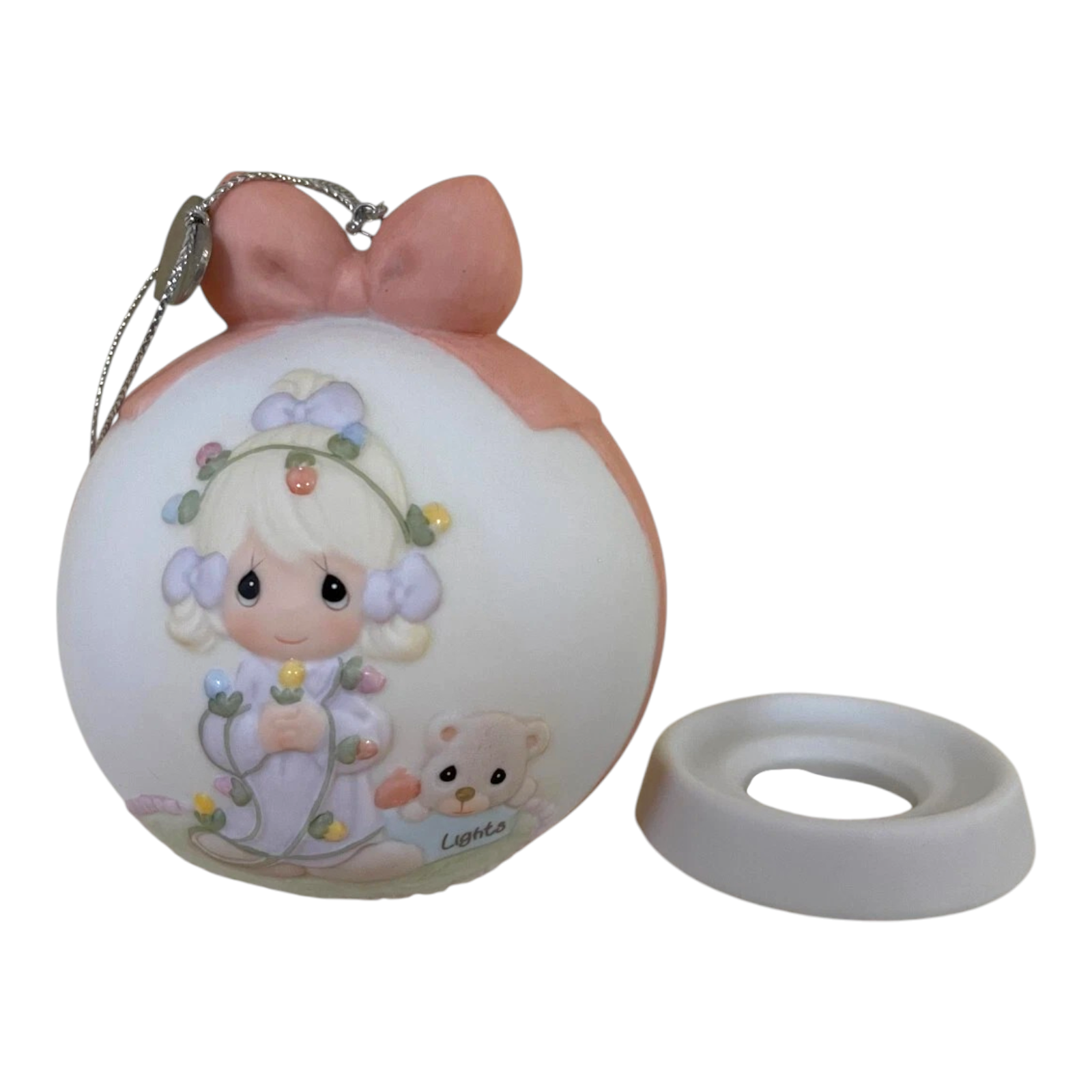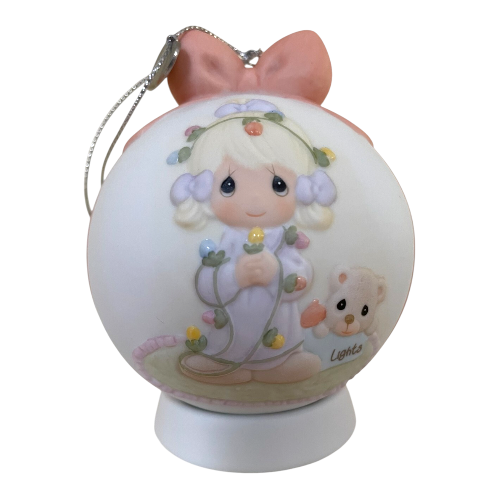 This elegant ornament portrays a delicately styled little angel from Precious Moments in soft pastel colours, holding a glowing candle and standing amidst braided holiday lights — a serene and heart-warming design. Crafted in fine porcelain with hand-painted detail, the piece evokes heartfelt holiday sentiment and timeless charm. As a 2003 release, it’s especially meaningful for collectors of Precious Moments ornaments and anyone who appreciates a graceful keepsake for the tree. With its gentle glow and inviting message, it’s a beautiful addition to seasonal décor or a thoughtful gift for loved ones.