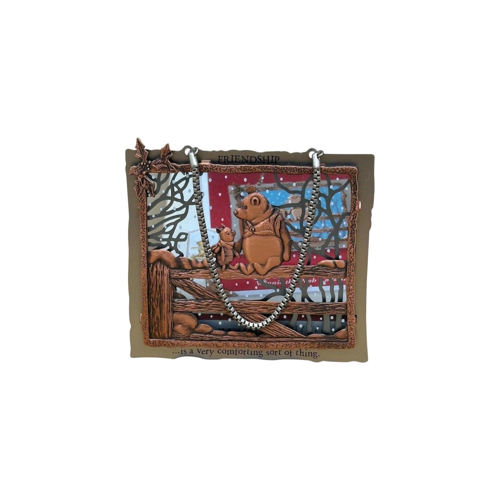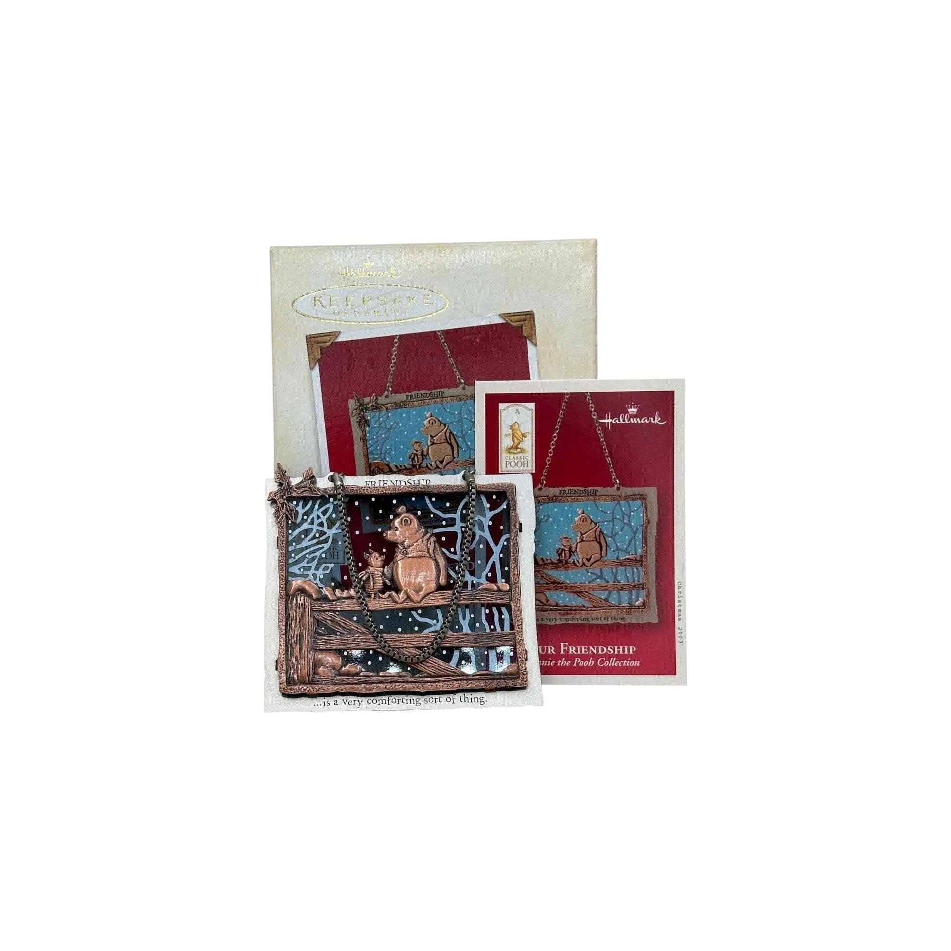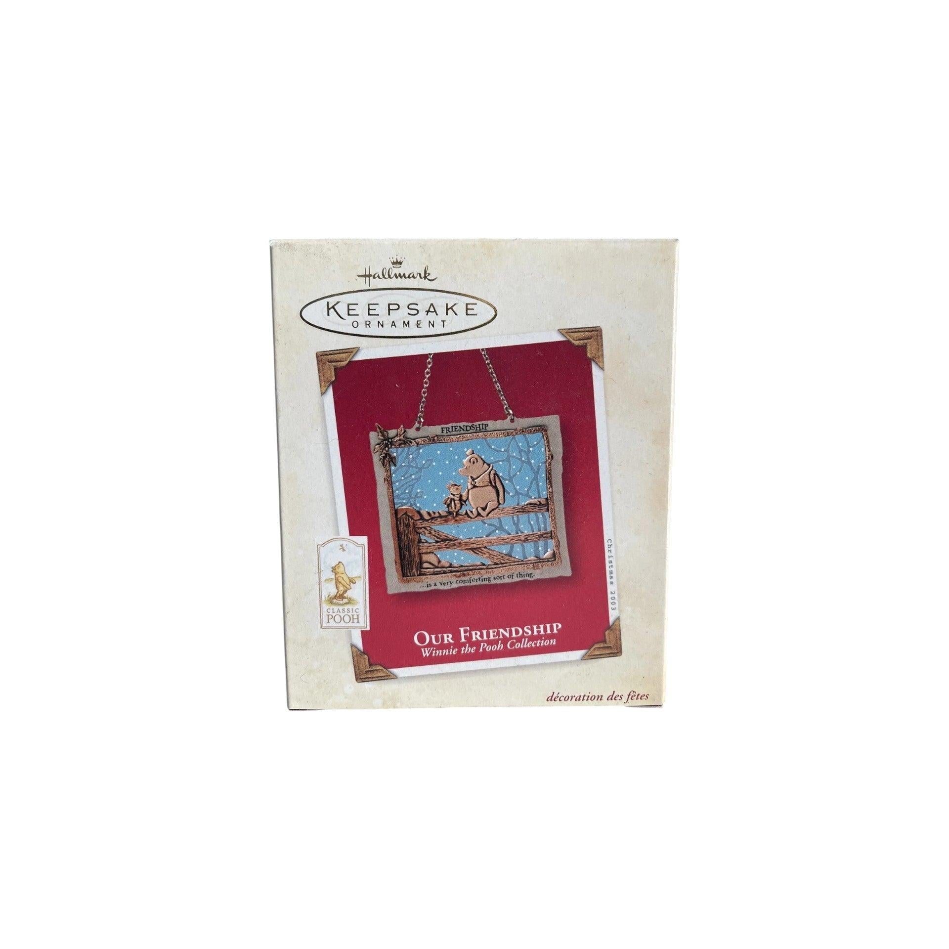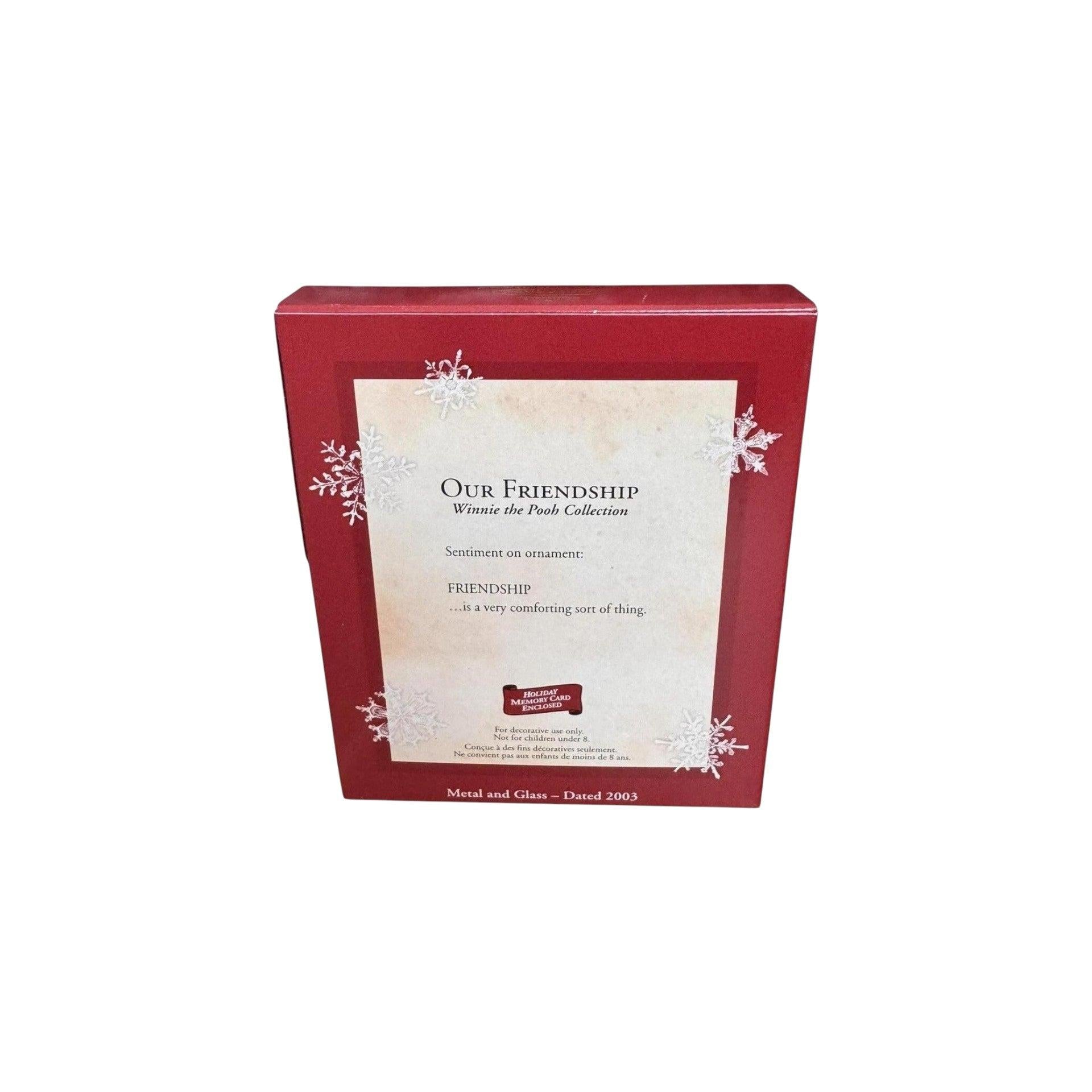 Celebrate the timeless bond between Pooh and Piglet with the 2003 Our Friendship (Winnie the Pooh) keepsake ornament. Beautifully crafted from metal and glass, this piece captures a gentle moment of connection: Pooh sits on a fence, arms open, while Piglet perches beside him in quiet companionship. The inscription “FRIENDSHIP … is a very comforting sort of thing” adds heartfelt meaning to the design.