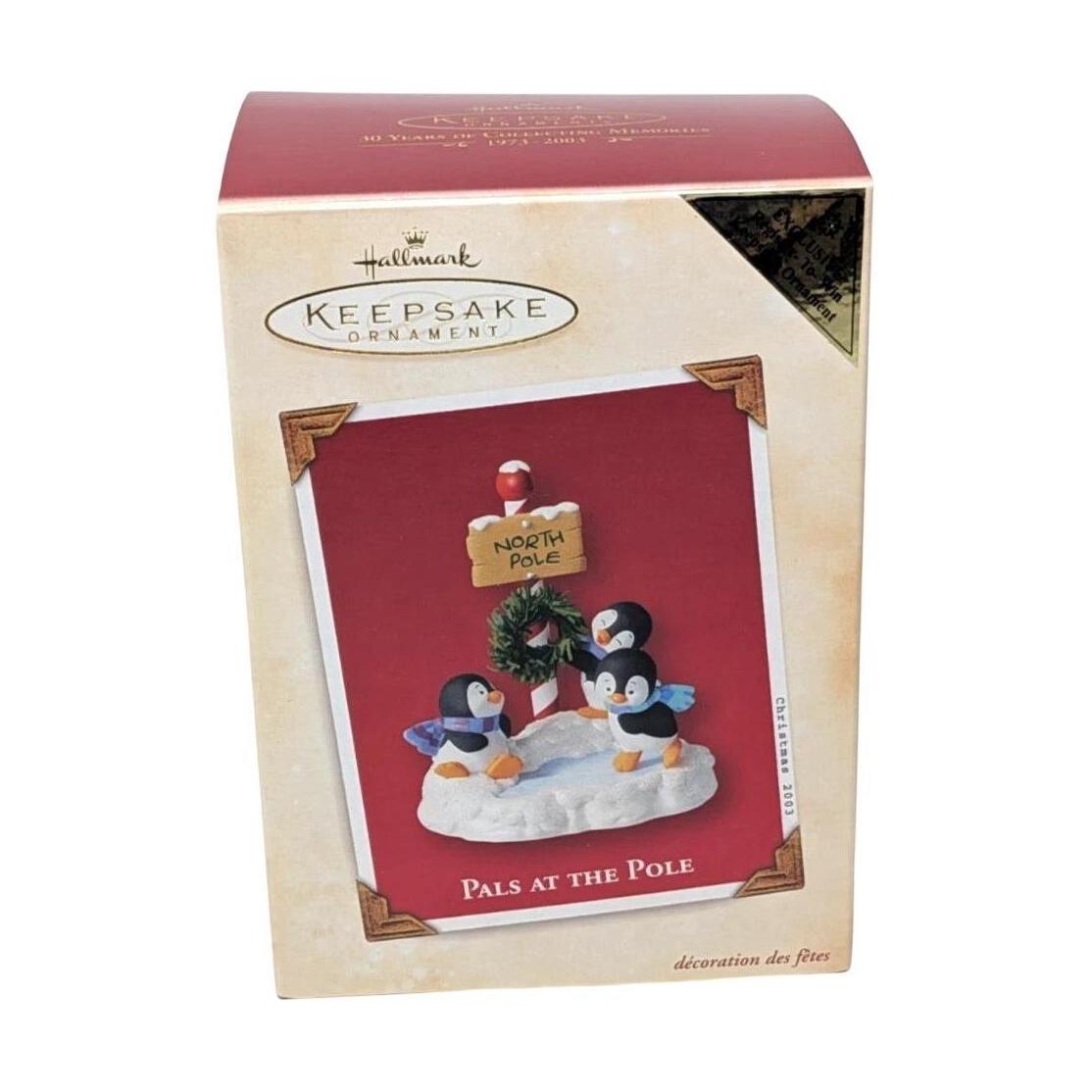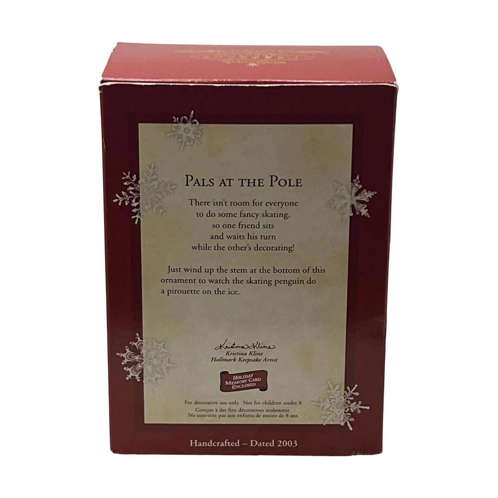 Bring a delightful wintry scene to your holiday décor with 2003 Pals at the Pole, the third and beloved wind-up “magic” ornament in Hallmark’s unofficial Kris’ Penguins collection. Designed by Kristina Kline Gaughran, this charming clip-on ornament depicts three penguin friends decorating a North Pole sign with a wreath as one of them pirouettes gracefully on the ice. Just wind the stem at the bottom, and watch the skating penguin spin—no batteries required. It arrives Mint-in-Box and offers both playful motion and nostalgic charm.
