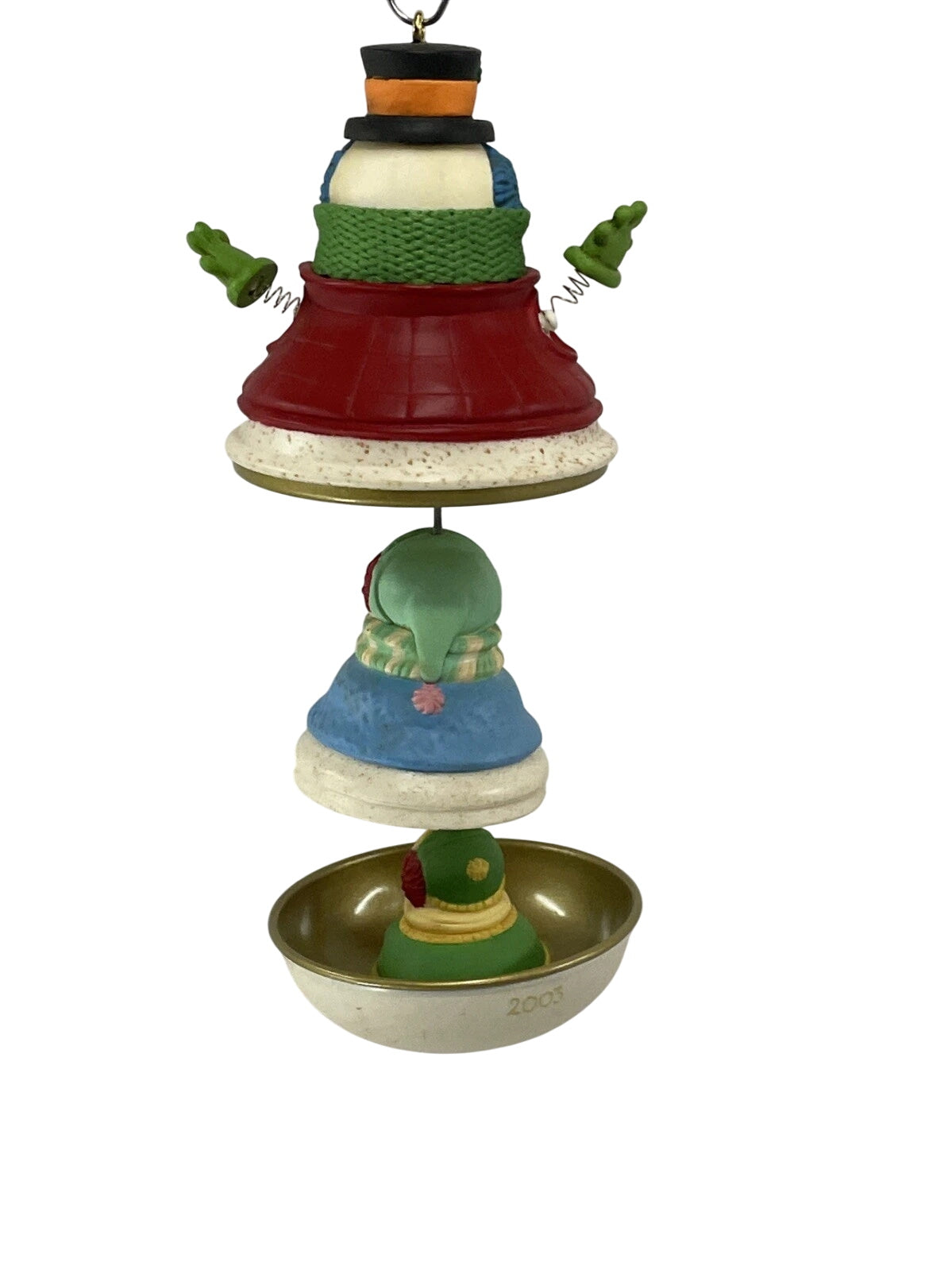 This playful 2003 edition from Hallmark features a snowman made of tin with spring-arms. The outer snowman opens to reveal two smaller snow-people inside, creating a fun “surprise” effect. Measuring approximately 5.588″ H × 2.586″ W × 2.233″ D, it’s a bold fit for a tree or display and makes a cheerful statement for snowman collectors and whimsical holiday décor.