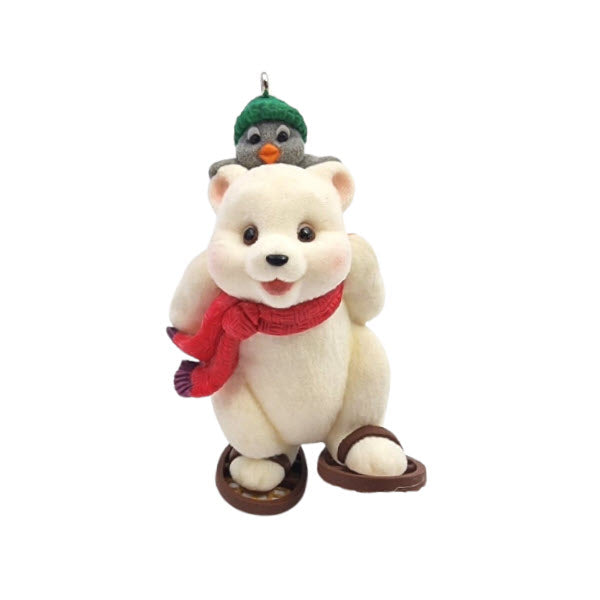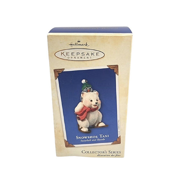 Take a festive winter ride with the 2003 Snowshoe Taxi (Snowball and Tuxedo) ornament. This delightful third installment in the Snowball and Tuxedo series depicts Snowball the polar bear wearing snowshoes, giving Tuxedo the penguin a piggy-back ride—complete with a cozy scarf and a joyful call of “Mush!” Crafted by artist Joanne Eschrich, the flocked resin keepsake includes the original Hallmark box and memory card/tag. Standing approximately 3¼" tall, it requires no batteries, cords, or lights—just hang and enjoy the snowy adventure