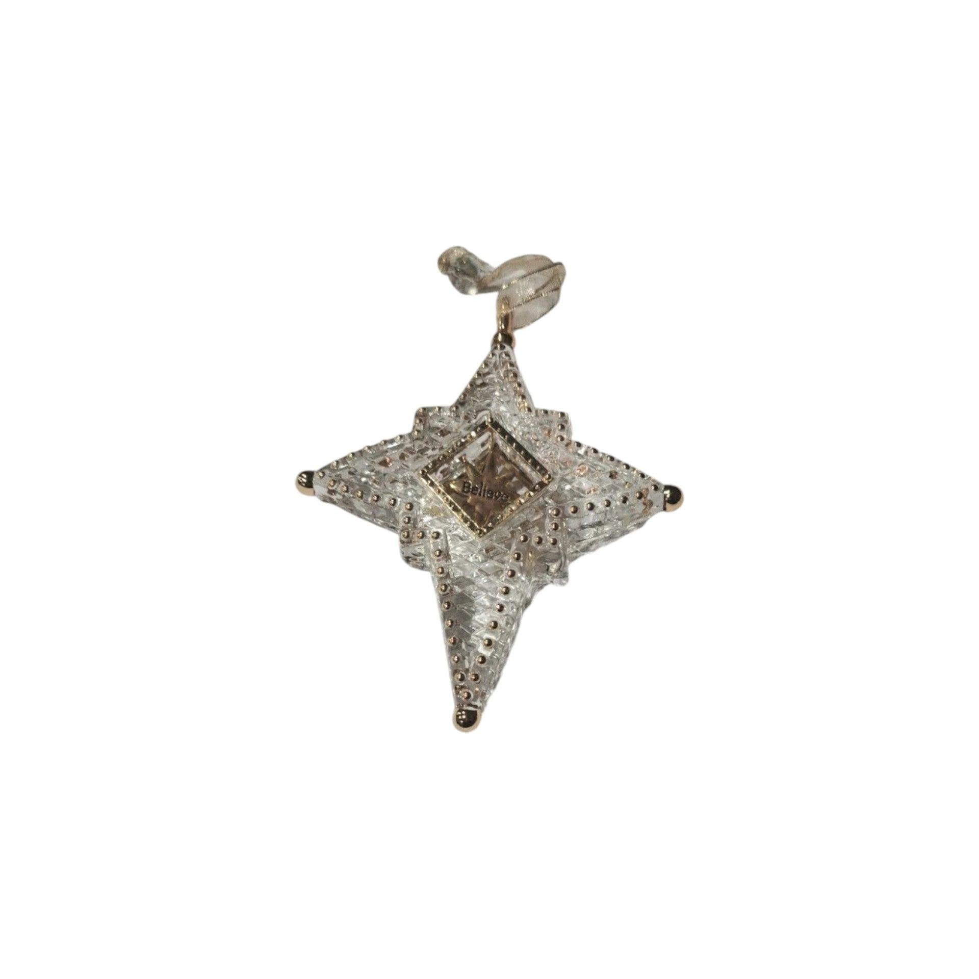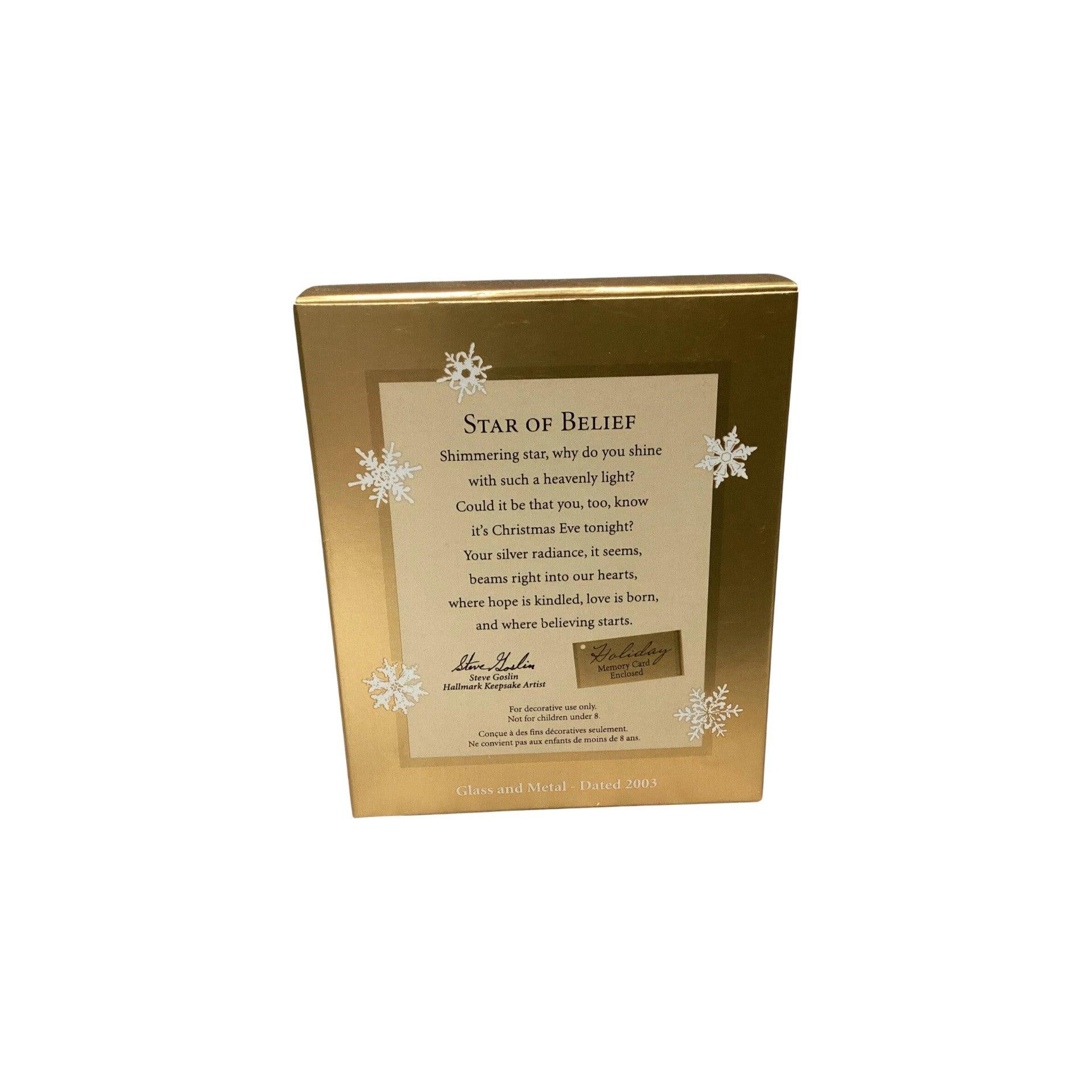 This elegant ornament features a shimmering clear-glass star design accented with gold metal detailing, centered around the word “Believe” prominently displayed at its heart. Created as a Club edition by Hallmark, it blends transparent and gilded materials for a luminous holiday look. The ornament’s club‐exclusive status and tasteful craftsmanship make it a desirable piece for collectors and celebrants alike. With its timeless theme of belief and faith in the holiday season, this 2003 Keepsake stands out as both decor and collectible. Mounted at approximately 4″ high, it’s ideal for tree-tops, mantel displays, or a special collector’s shelf.